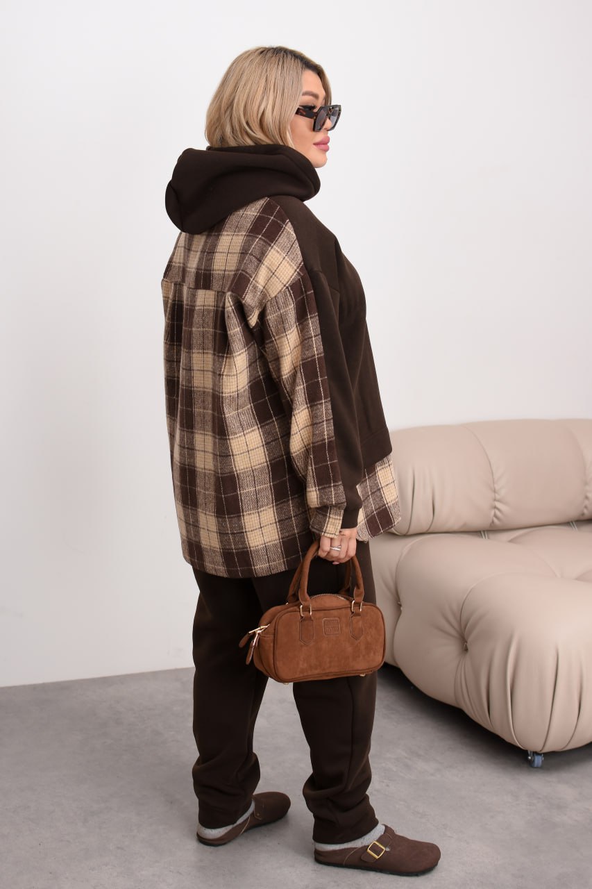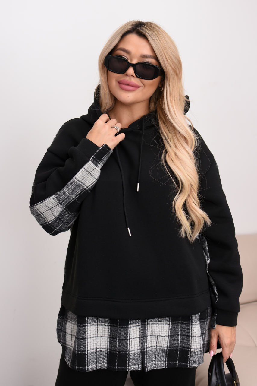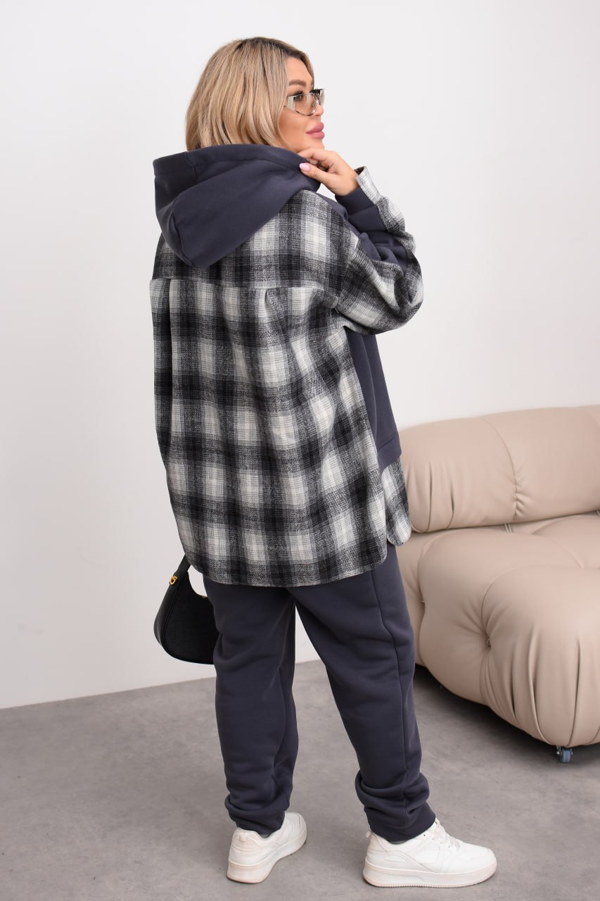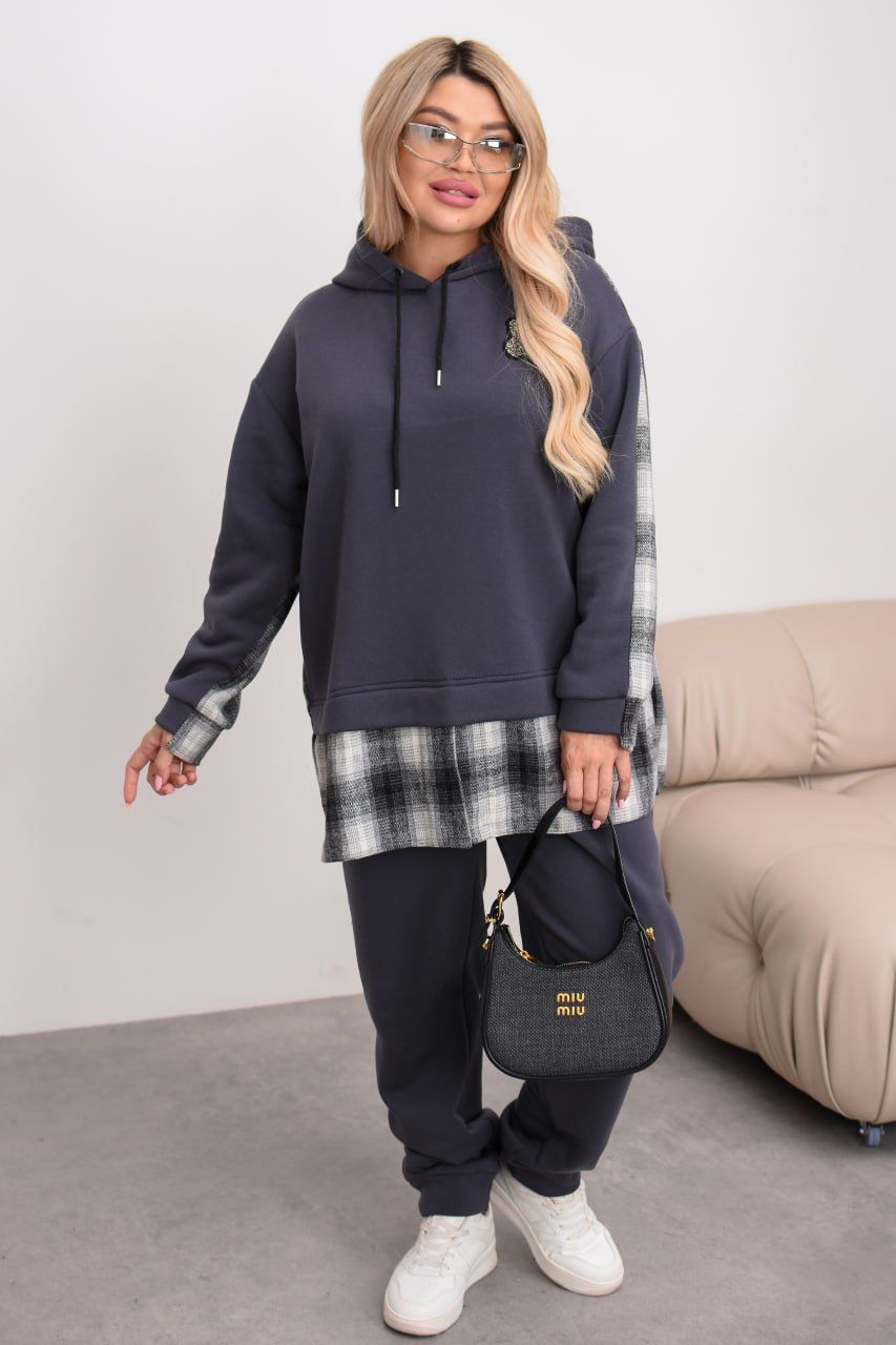 Комбінований теплий костюм із тринитки на флісі та байки в клітинку: штани середньої посадки на резинці з кишенями й оверсайз худі з капюшоном, розрізами з боків та трендовим декором «ведмедик». Ідеальний для затишних прогулянок та активних днів! ❄️