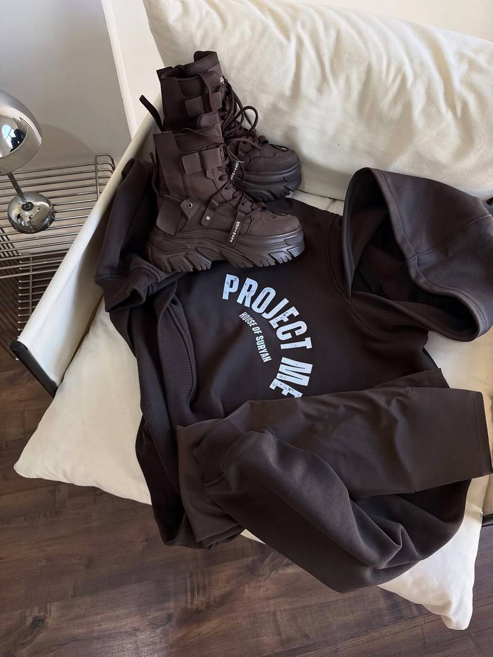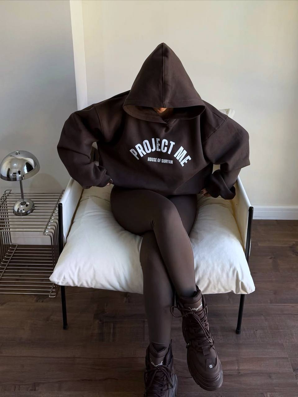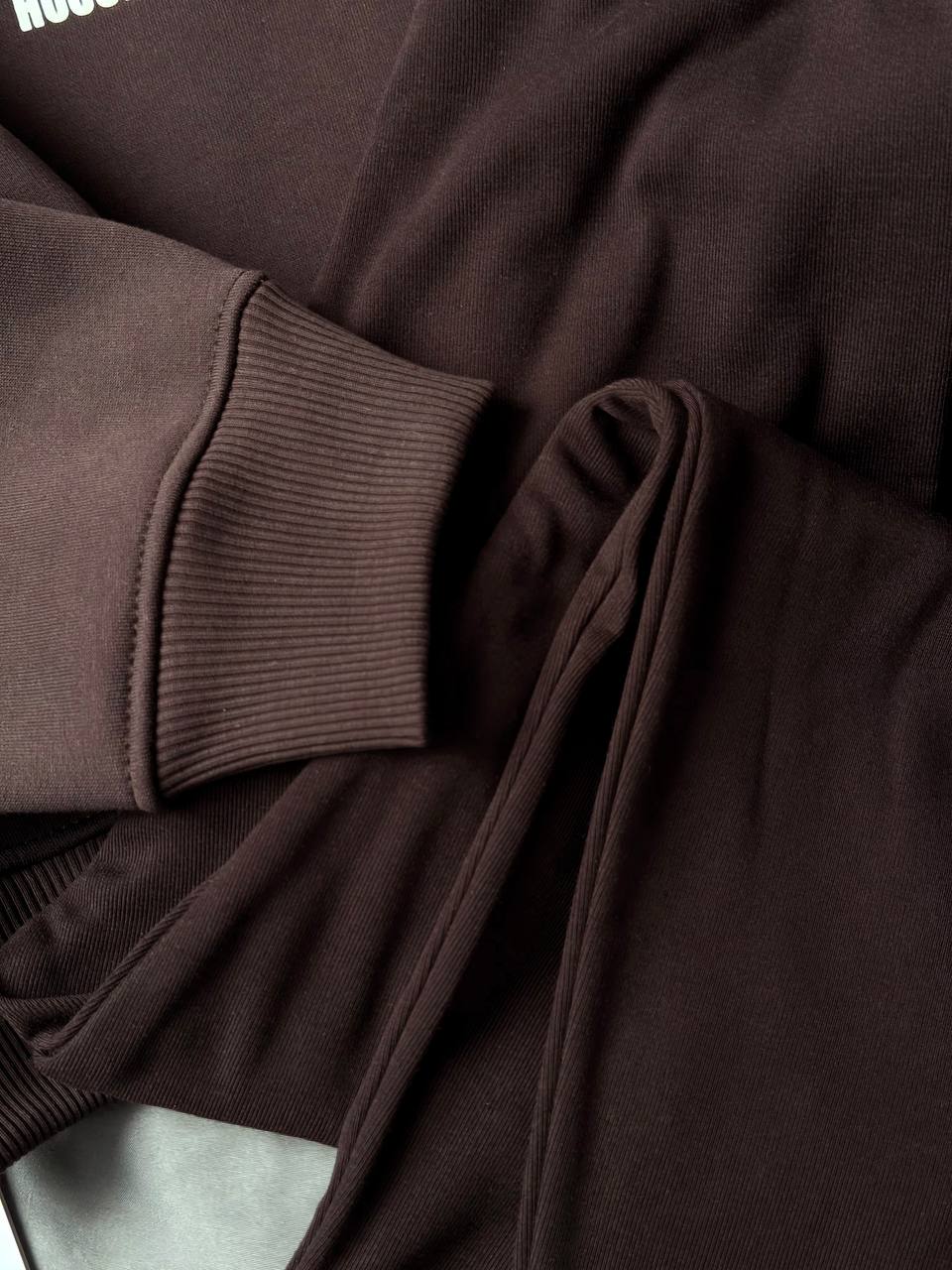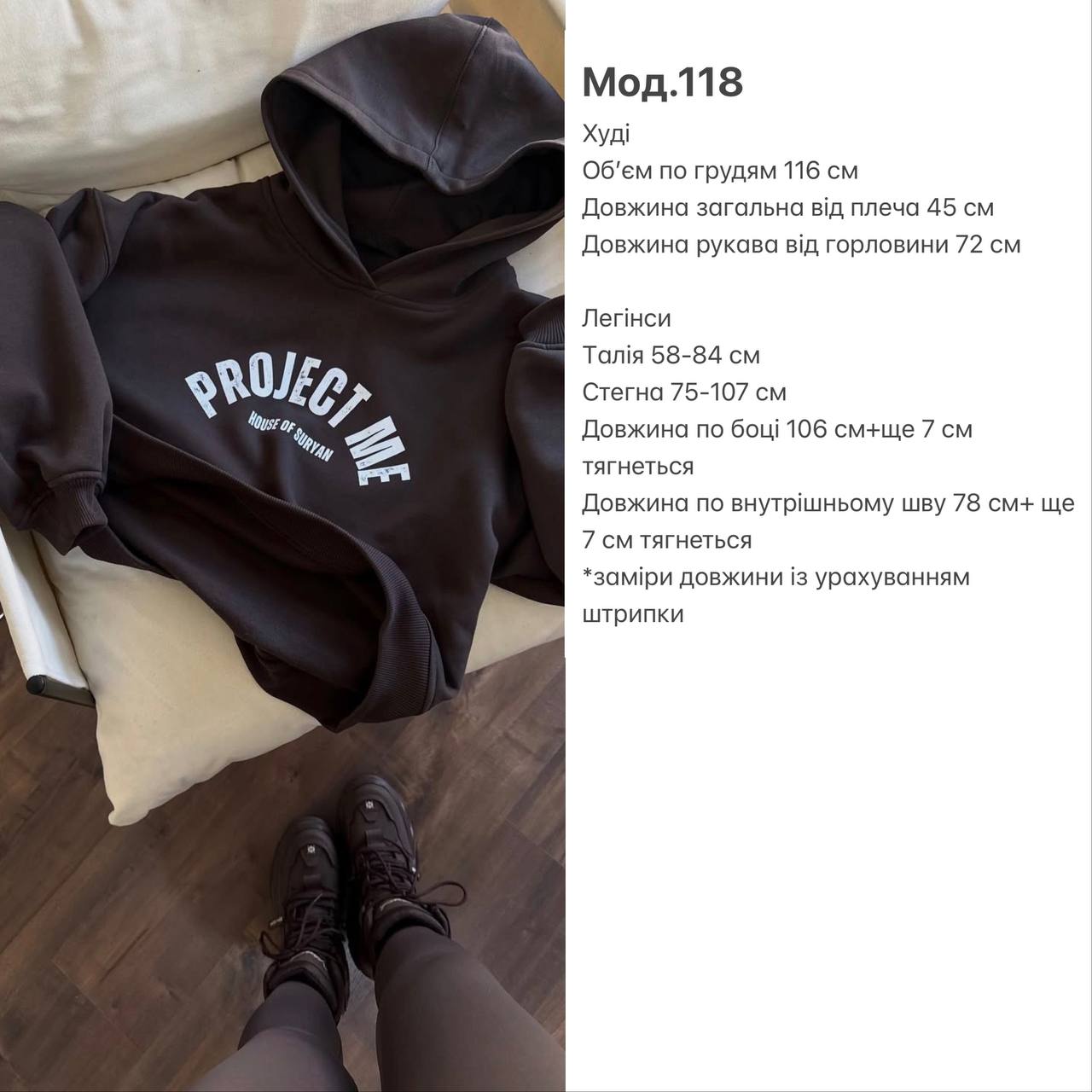 Комплект худі і лосини у глибокому шоколадному відтінку – стиль, комфорт і характер. Худі з капюшоном і трендовою накаткою створює сучасний ефектний акцент, а лосини з джерсі на віскозі з утепленням і високою посадкою ідеально сідають по фігурі завдяки штрипкам знизу.