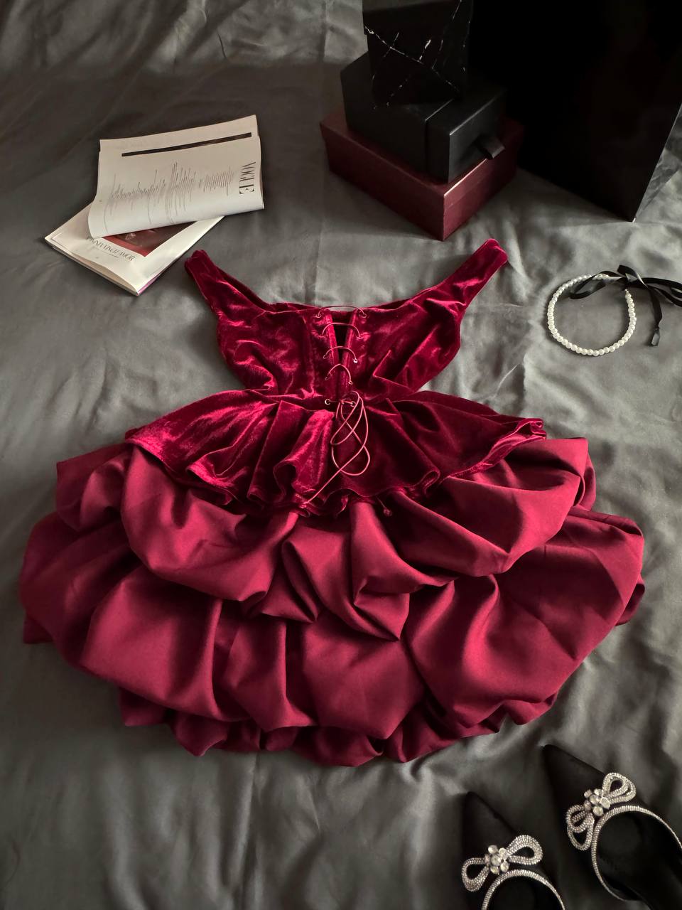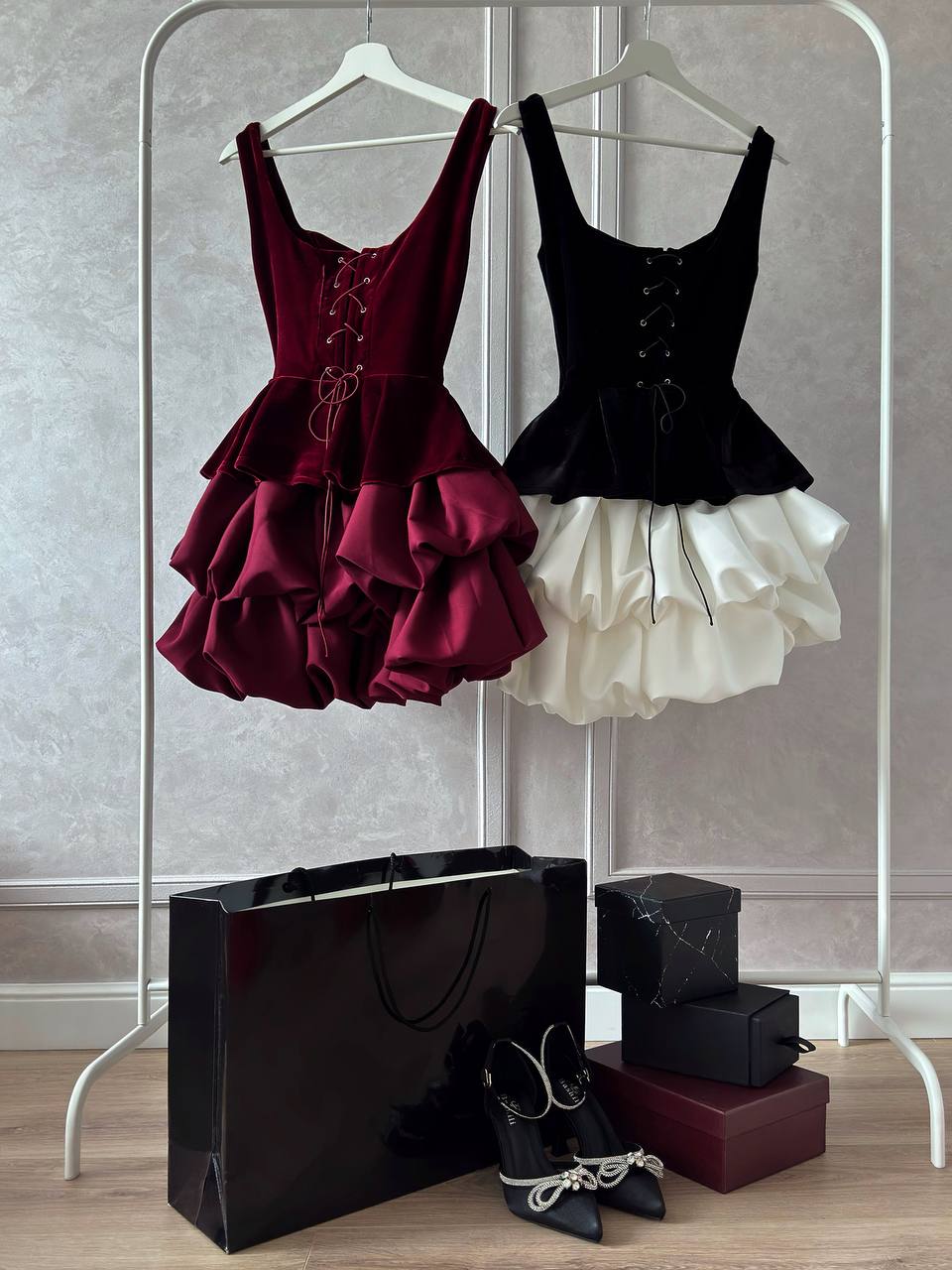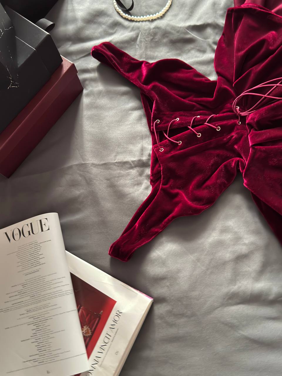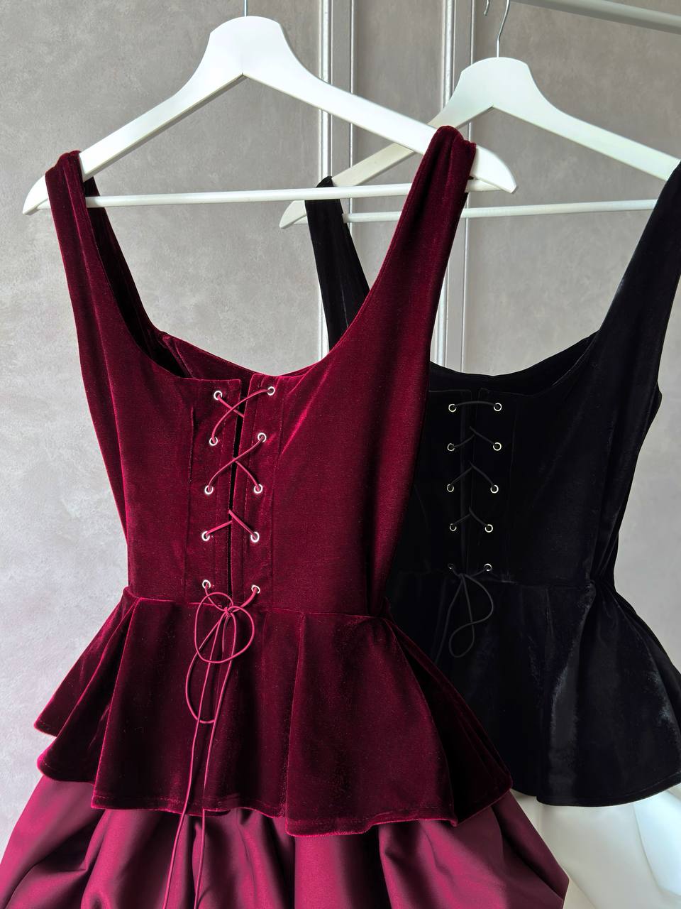 Гармонійний та ефектний комплект, у який неможливо не закохатись Оксамитовий корсет з баскою красиво підкреслює фігуру, має глибоке декольте, укріплене регеліном, та м’яку підкладку з основної тканини.Ззаду – шнурівка, що дозволяє ідеально відрегулювати корсет по фігурі.