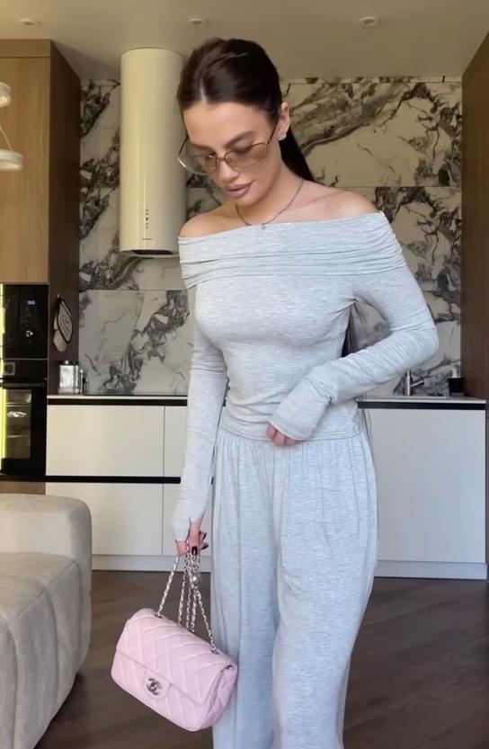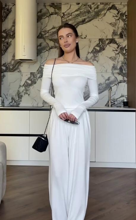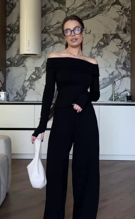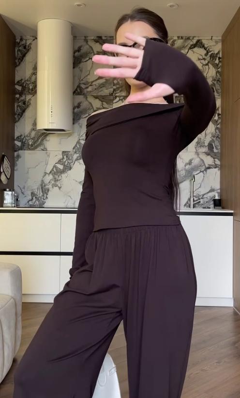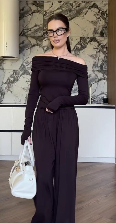 Трендовий костюм палаццо з мʼякої натуральної тканини: лонгслів з відкритими плечима, з розрізами для пальчиків + довгі широкі штани палаццо.