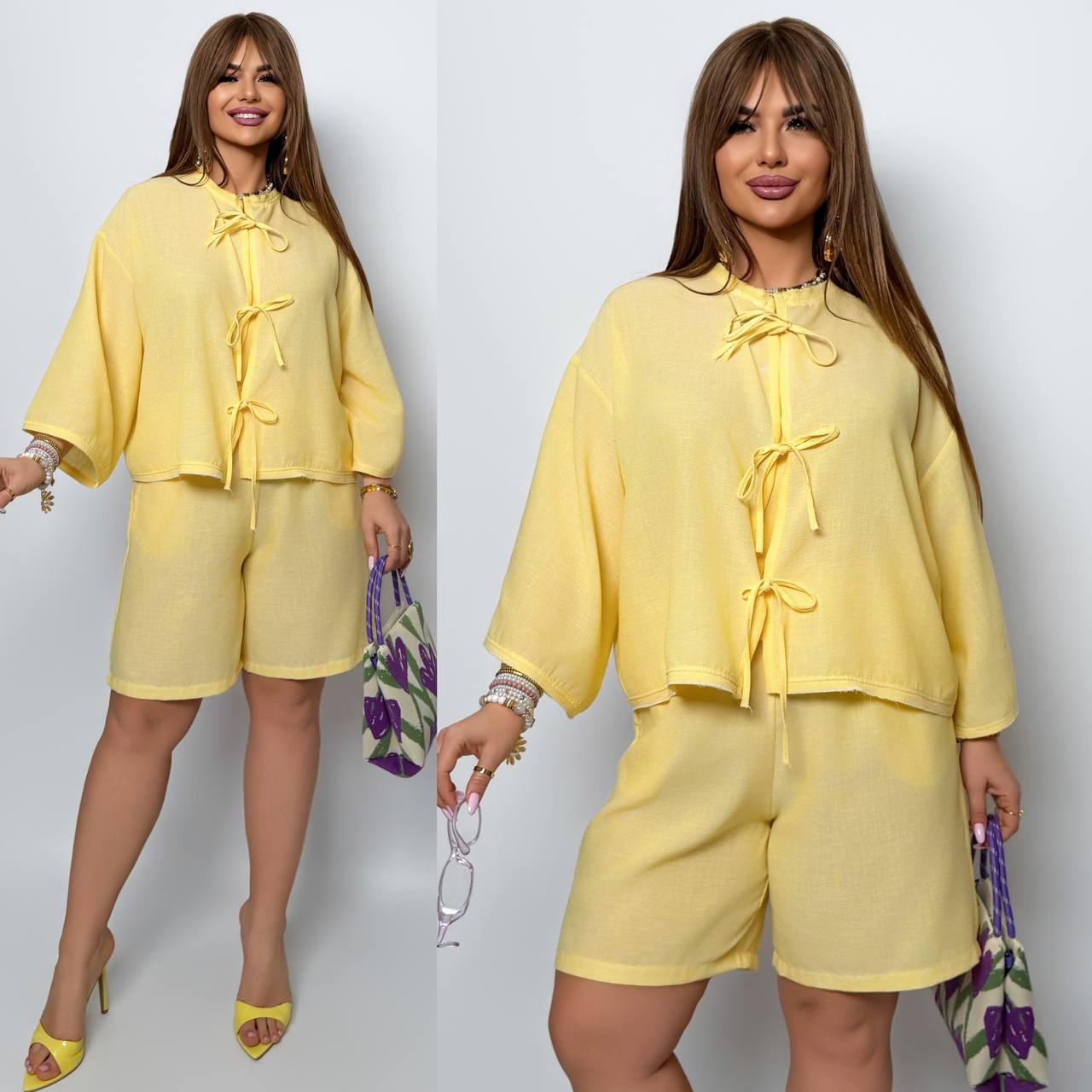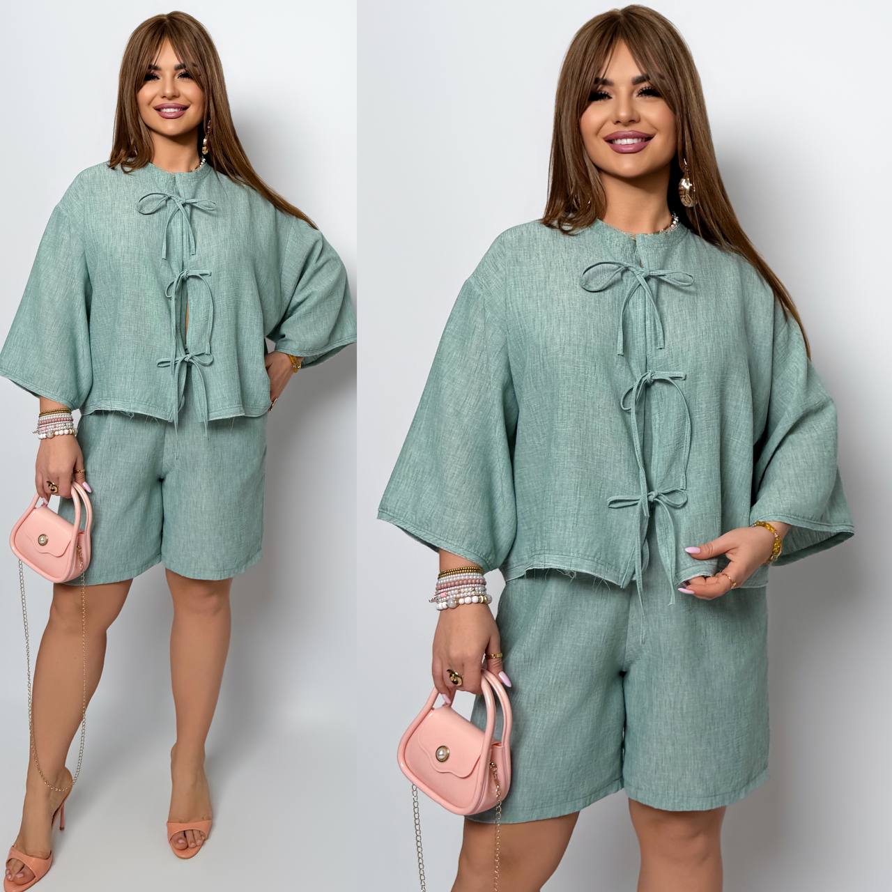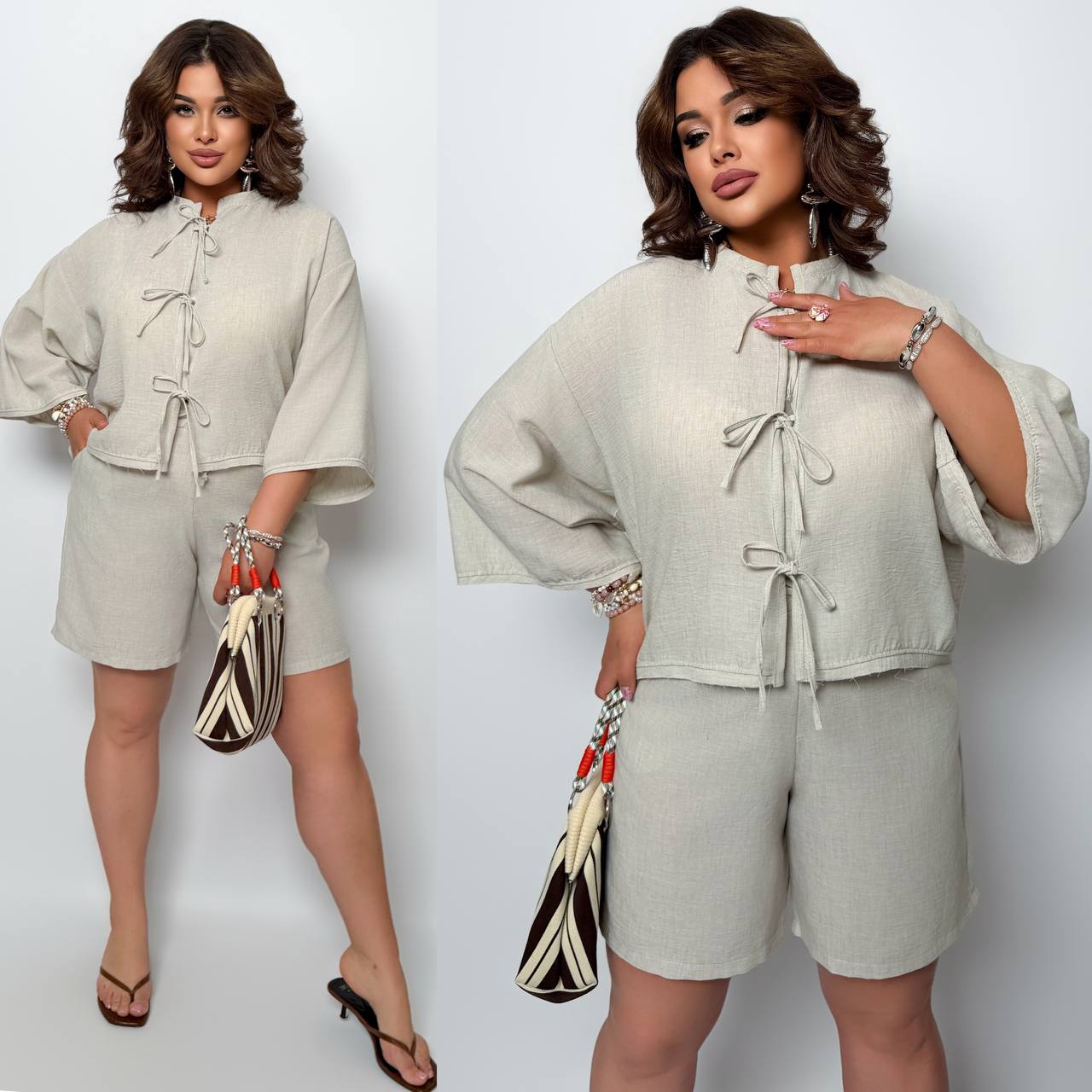 ( Костюм із літнього льону-меланж в азіатському стилі: вільна сорочка-кімоно у стилі oversize на завʼязках зі спущеними рукавами + шорти з кишенями у бічних швах з посадкою вище середнього на еластичній гумці та куліскою на поясі ).