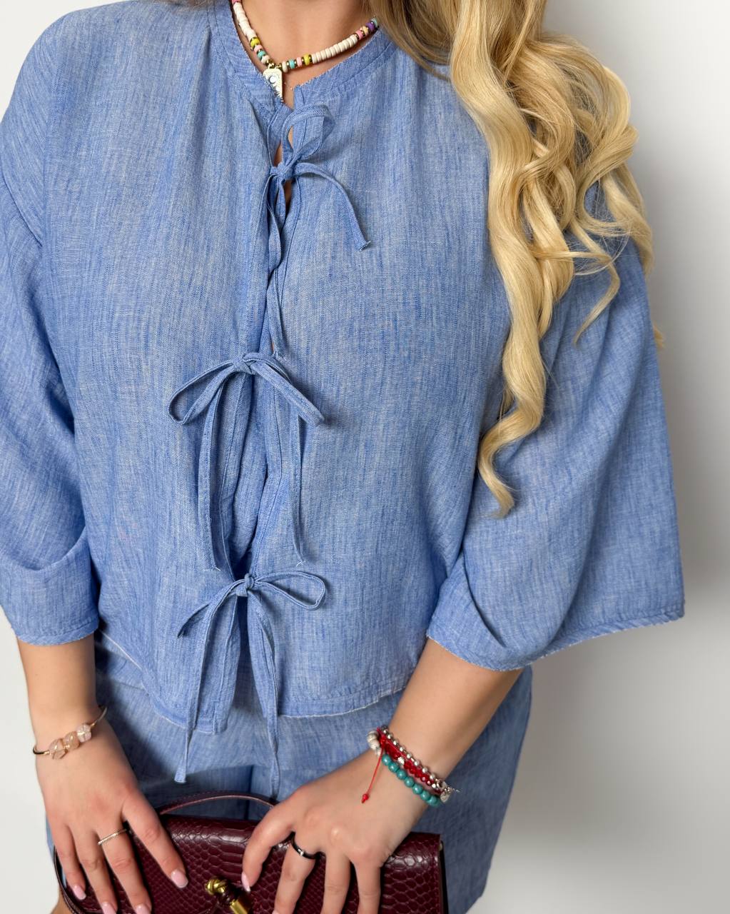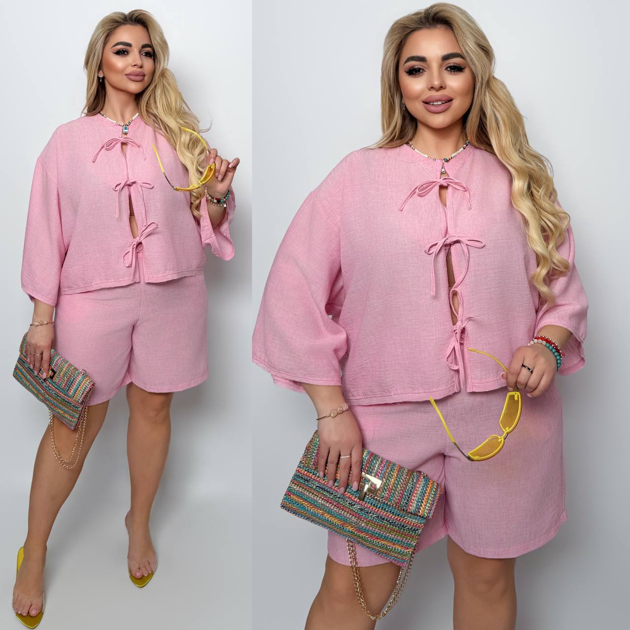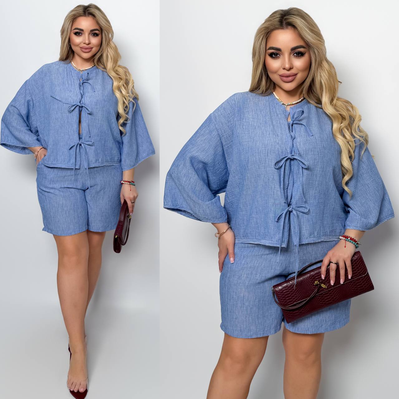 ( Костюм із літнього льону-меланж в азіатському стилі: вільна сорочка-кімоно у стилі oversize на завʼязках зі спущеними рукавами + шорти з кишенями у бічних швах з посадкою вище середнього на еластичній гумці та куліскою на поясі ).
