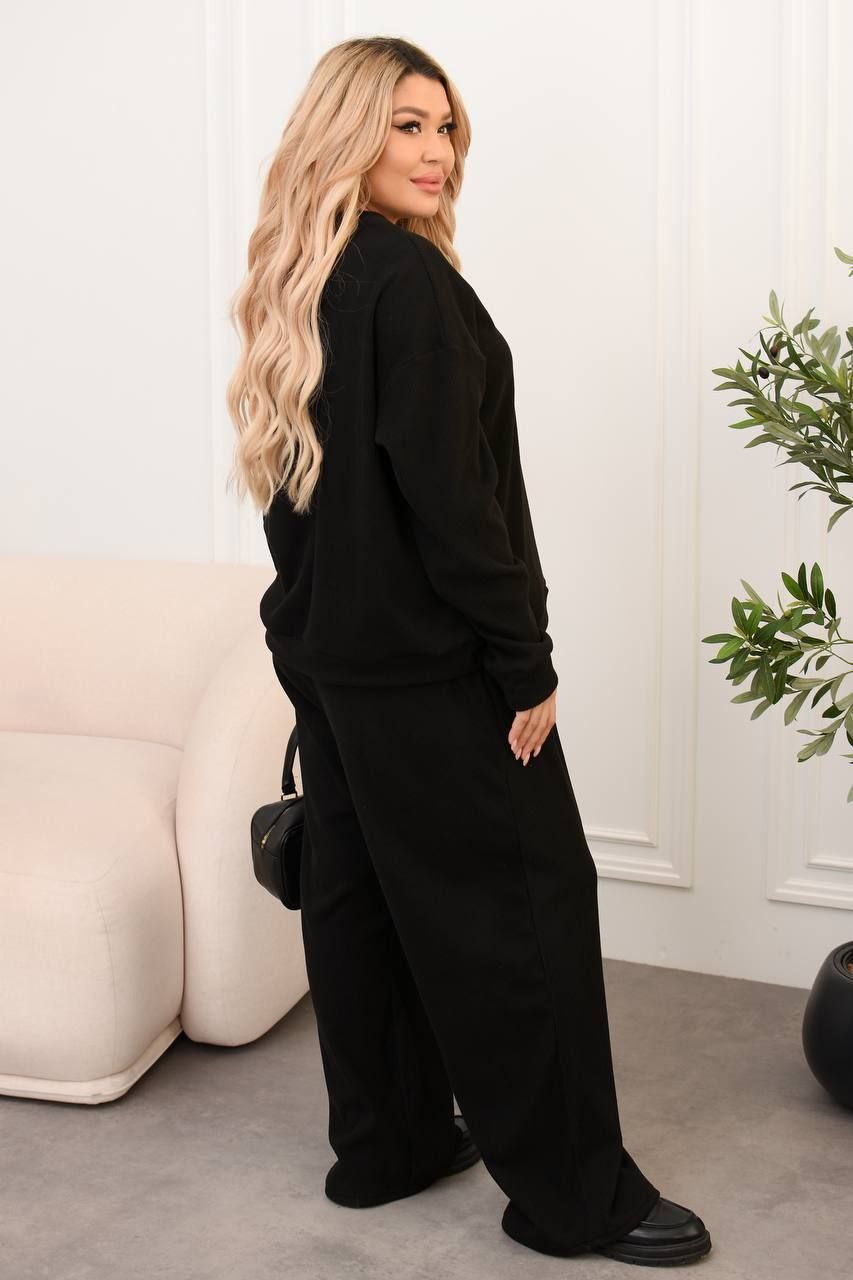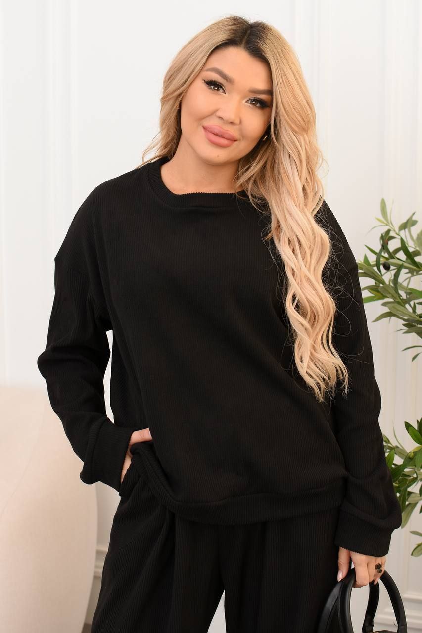 Модель № 773. Осінньо-зимовий теплий прогулянковий костюм. Кофта з довгим рукавом. Лосини приталені без кишень на поясі гумка. Тканина двостороння тепла рубчик з начосом, дуже приємна до тіла, тканина добре тягнеться. Колір: Чорний, Бежевий. Розміри 50-52, 54-56, 58-60.