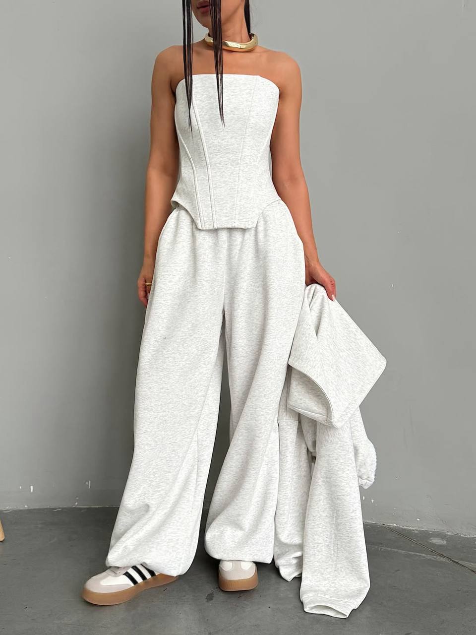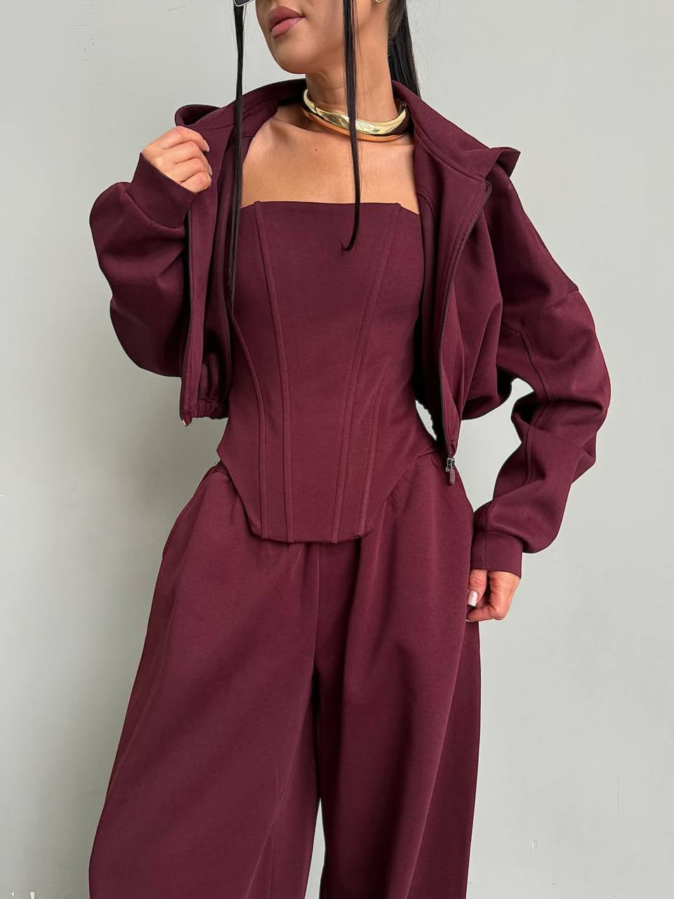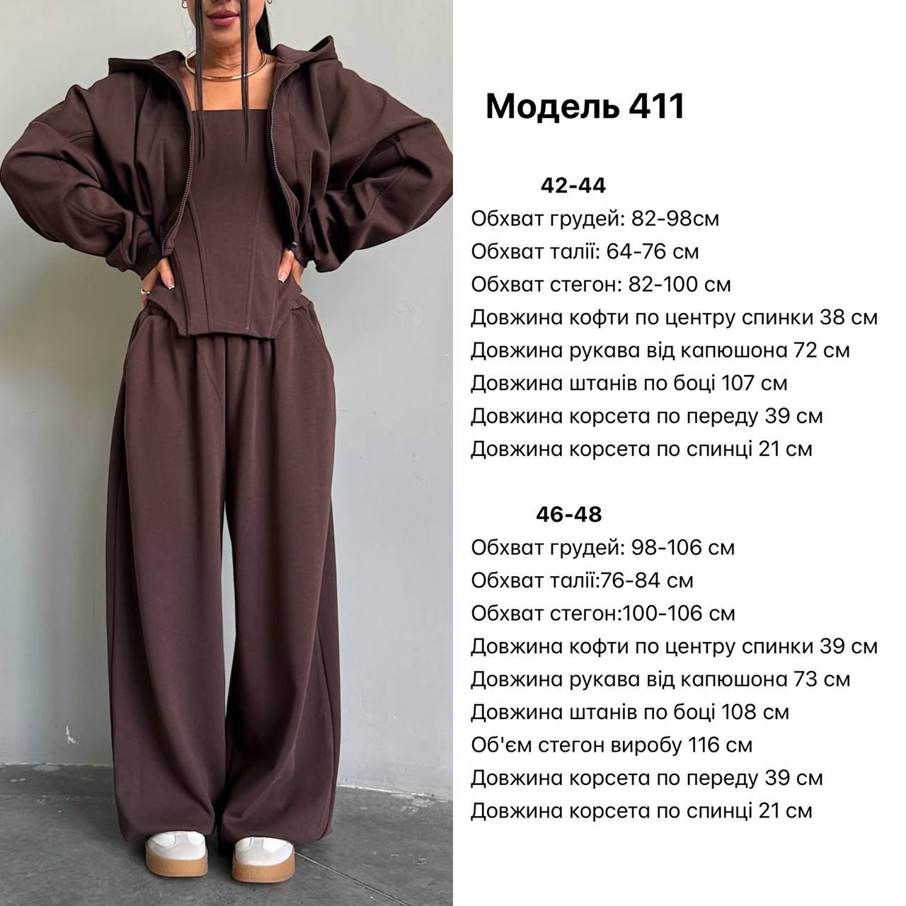 Виконаний з якісної тканини петля, яка не кошлатиться, добре тримає форму та приємна до тіла. Корсет підкреслює талію, створюючи ефектний силует, а вільні штани додають легкості та сучасного вайбу. Ідеальний баланс між жіночністю та street-style