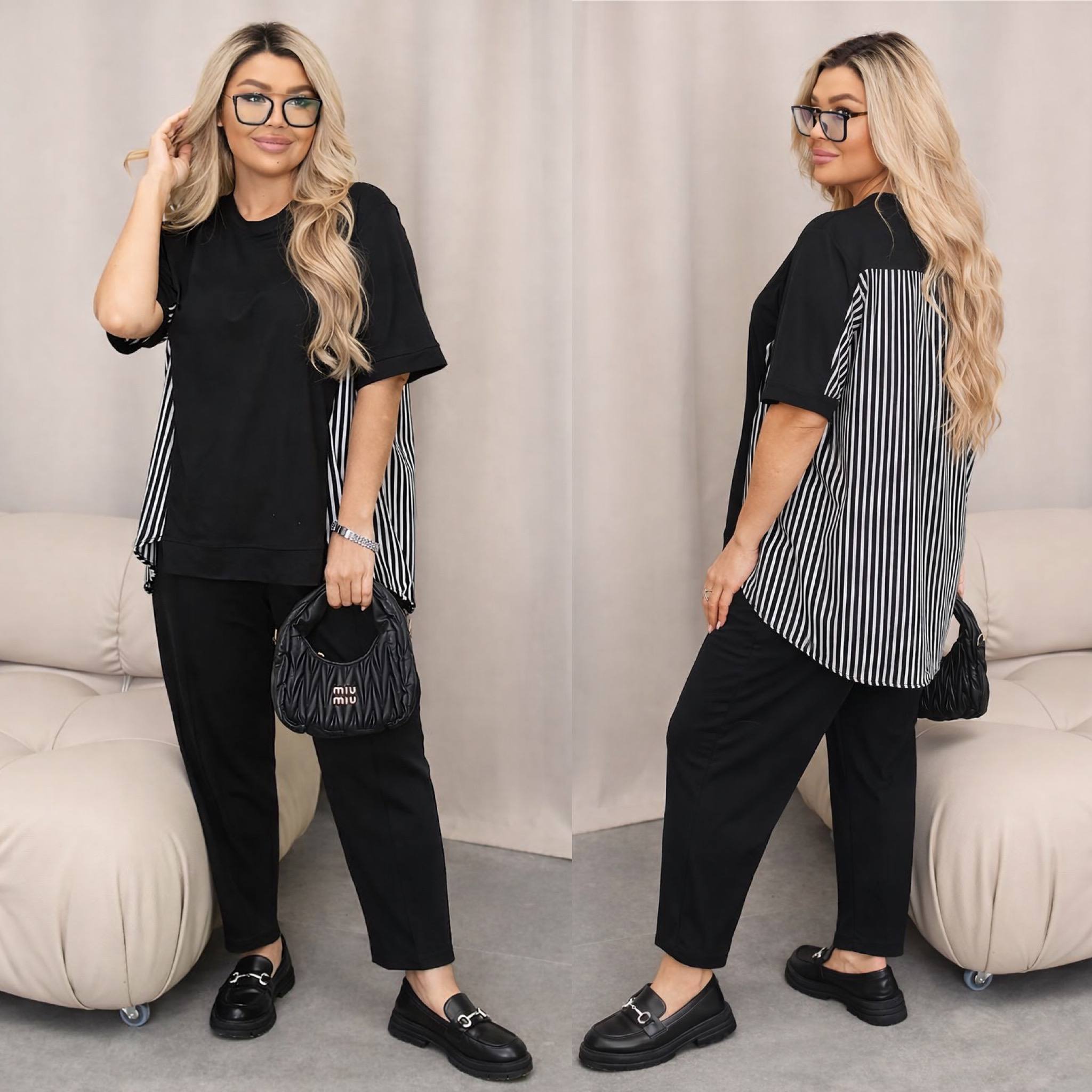 Кофта оригінального крою виконана з трикотажу з додаванням супер софта на спинці.Спинка подовжена .Штани середньої посадки на резинці.Штани з кишенями.Спереду стрілки ,які прикрашають вироб ,візуально видовжують Ваші ніжки і додають втрункості.Костюм дуже зручний і стильний.