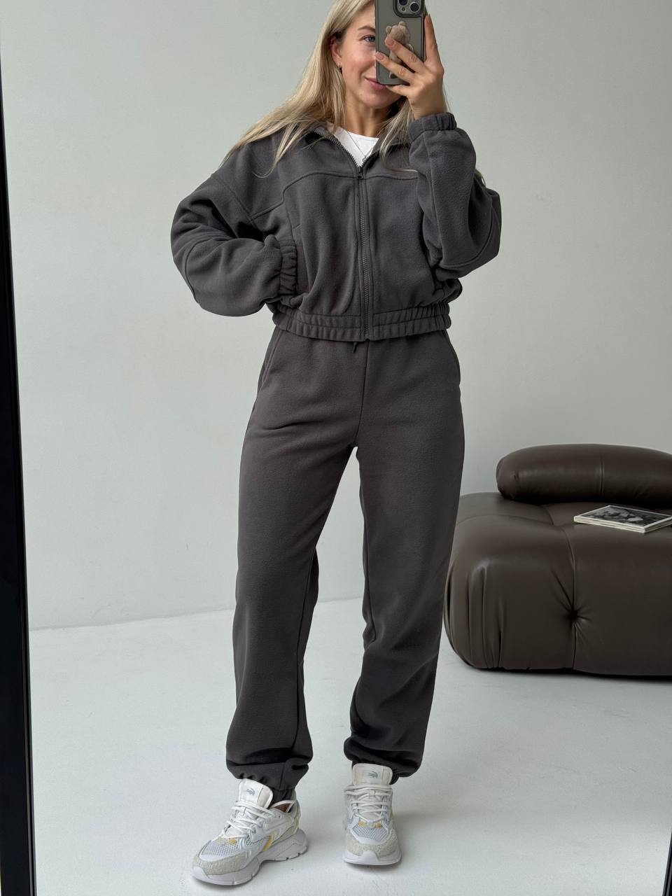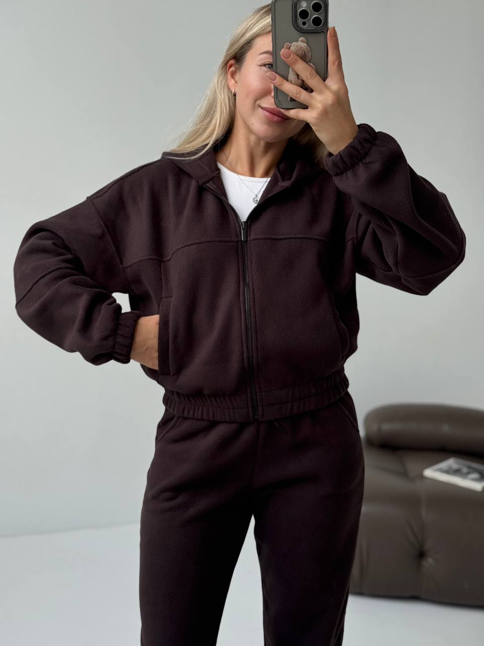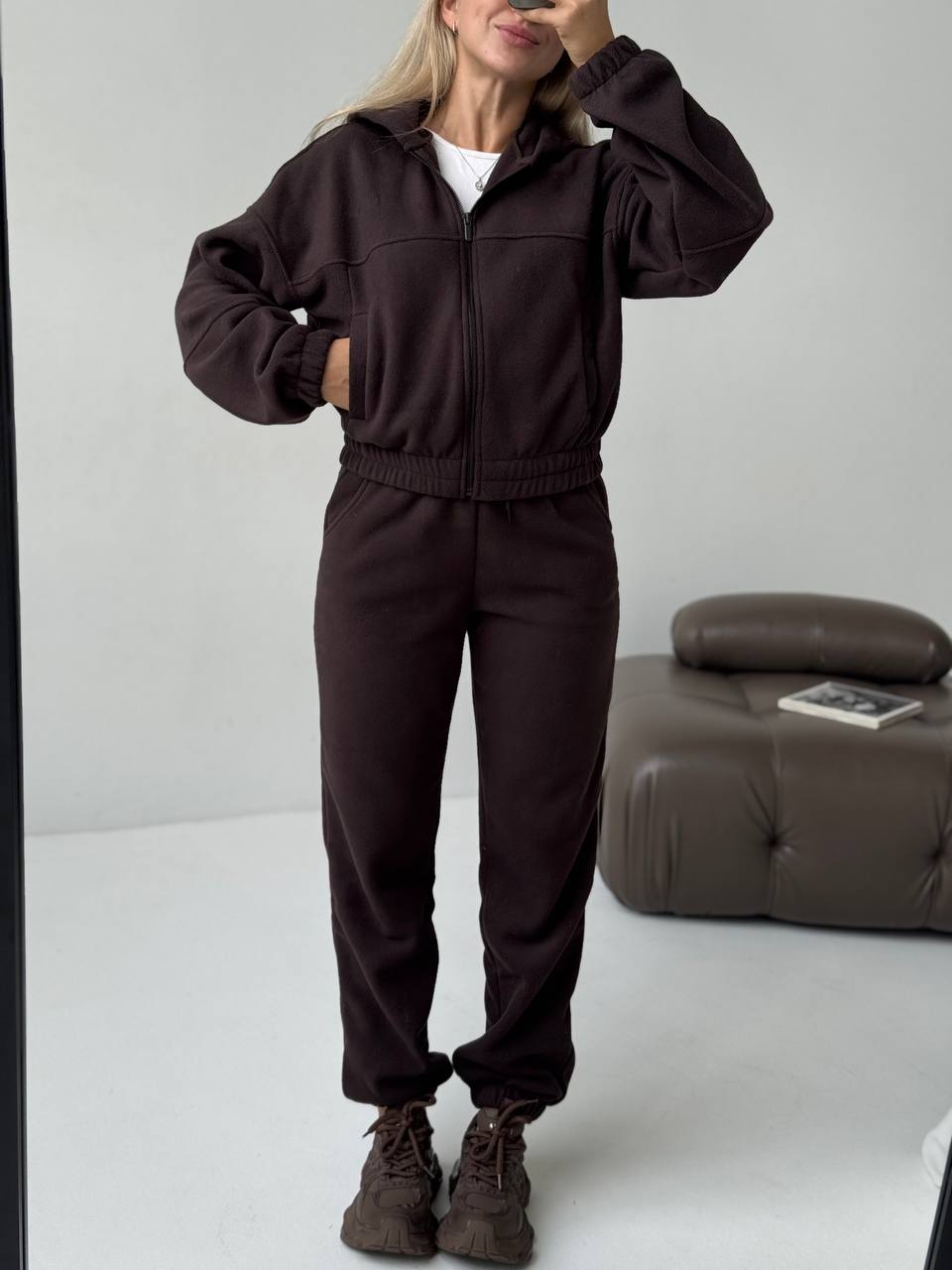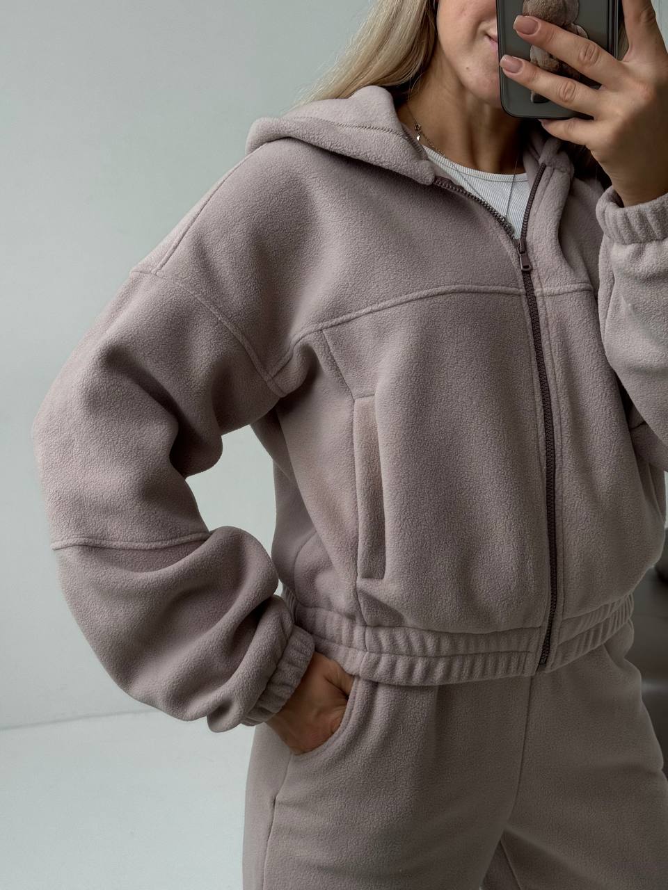 Костюм з худі на блискавці , кармани робочі , штани на високій посадці зі шнурком на талії , що дозволяє регулювати обʼєм поясу по фігурі