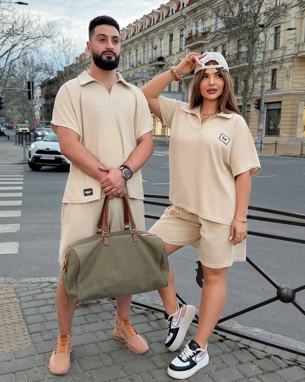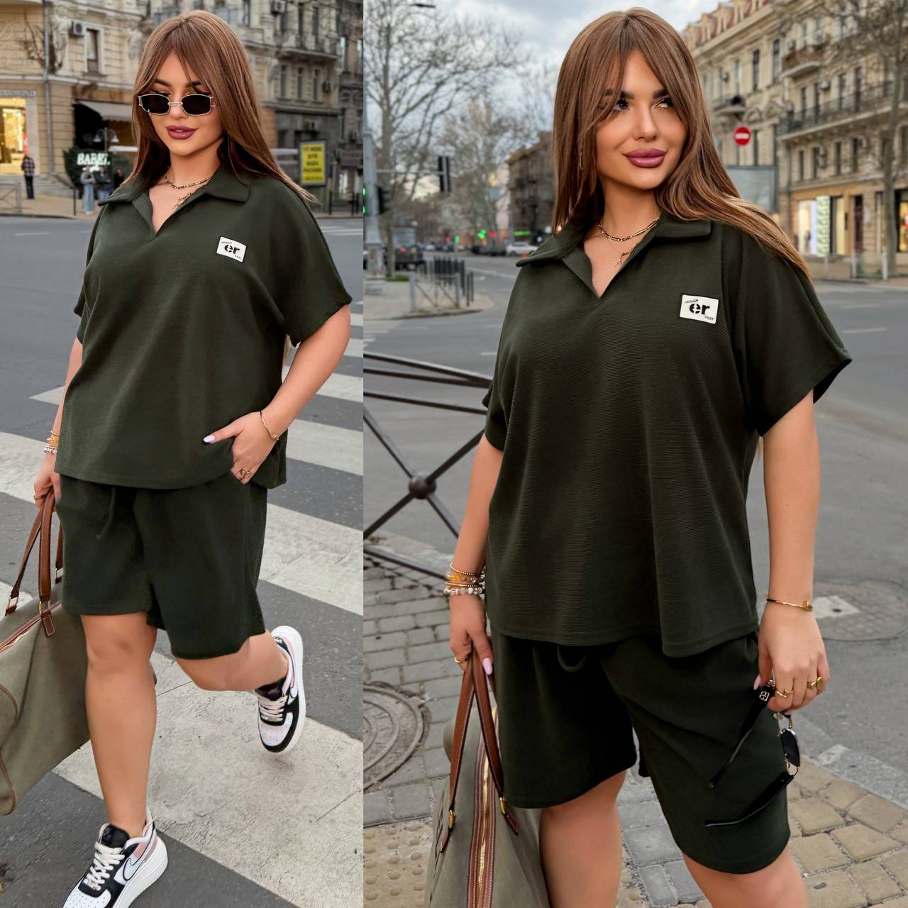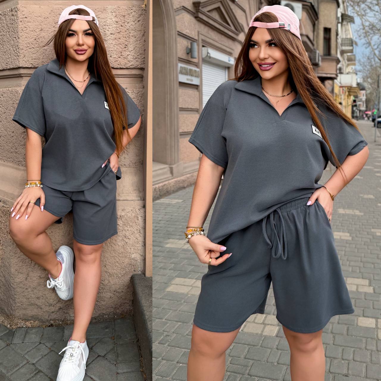 ( Стильний комфортний костюм з шортами з трикотажу еластан : футболка поло у стилі оверсайз з акс + шорти з високою посадкою з кішенями у бічних швах, з куліскою на поясі).