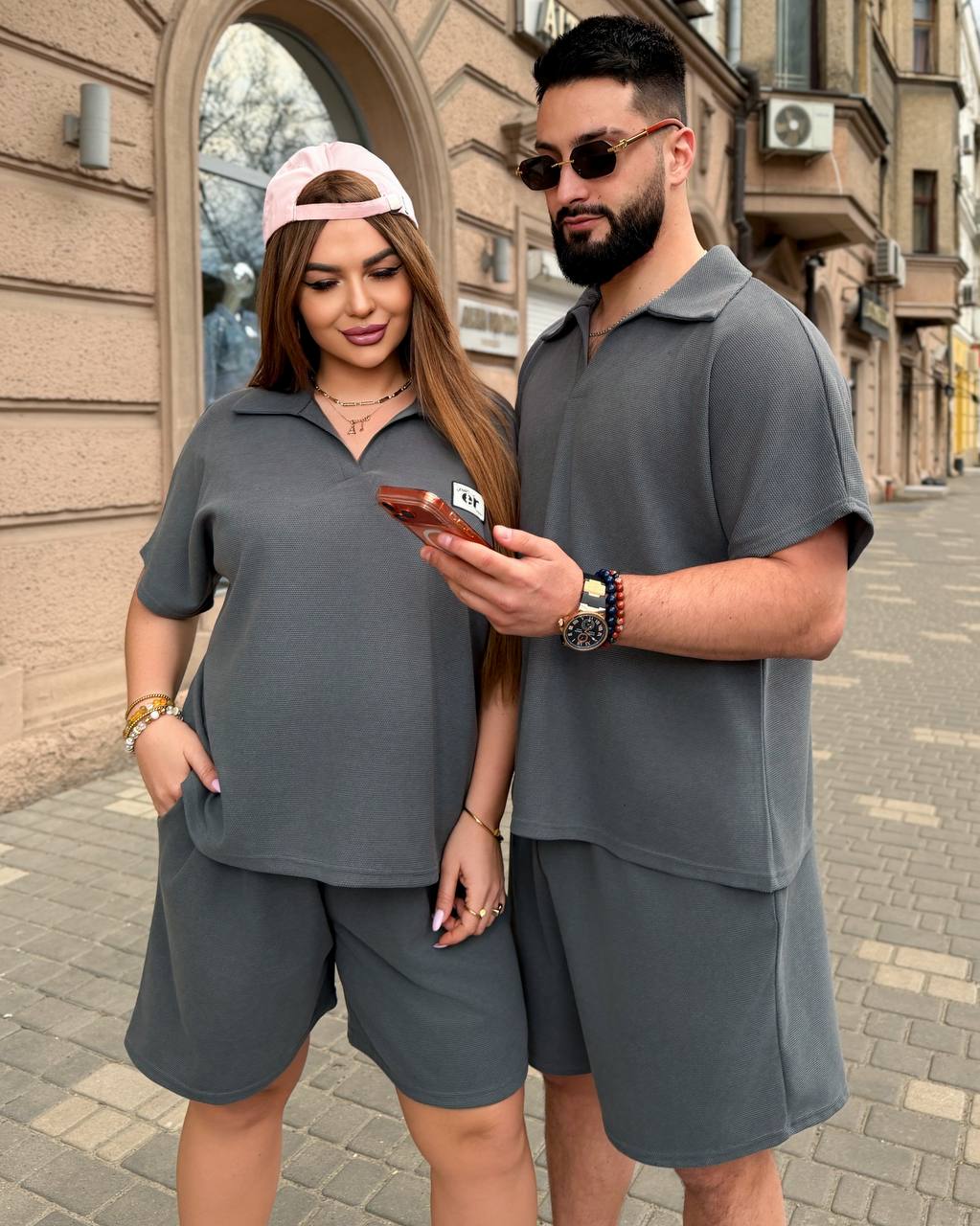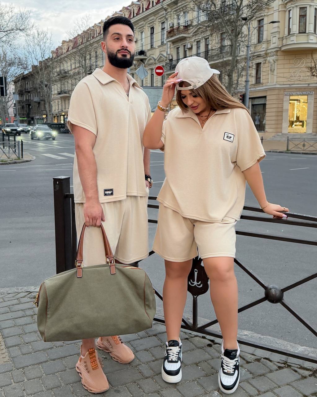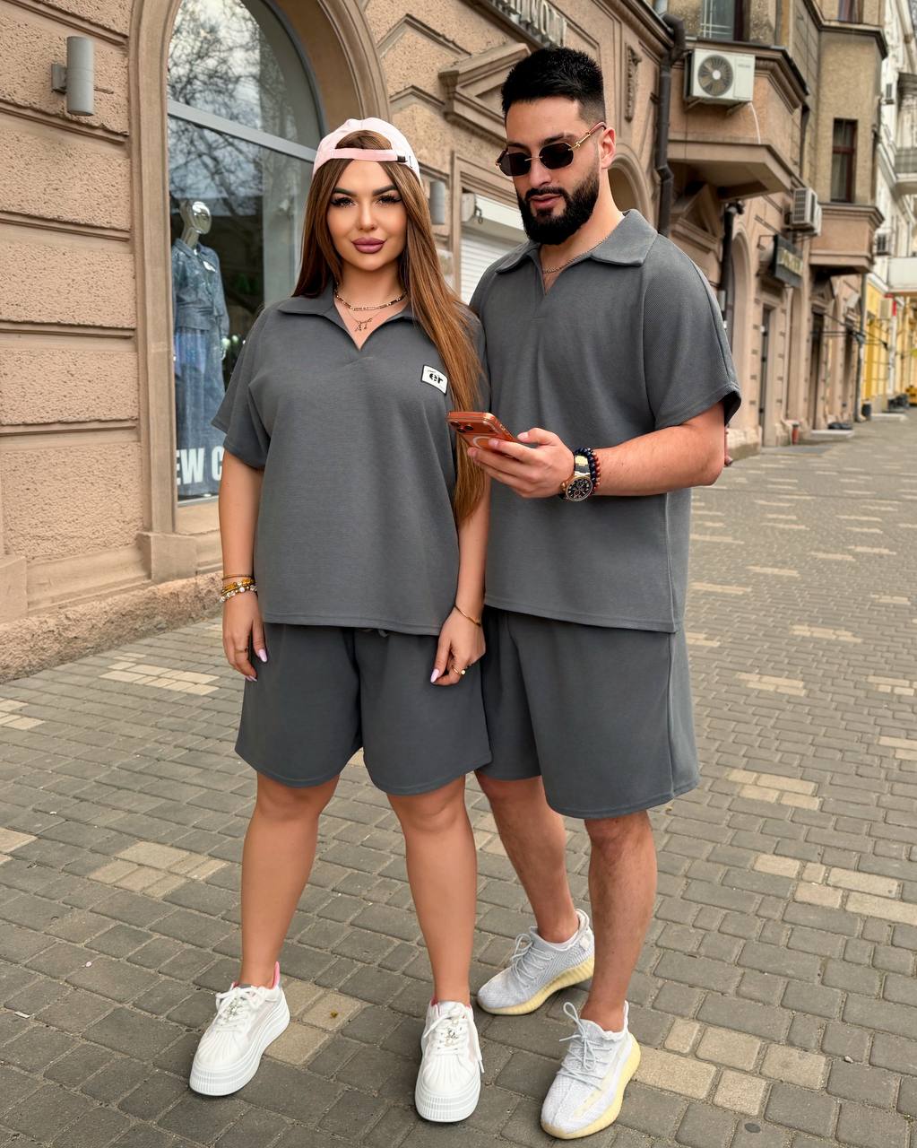 ( Стильний комфортний костюм з шортами з трикотажу еластан : футболка поло у стилі оверсайз з акс + шорти з високою посадкою з кішенями у бічних швах, з куліскою на поясі).