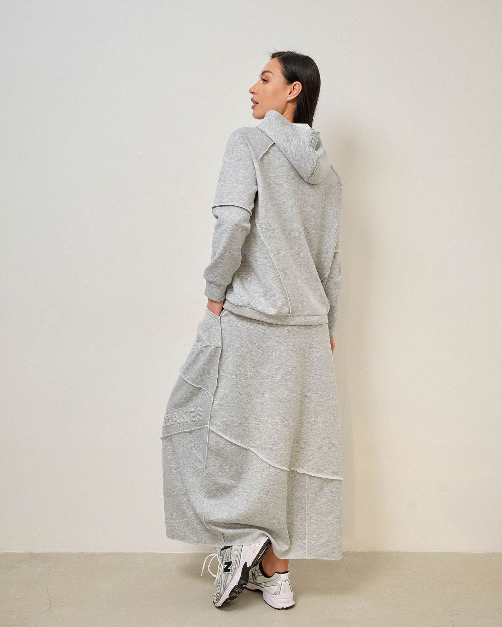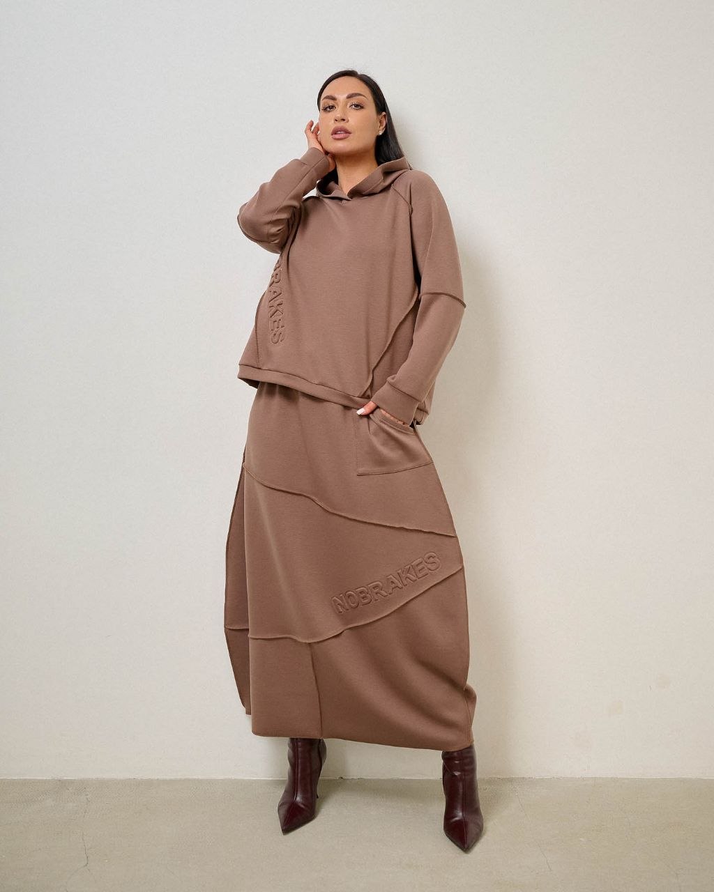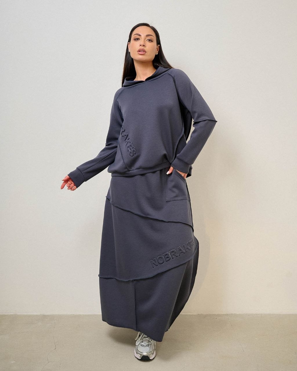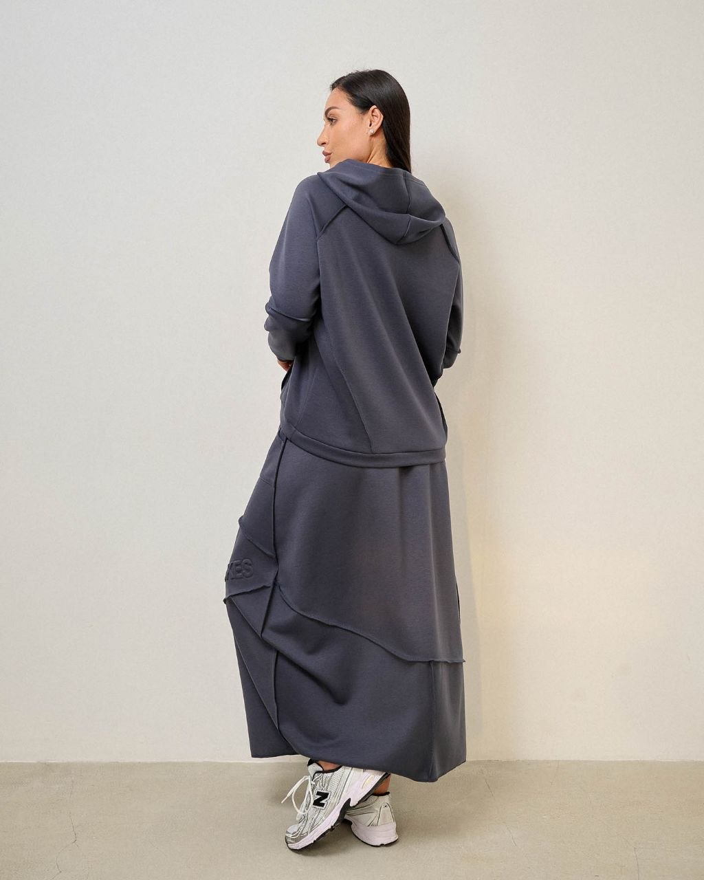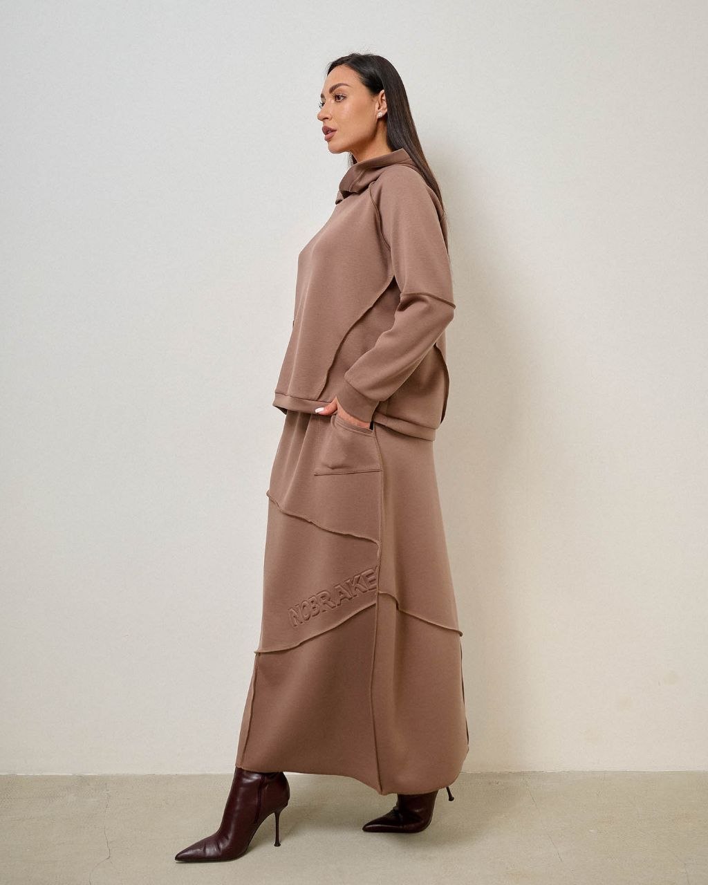 Костюм зі спідницею, шви назовні. Тканина трикотаж “тенсел” (шовковиста, приємна, комфортна), міцна не кошлатиться при правильному догляді. При пранні рекомендовано делікатний режим при 30-40°С та віджим на низьких обертах.