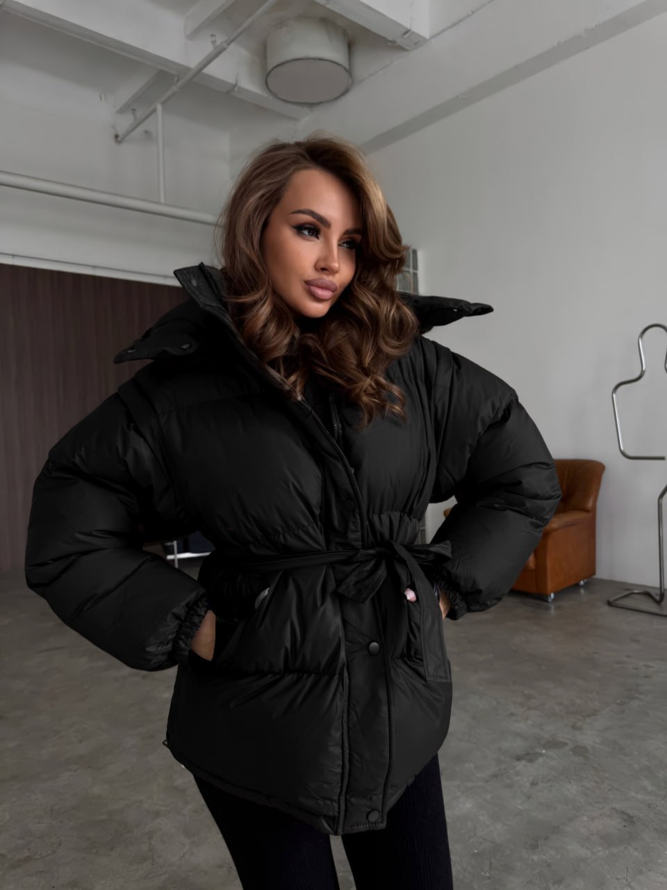 Пояс підкреслює талію, а об’ємний крій створює сучасний силует.