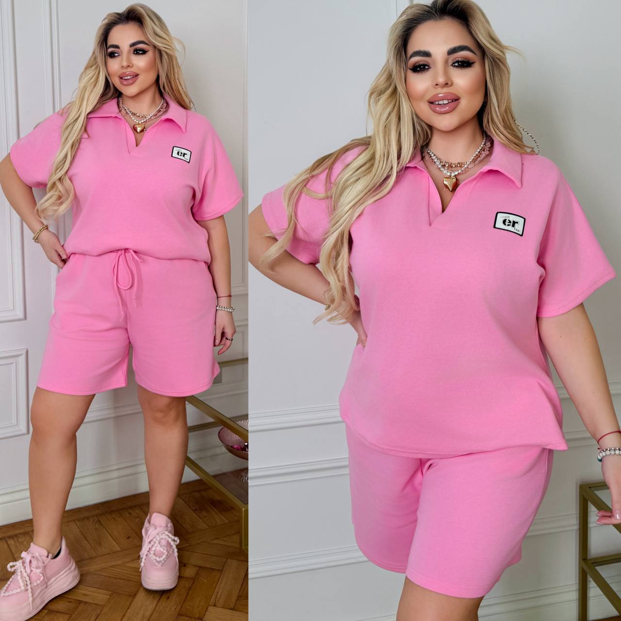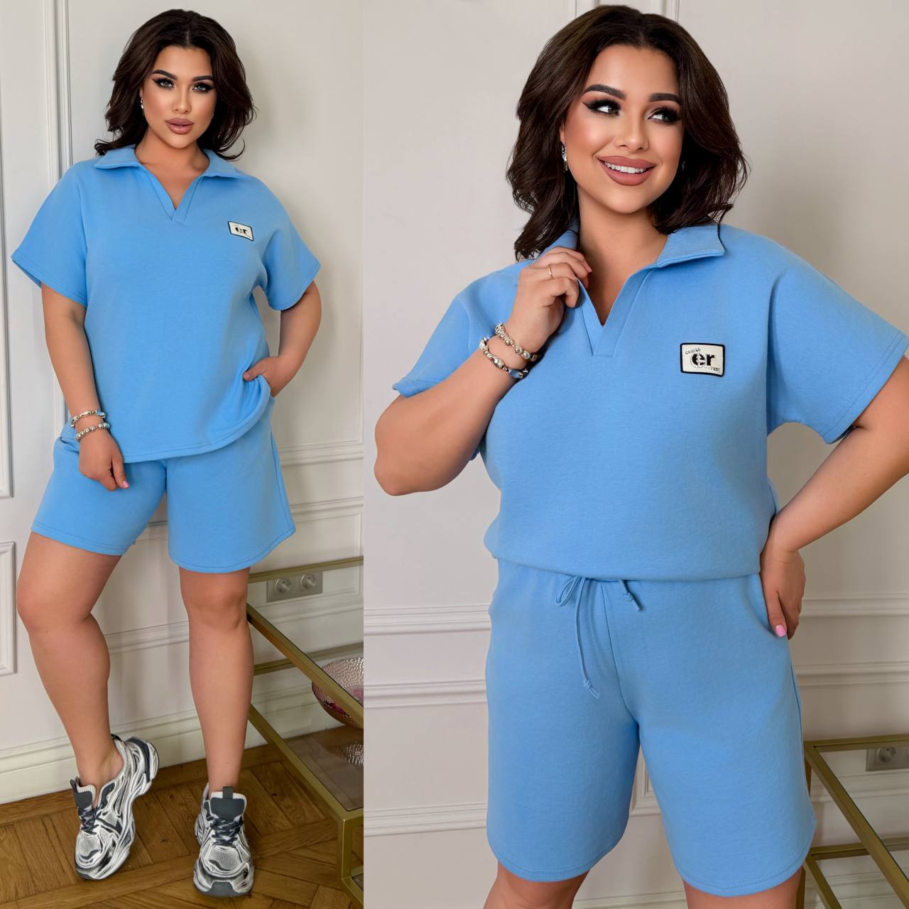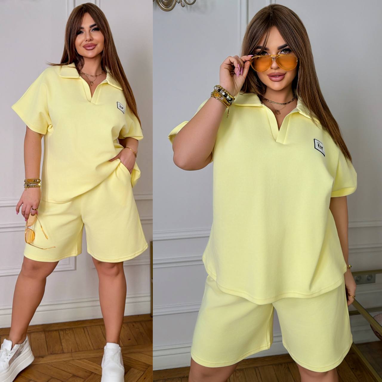 ( Стильний комфортний костюм “Vacation in Saint-Tropez” з подвійного дабл фейс хб стрейч Турція : футболка поло у стилі оверсайз + шорти з високою посадкою з кішенями у бічних швах, з куліскою на поясі).