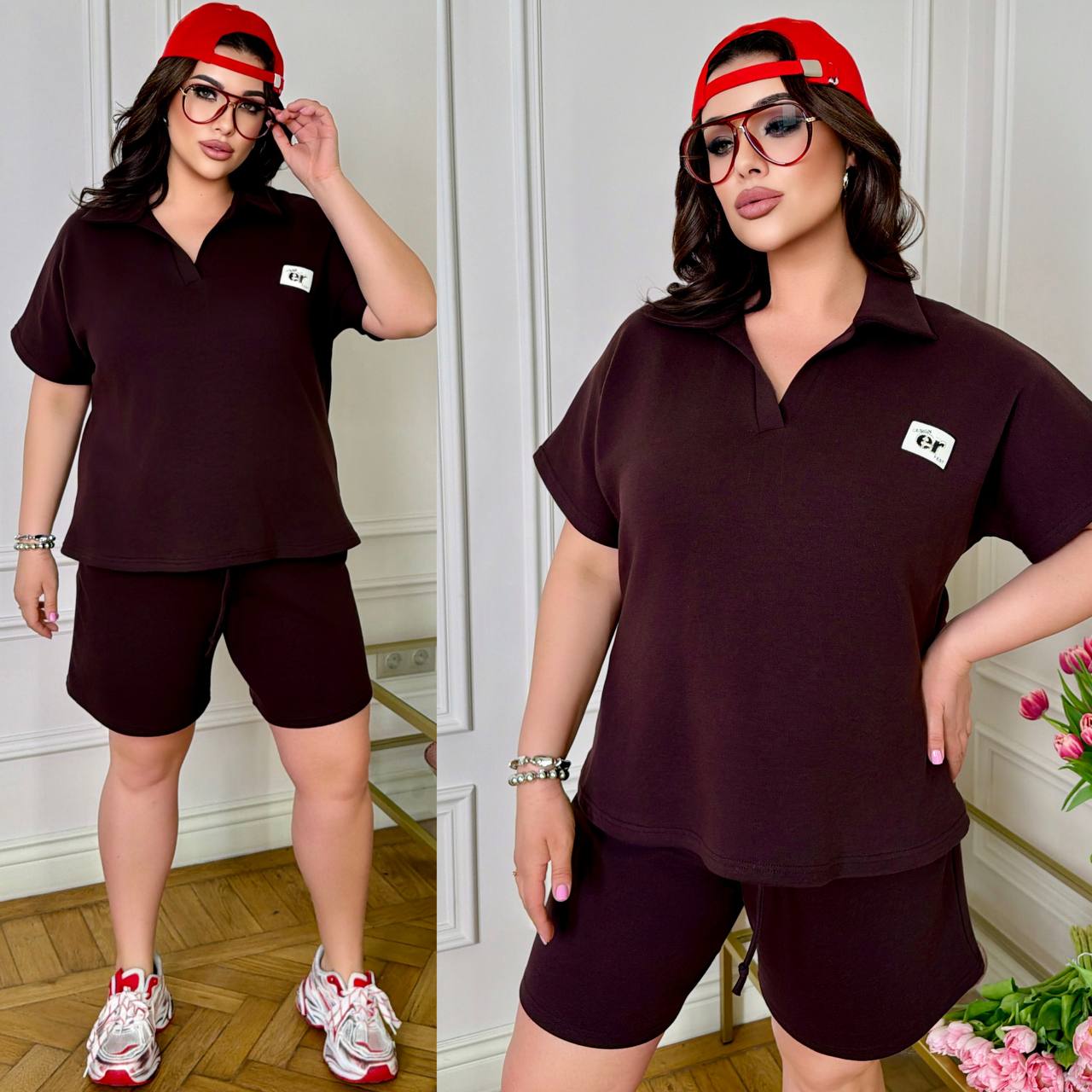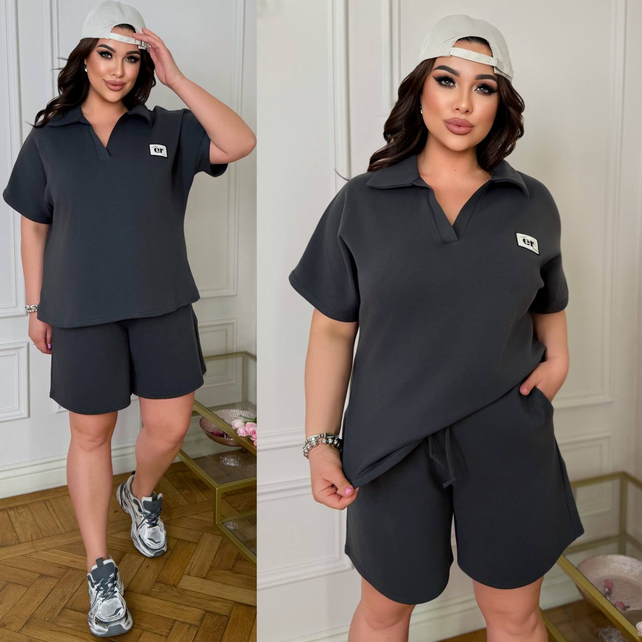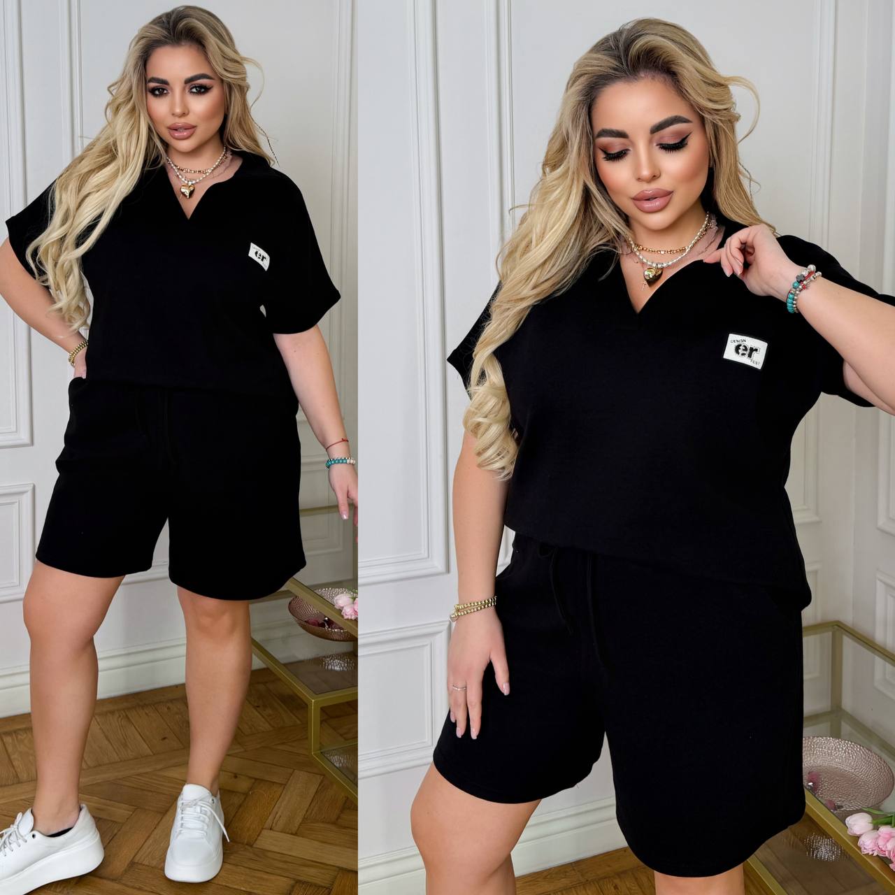 ( Стильний комфортний костюм “Vacation in Saint-Tropez” з подвійного дабл фейс хб стрейч Турція : футболка поло у стилі оверсайз + шорти з високою посадкою з кішенями у бічних швах, з куліскою на поясі).
