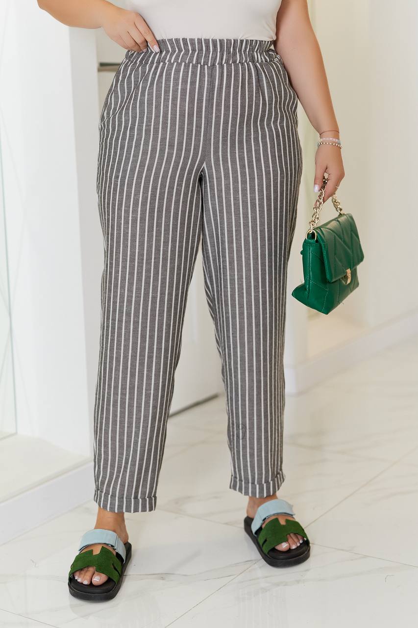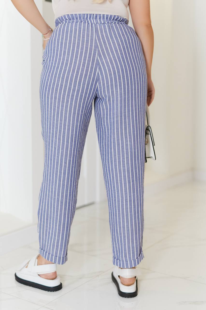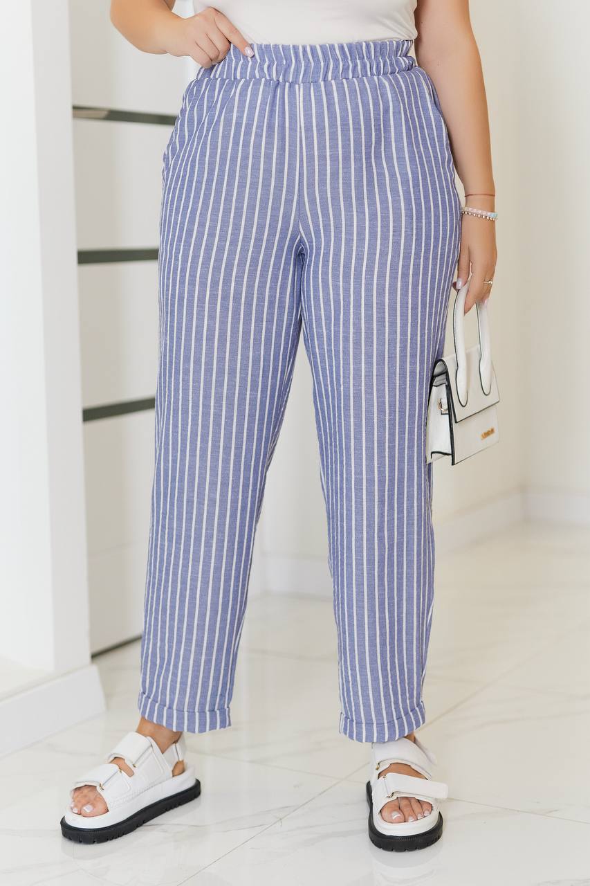 Брюки вільного крою не сковує рухів, пояс на резинці , забезпечує ідеальну посадку під будь-який тип фігури.Вертикальна смужка витягує силует, легко комбінувати з іншими речами.