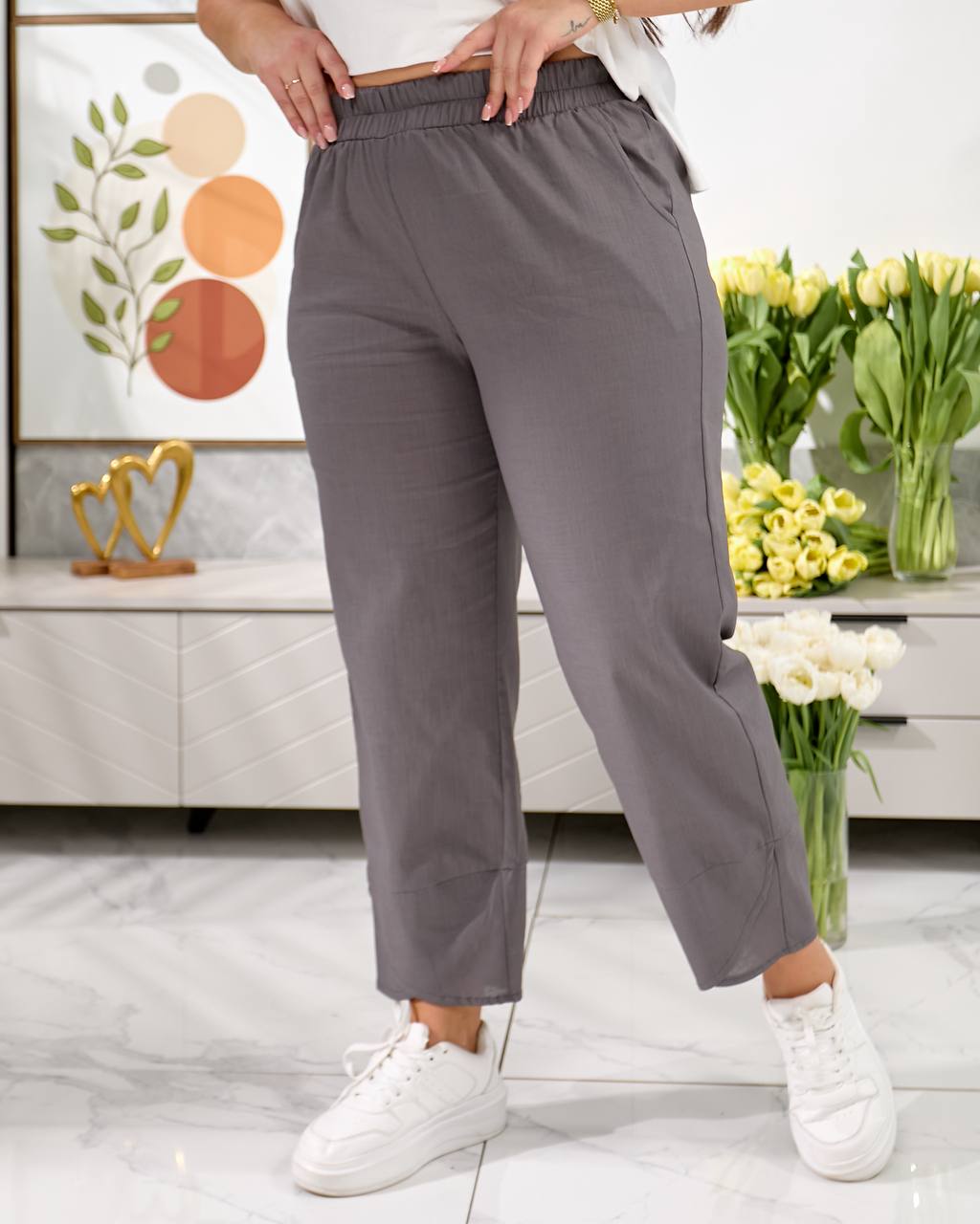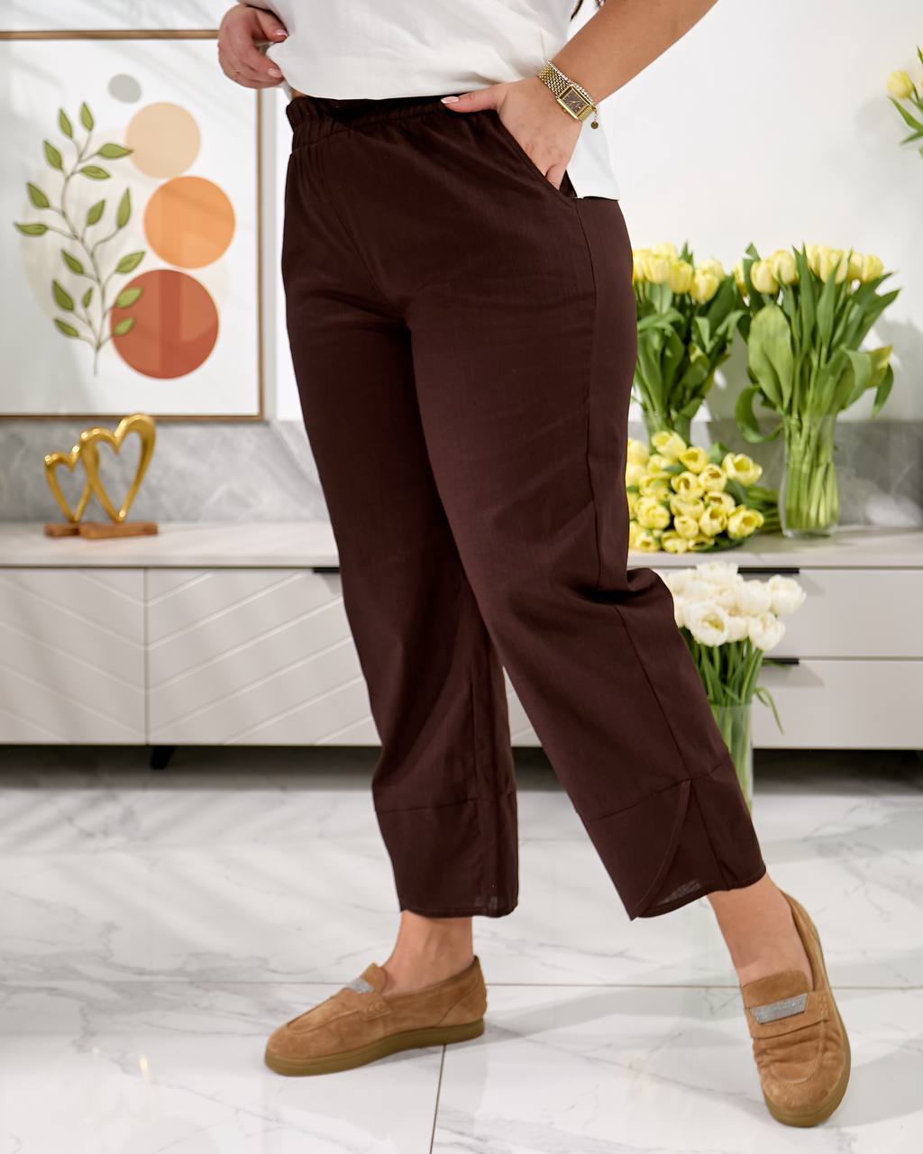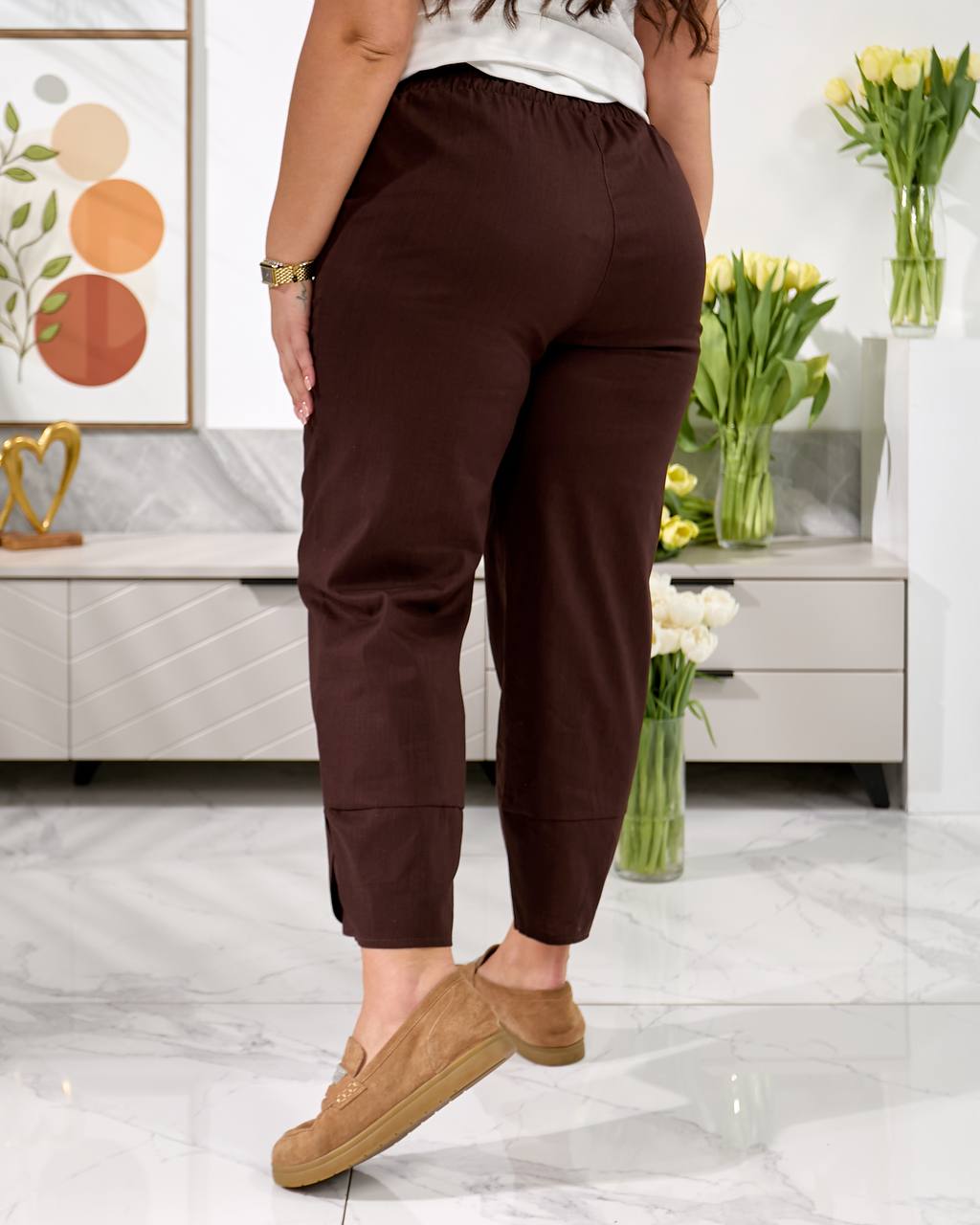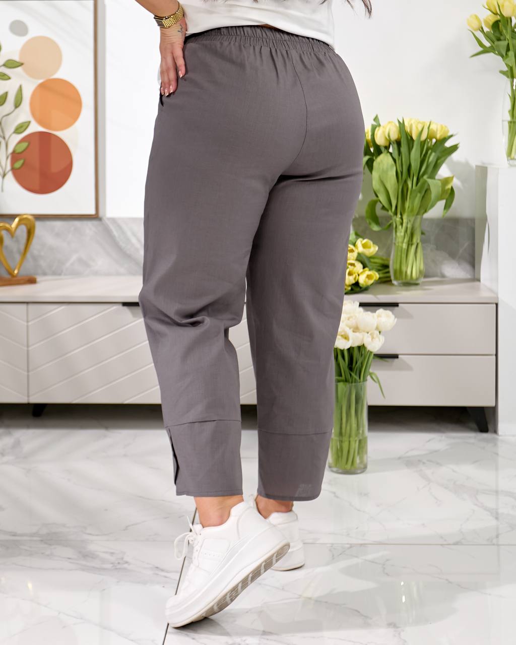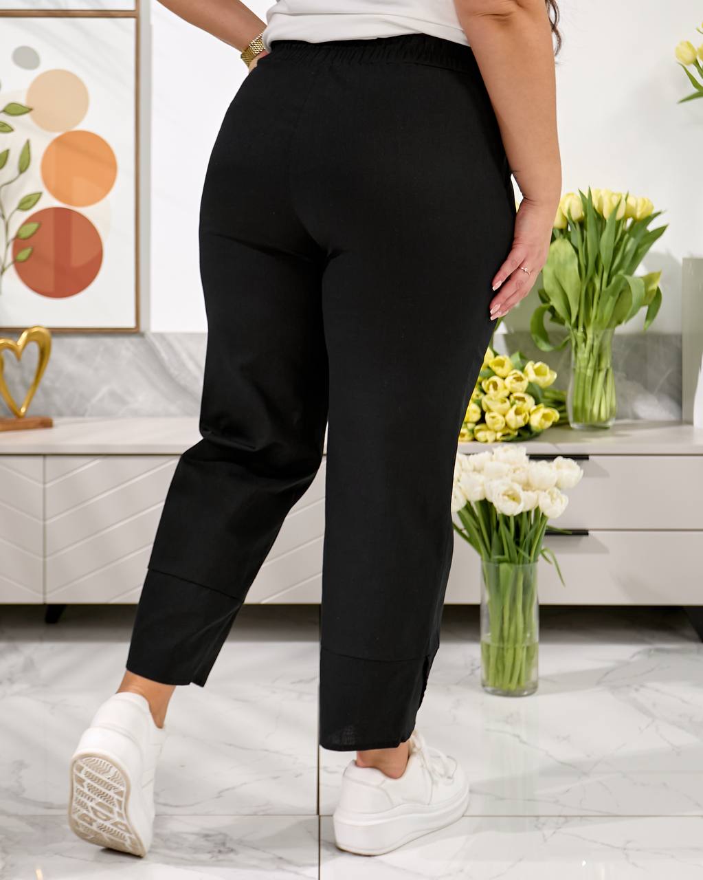 Брюки середньої посадки , з кишенями, пояс на резинці, низ брюк оздобленний фігурним манжетом. Дана модель має вільний, трохи укорочений крій ( 7/8 або повна довжина, залежно від зрісту)