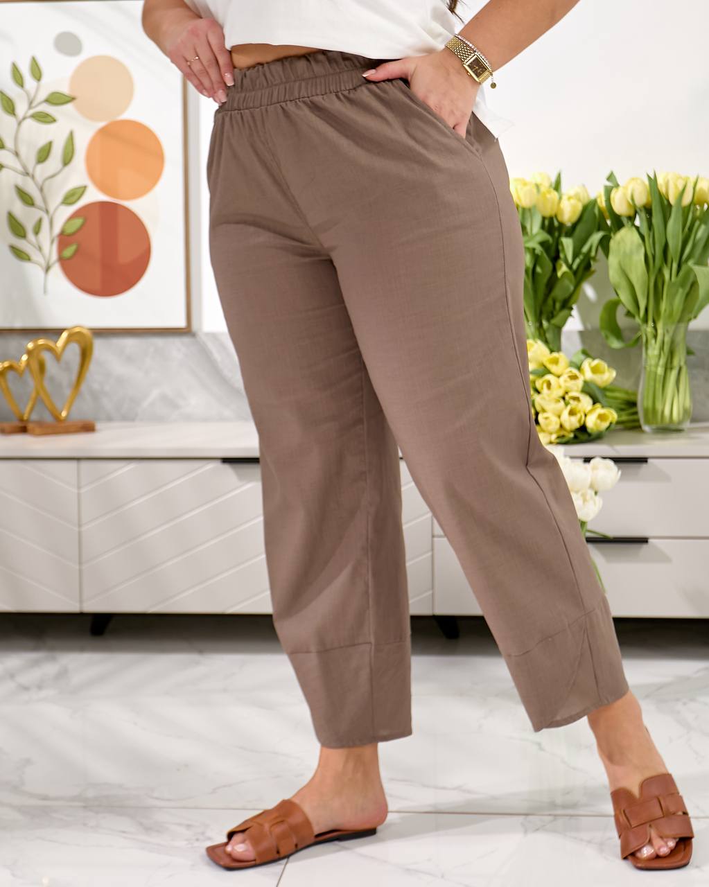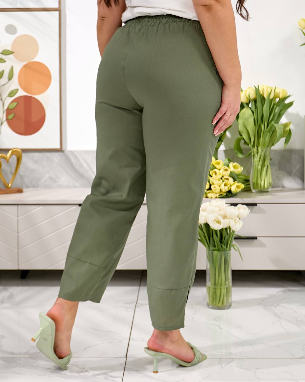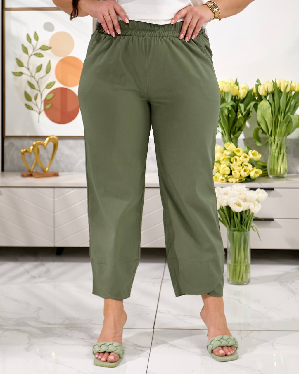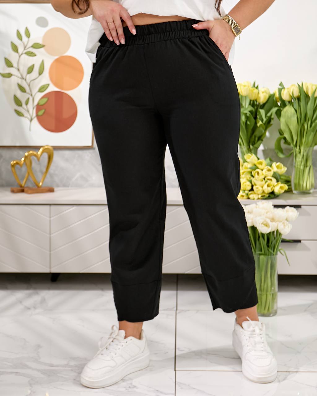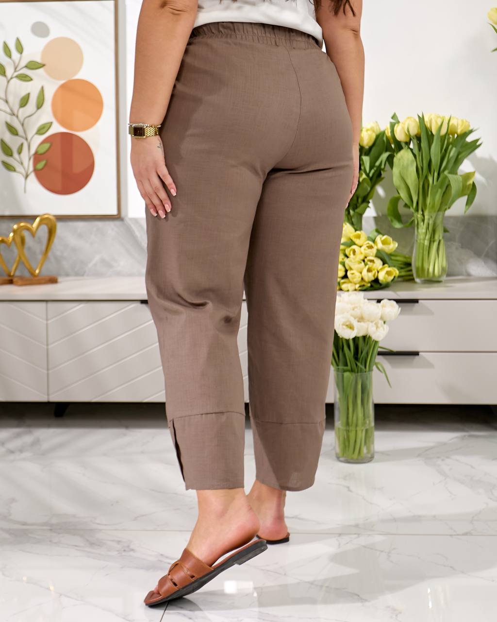 Брюки середньої посадки , з кишенями, пояс на резинці, низ брюк оздобленний фігурним манжетом. Дана модель має вільний, трохи укорочений крій ( 7/8 або повна довжина, залежно від зрісту)
