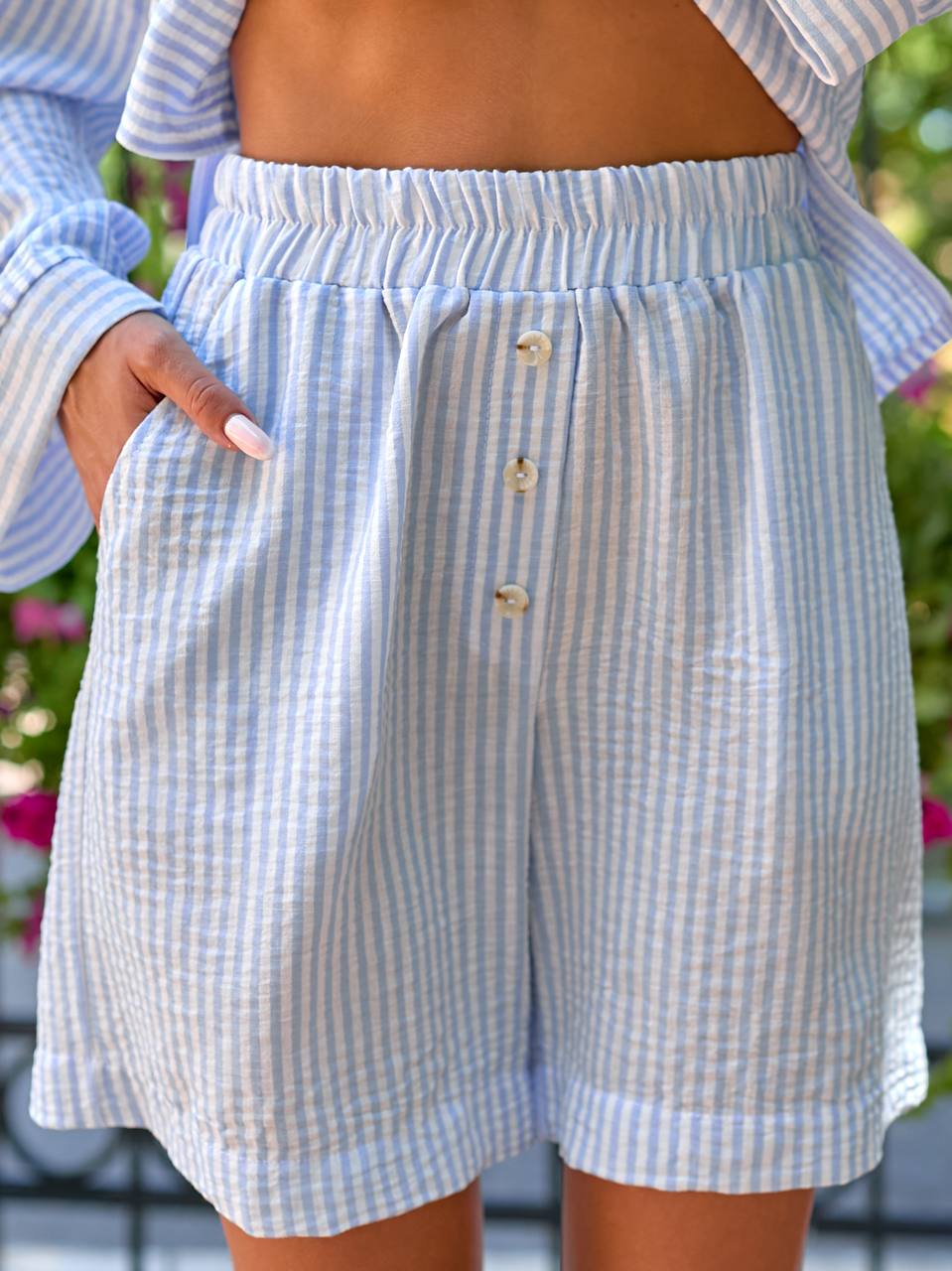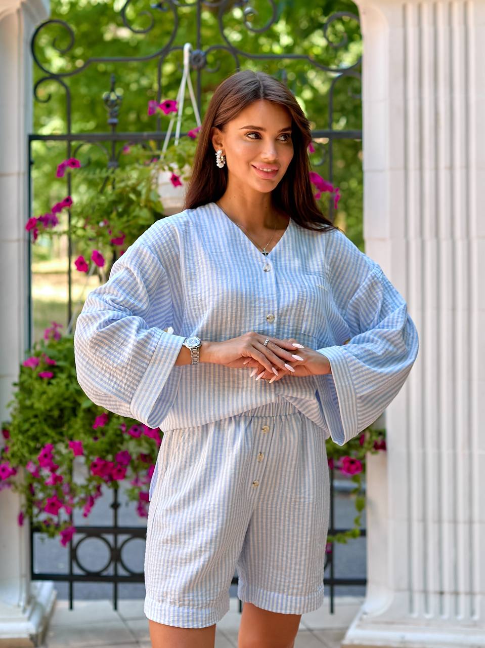 Гарний та дуже приємний до тіла костюм. Рубашка зі спущеними плечима, глибоким вирізом , на ґудзиках. Шорти високої посадки , з кишенями, прямі, пояс на резинці.