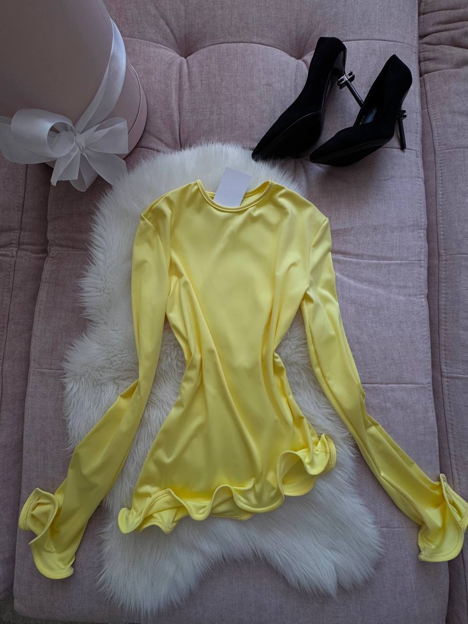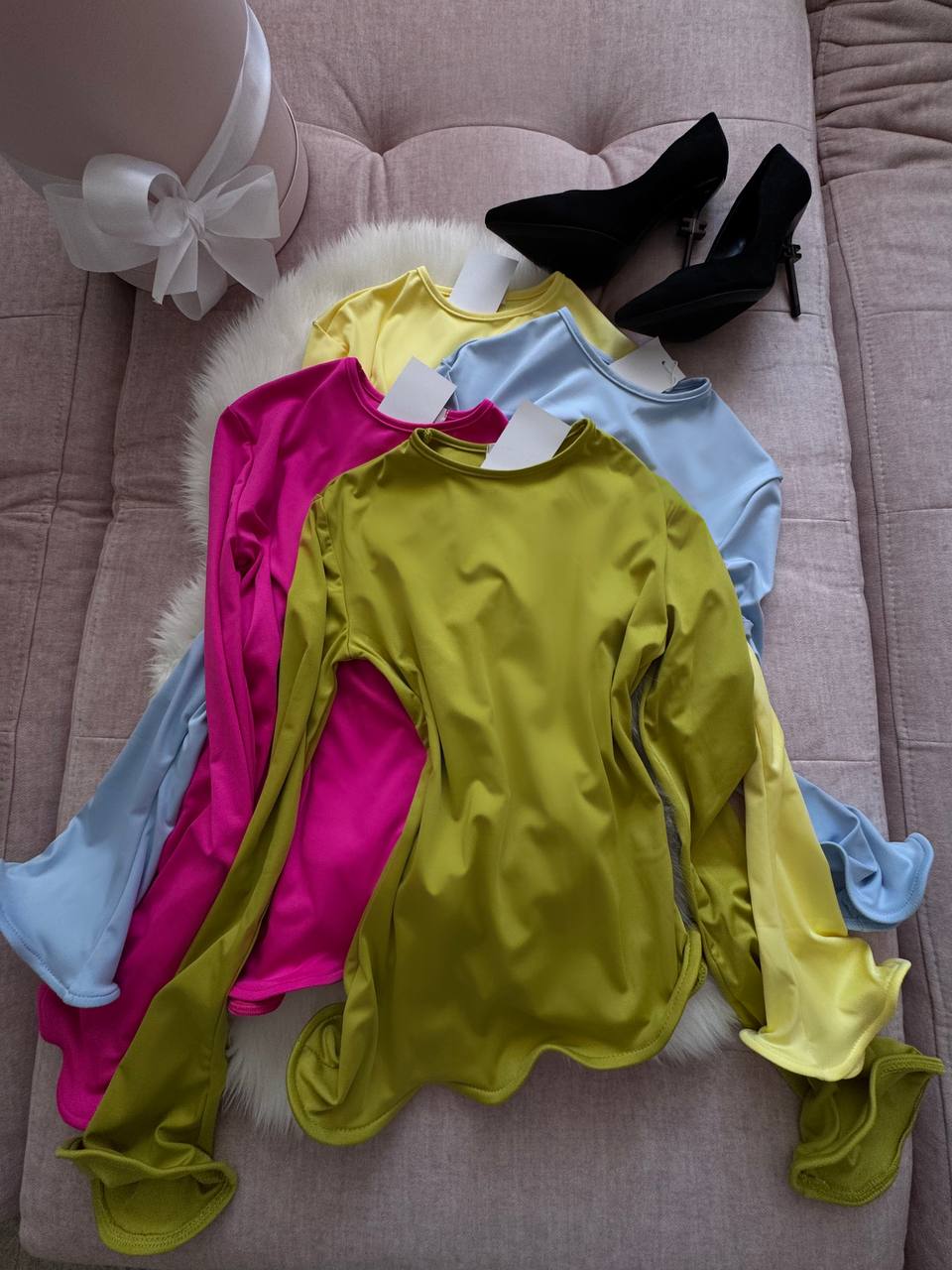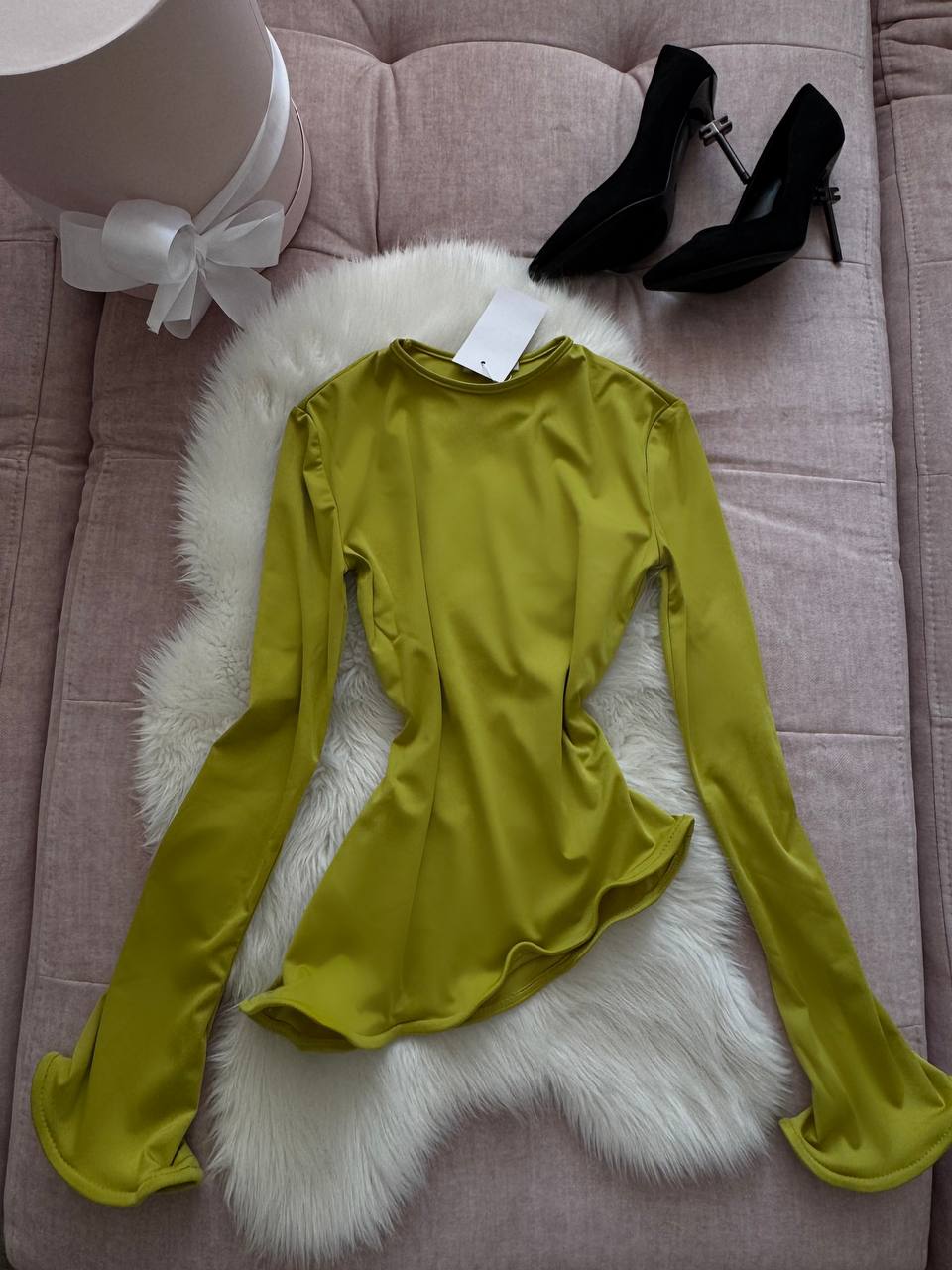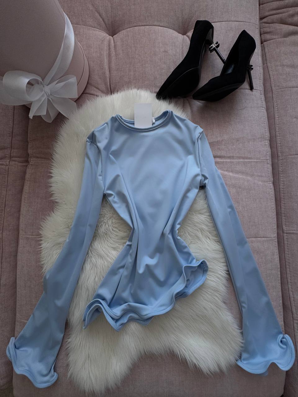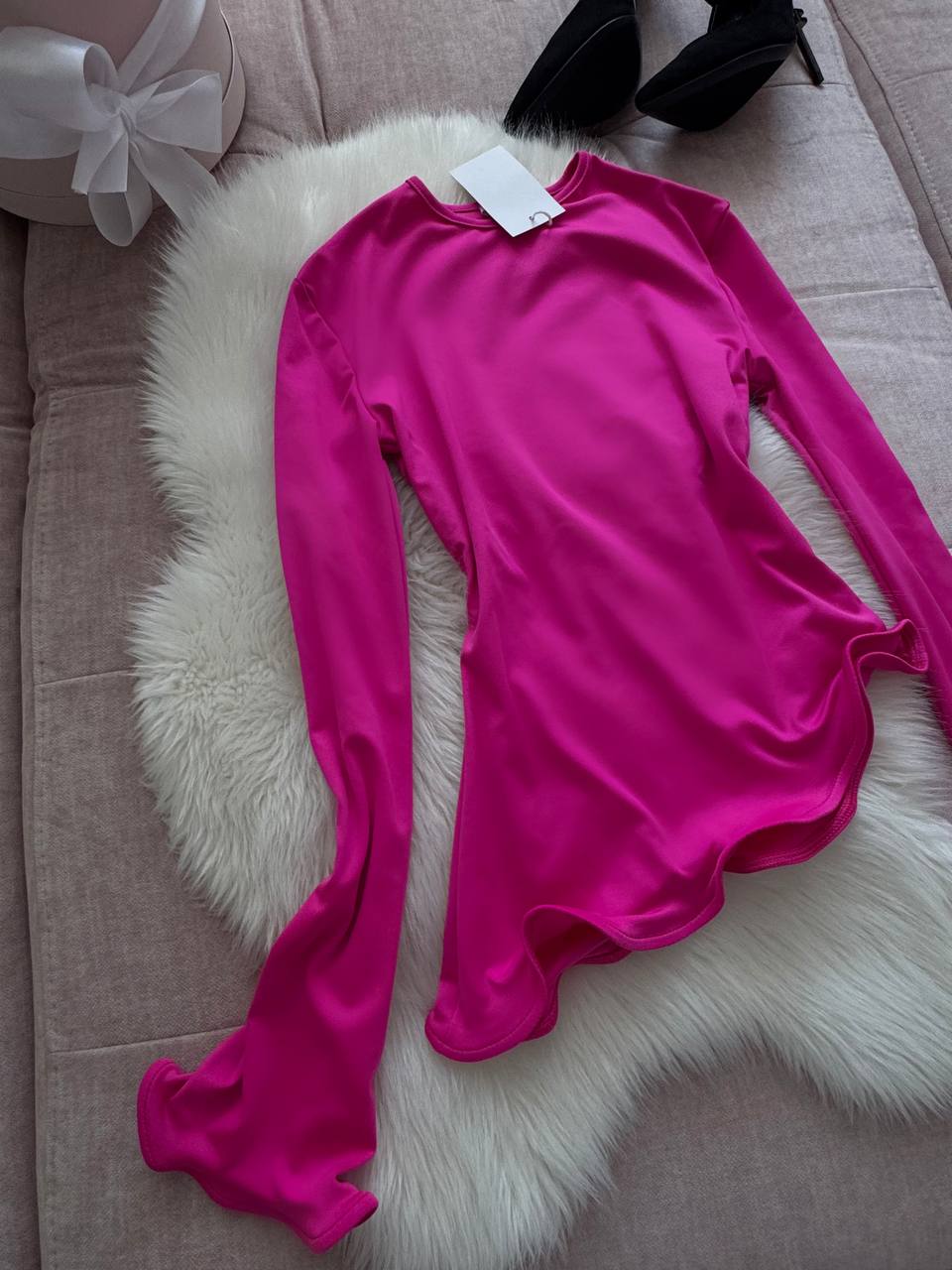 Мʼякий еластичний трикотаж, який приємно лягає по фігурі. Прилеглий силует і фігурні, живі краї по низу виробу та рукавах додають образу ніжності. Універсальний розмір – комфортний, жіночний і дуже легко стилізується