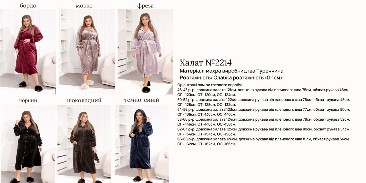 46-48 р-р: довжина халата 121см, довжина рукава від плечового шва 75см, обхват рукава 46см, ОГ – 120см, ОТ -120см, OC -124см.