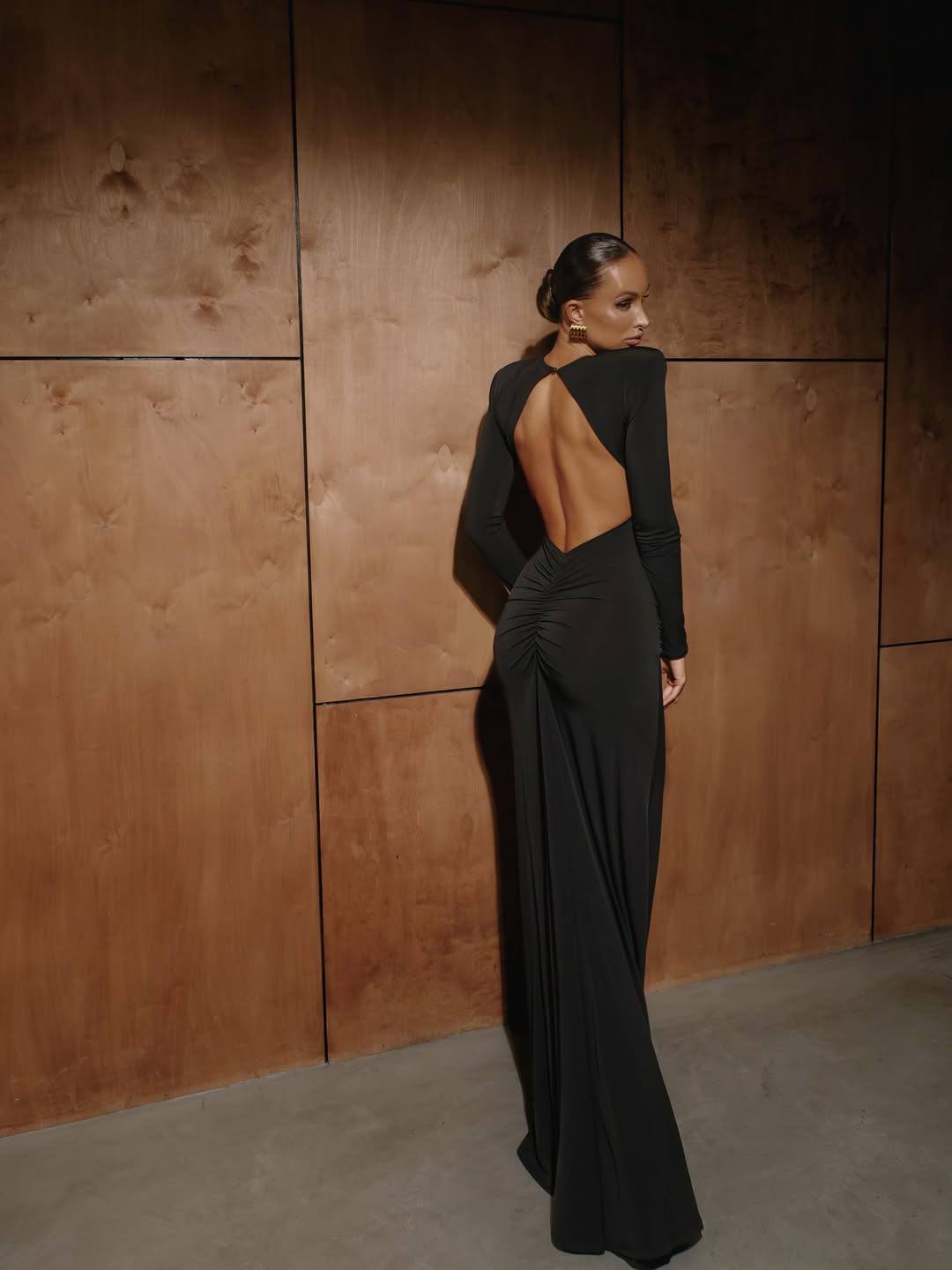 Головний акцент — відкрита спина з глибоким вирізом, що додає образу чуттєвості та вишуканої сміливості✨