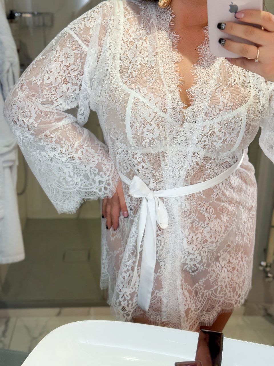 Модель №787. Халат. Халат короткий з поясом, з довгим рукавом, виконаний з натурального мережива с купоном по низу халата та низу рукава. Тканина французьке мереживо. Склад: поліестер -100%. Колір Чорний, Білий Розміри:42-44, 46-48, 50-52, 54-56, 58-60