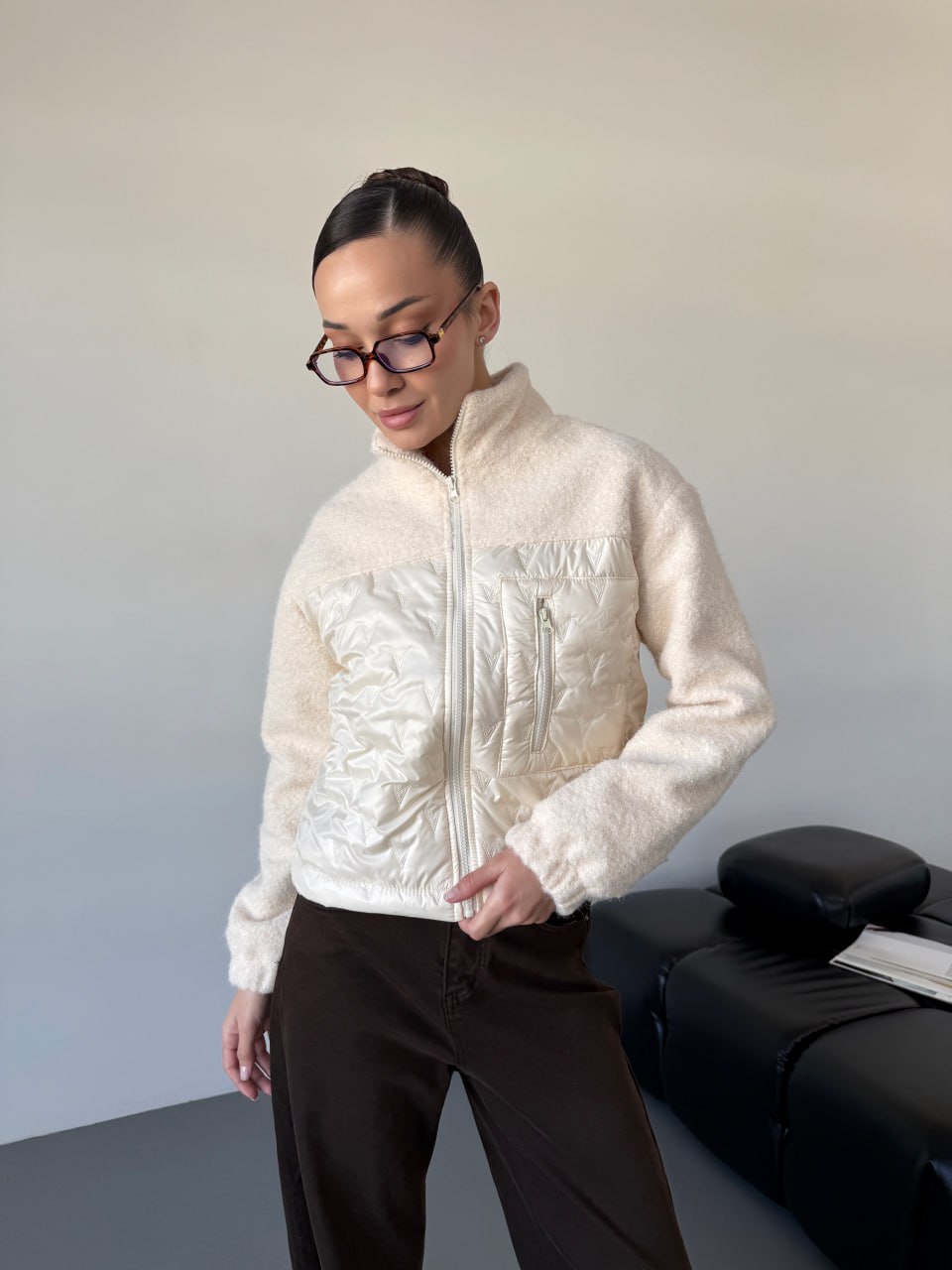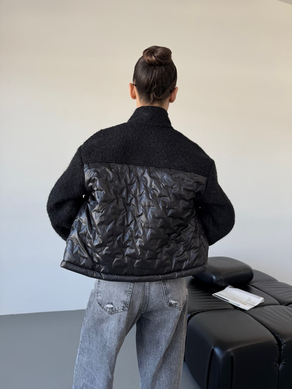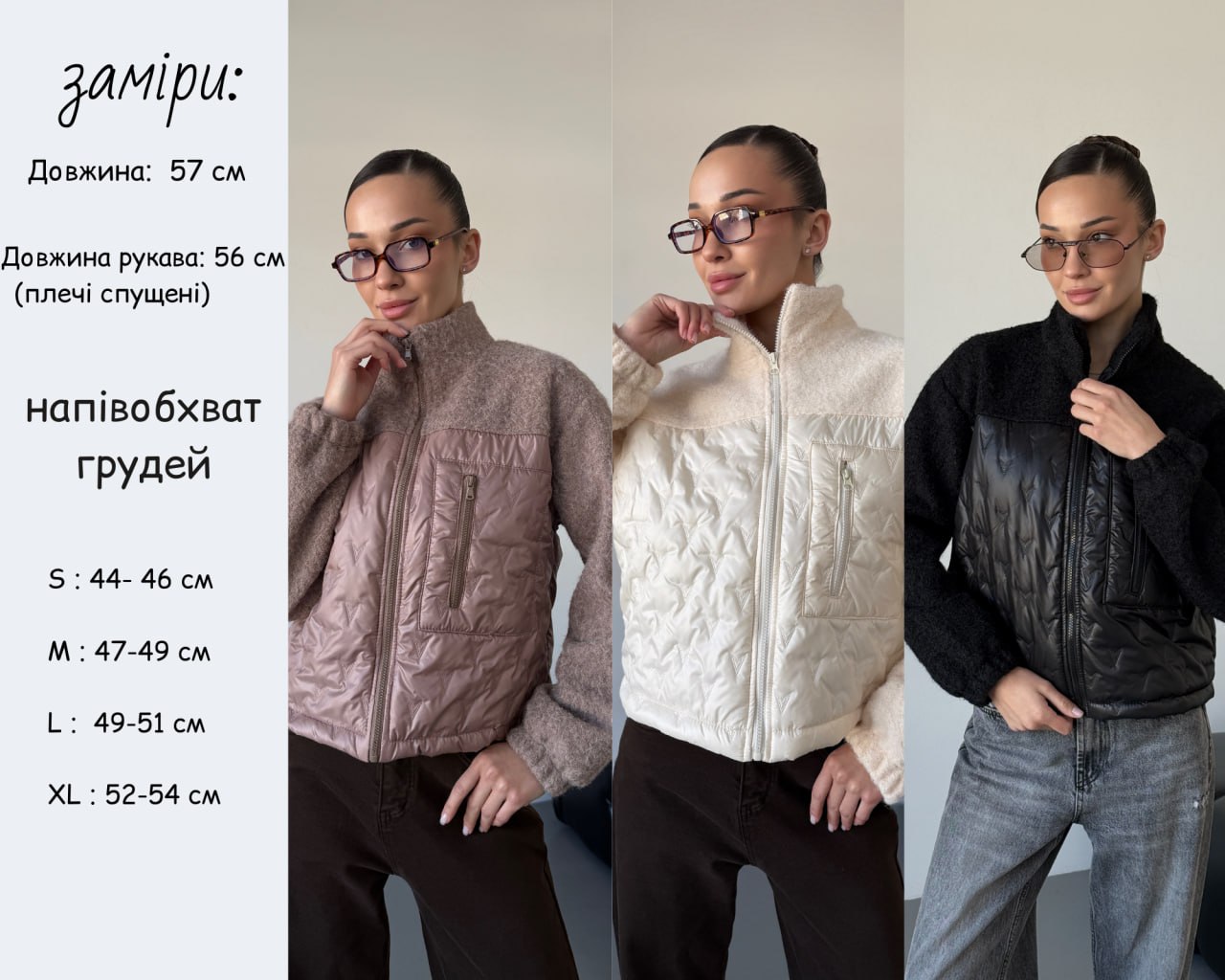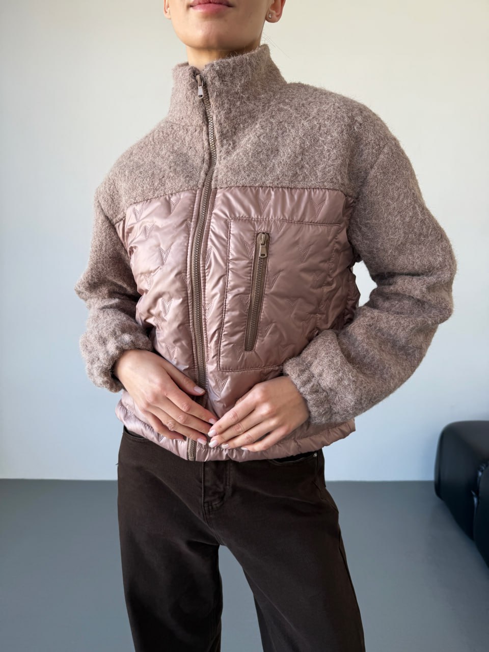 Опис: Стильний комбінованний бомбер з м’якої вовни та стьобанної плащівки( наповнювач-біо пух) .Модель прямого кроюна на підкладці, застібається на блискавку.
