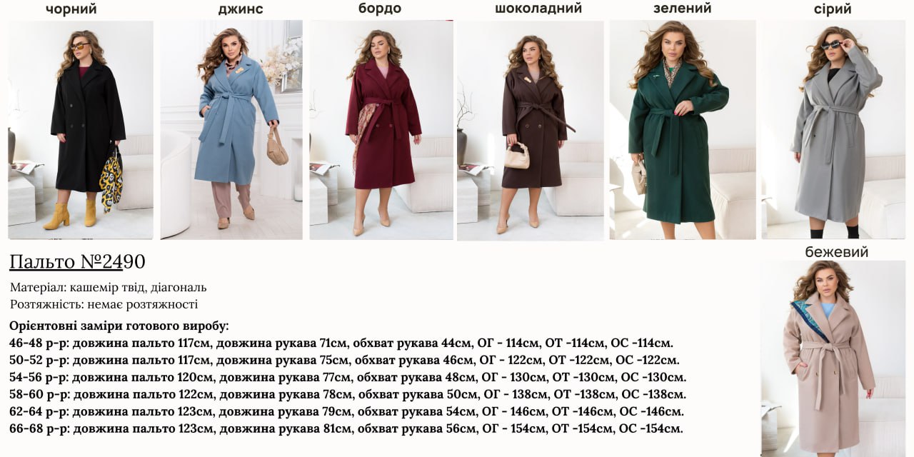 46-48 р-р: довжина пальто 117см, довжина рукава від горловини 71см, обхват рукава 44см, ОГ – 114см, ОТ -114см, OC -114см.