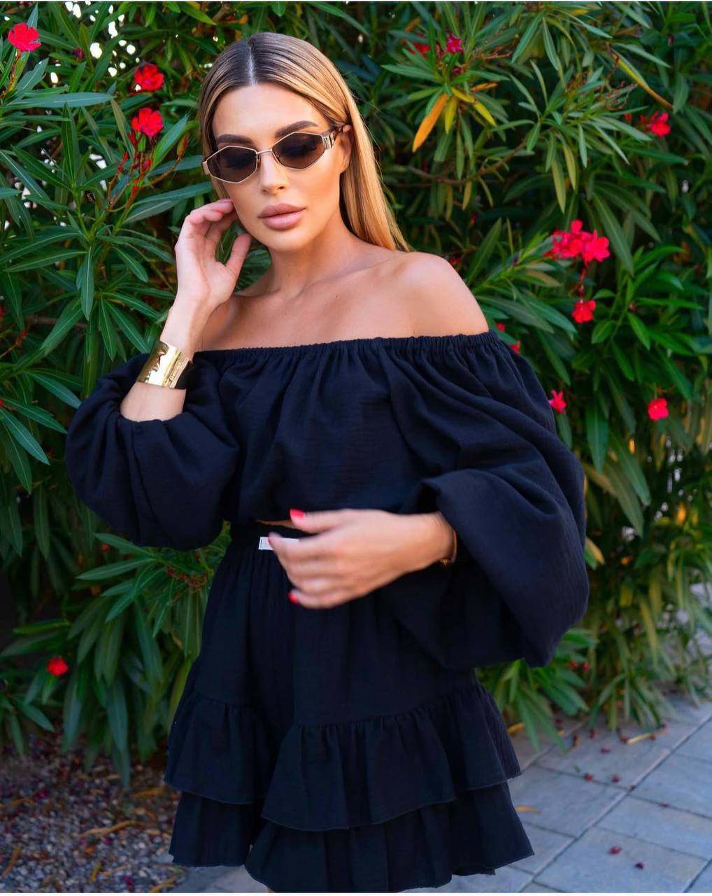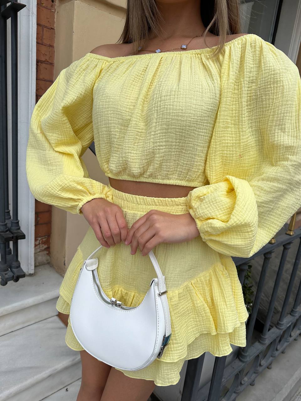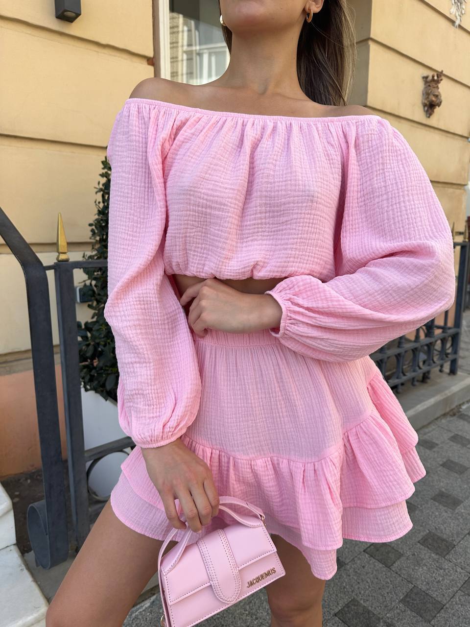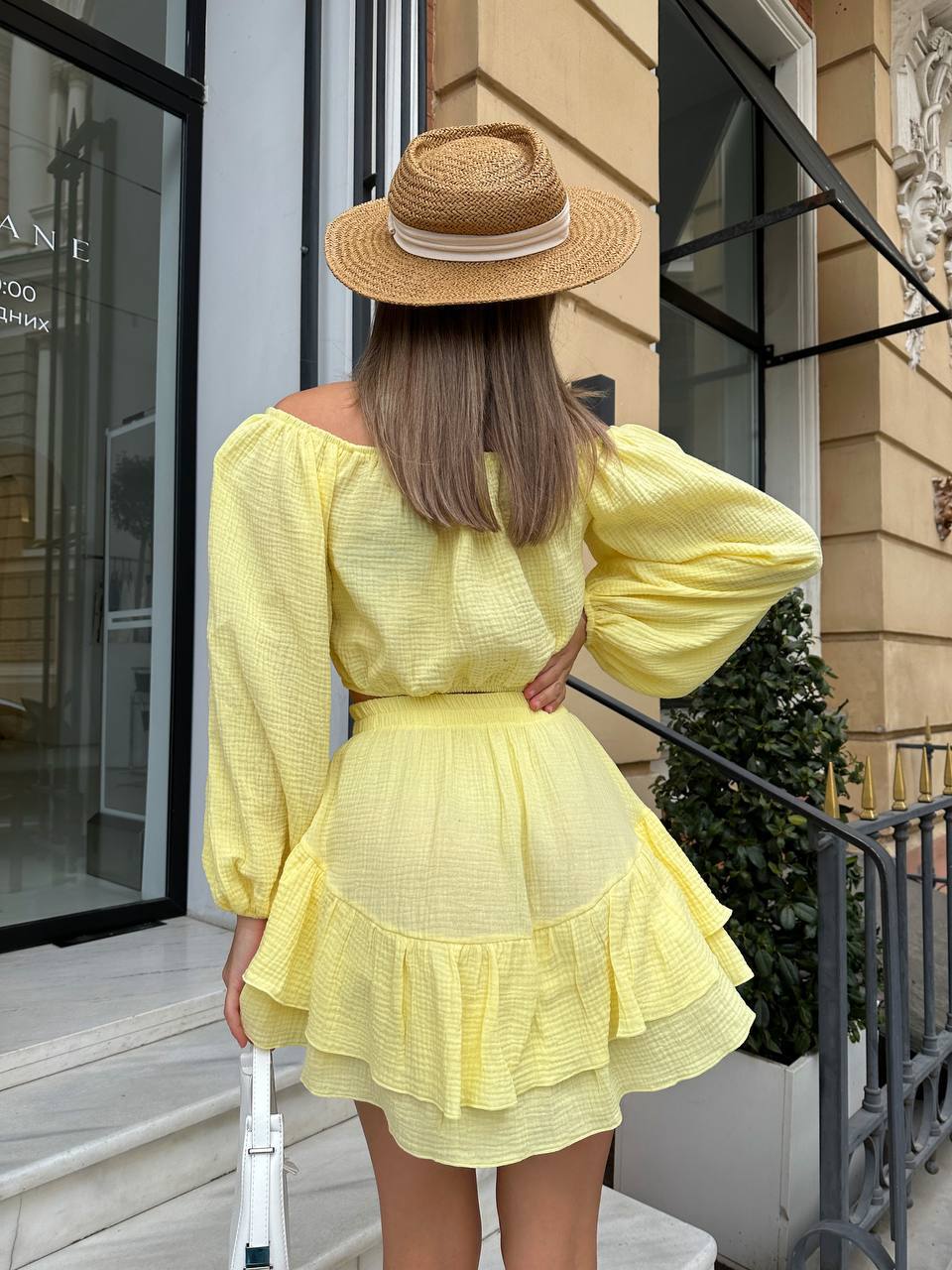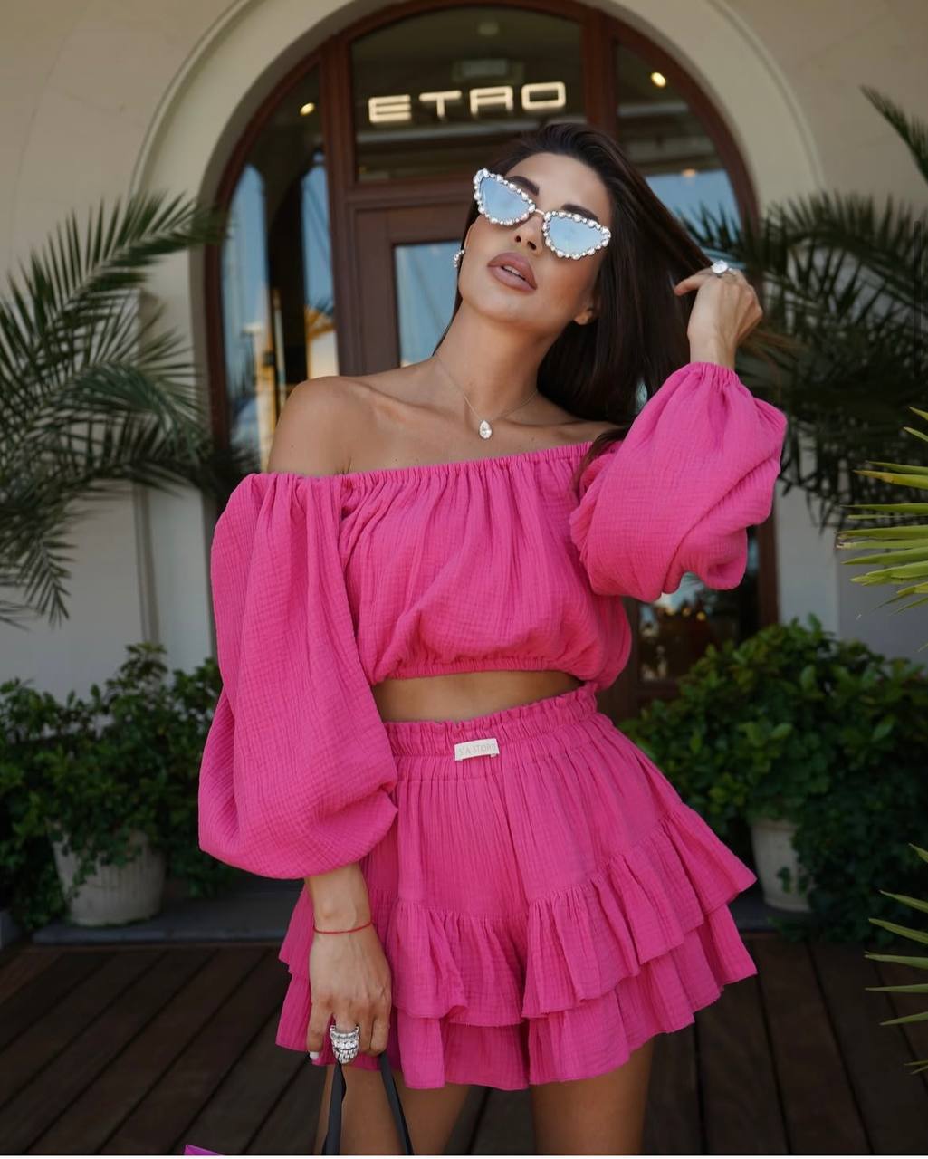 Складається з топу та міні спіднички ▫️Тканина – муслін ▫️Розміри – 42-46 ▫️Кольори-червоний,чорний,Барбі,білий,лимон,фуксія,білий у квіточку