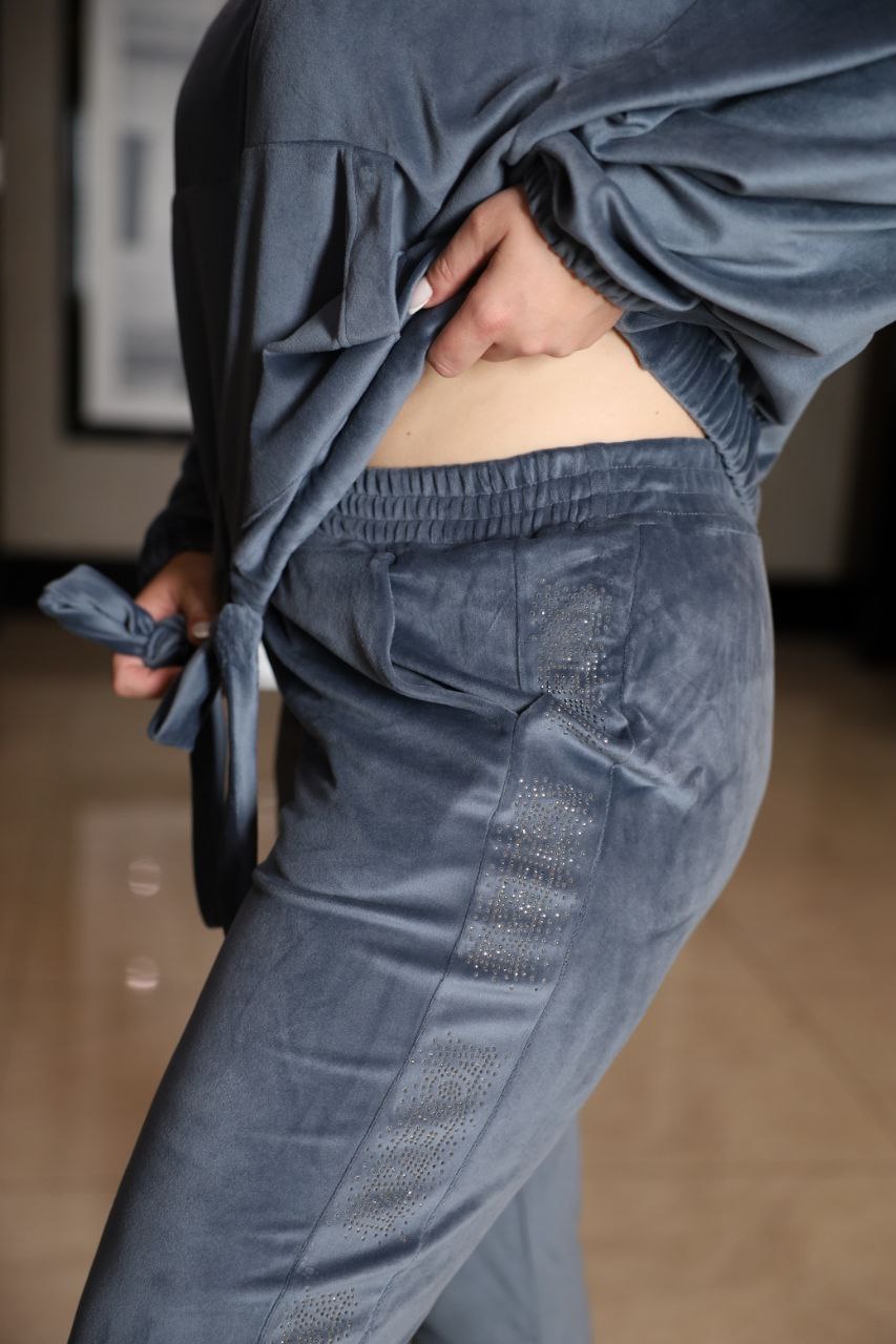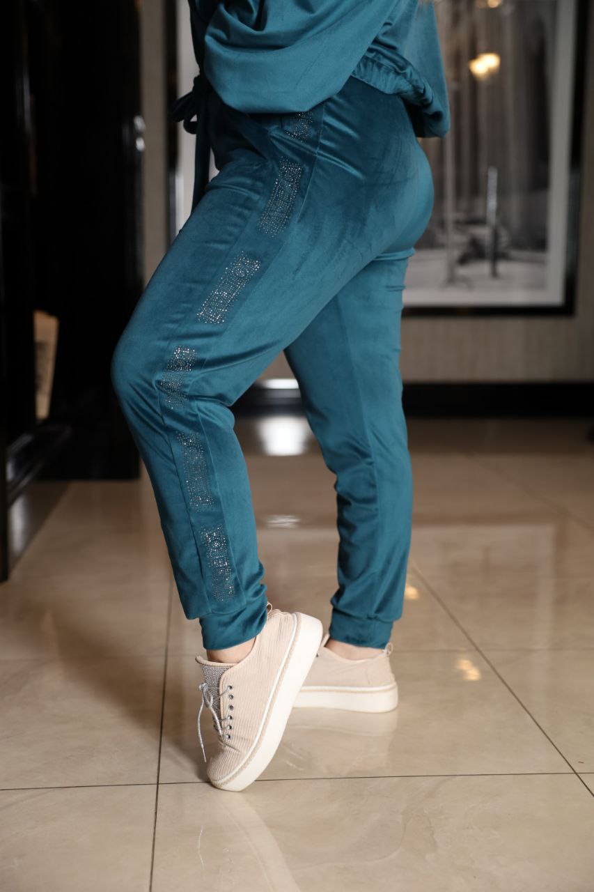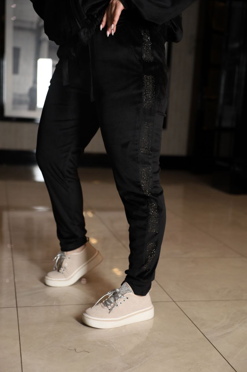 ■ Штани з кишенями, пояс на резинці, бокові лампаси прикрашені стразами.