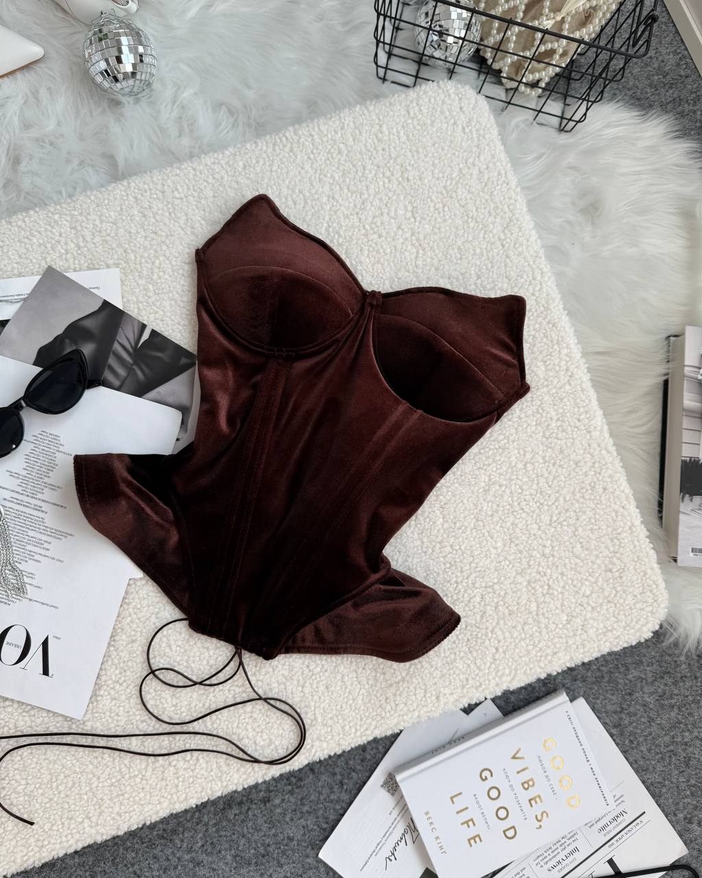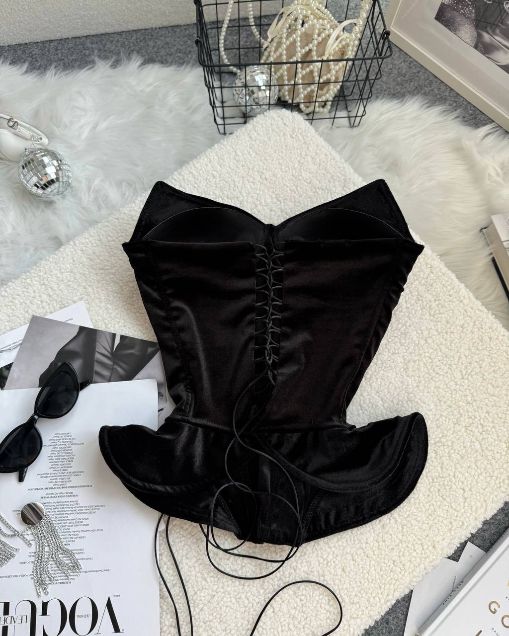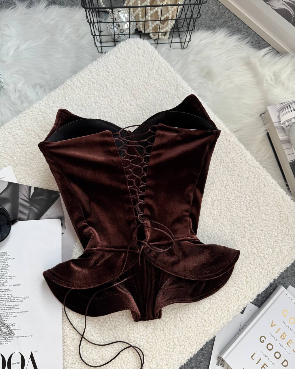 Оксамитовий корсет, від якого неможливо відвести погляду. Йде з чашками, гарно підкреслює декольте. Ці обʼємні волани по боках, додають ще більш жіночності та витонченості. Спинка на шнурівці, регулює обʼєм. Приємна мʼяка тканина, добре тягнеться.