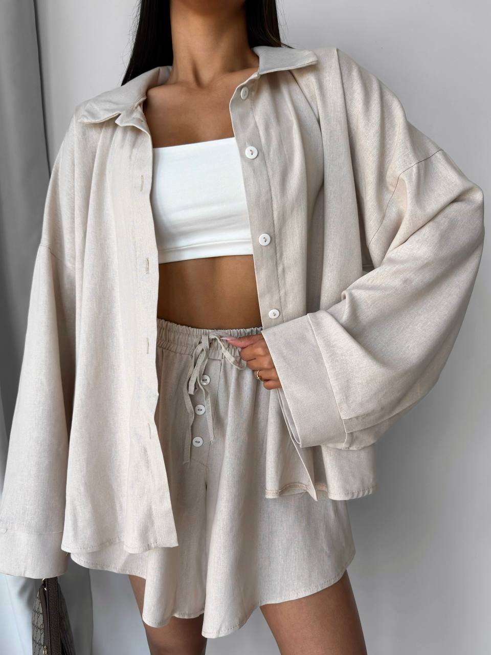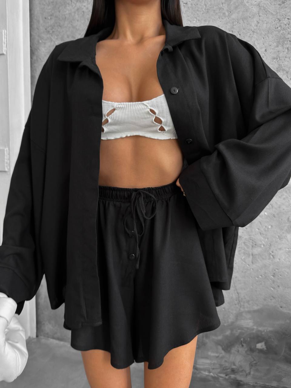 Дуже зручний та практичний, сорочка вільного крою на ґудзиках, шорти на резинці декоровані ґудзиками