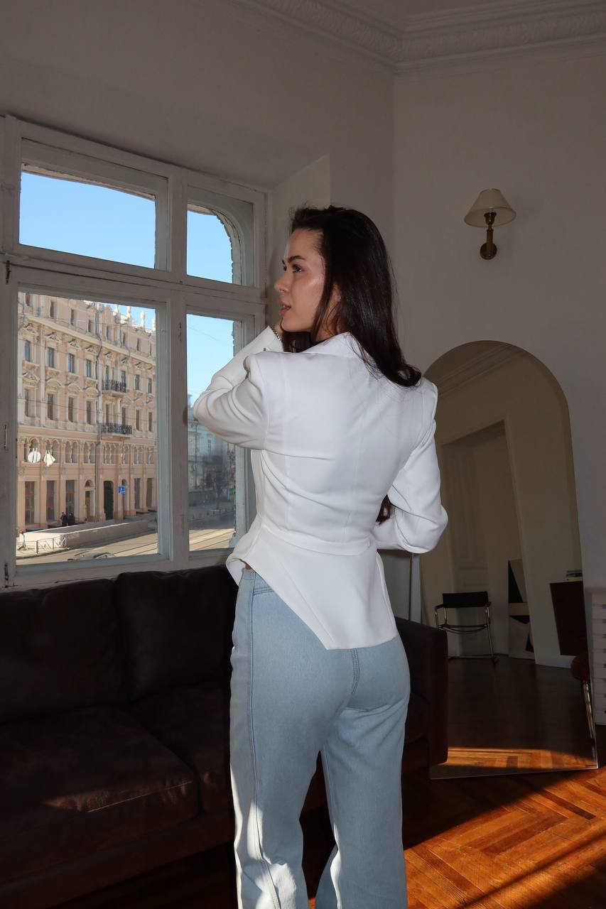 Елегантний білий піджак, що підкреслює жіночність і витонченість силуету. Лаконічний крій із акцентною лінією талії та глибоким V-вирізом створює ефект бездоганної посадки, а мінімалістична застібка додає сучасного характеру✨