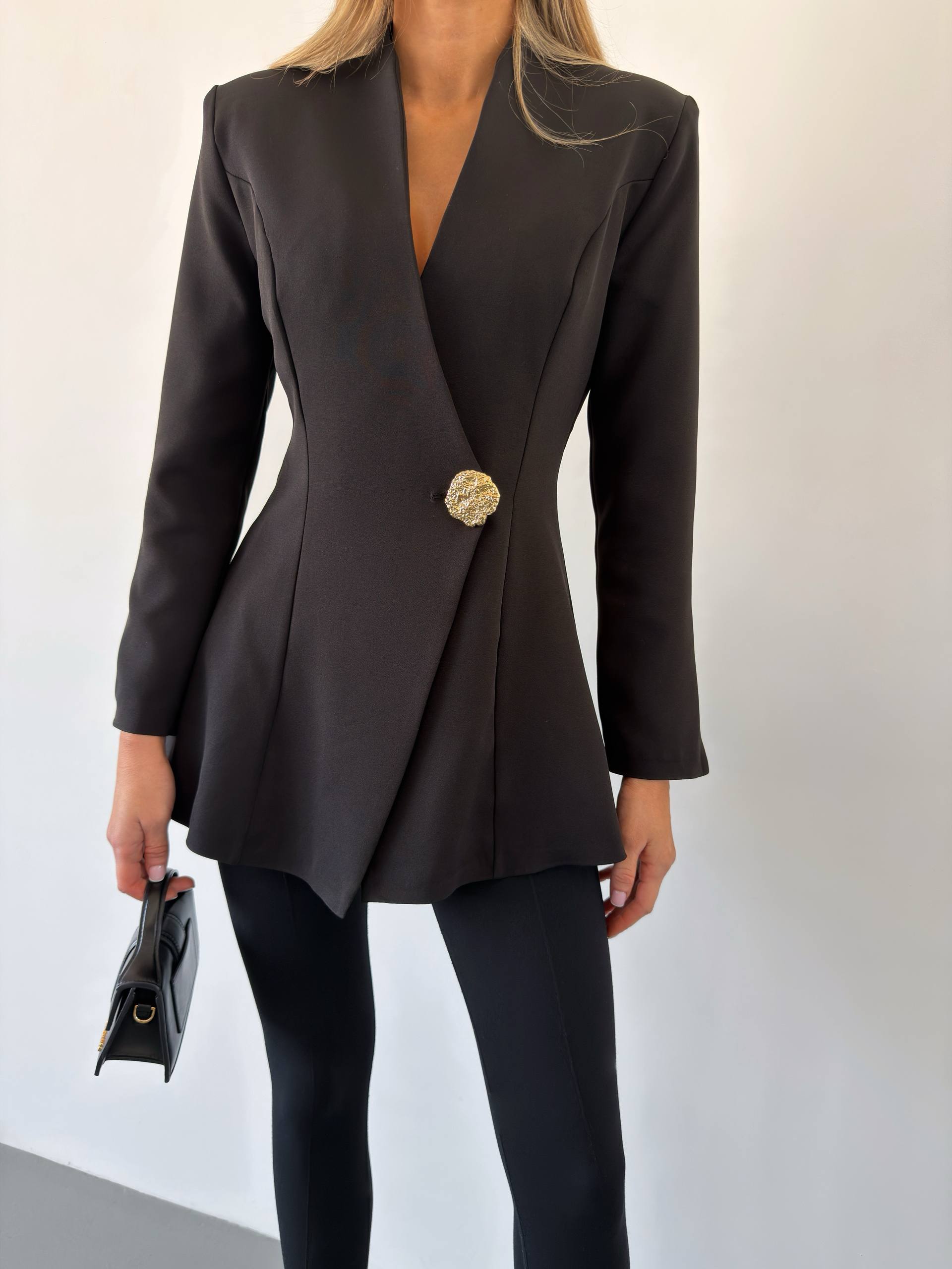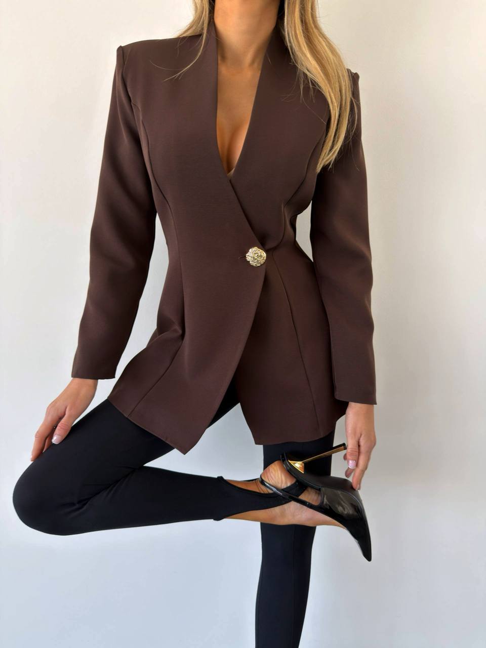Красивий, стильний жіночий піджак з ефектним ґудзиком . Силует злегка приталений, з розкльошеним низом. Має підкладку та плечики.