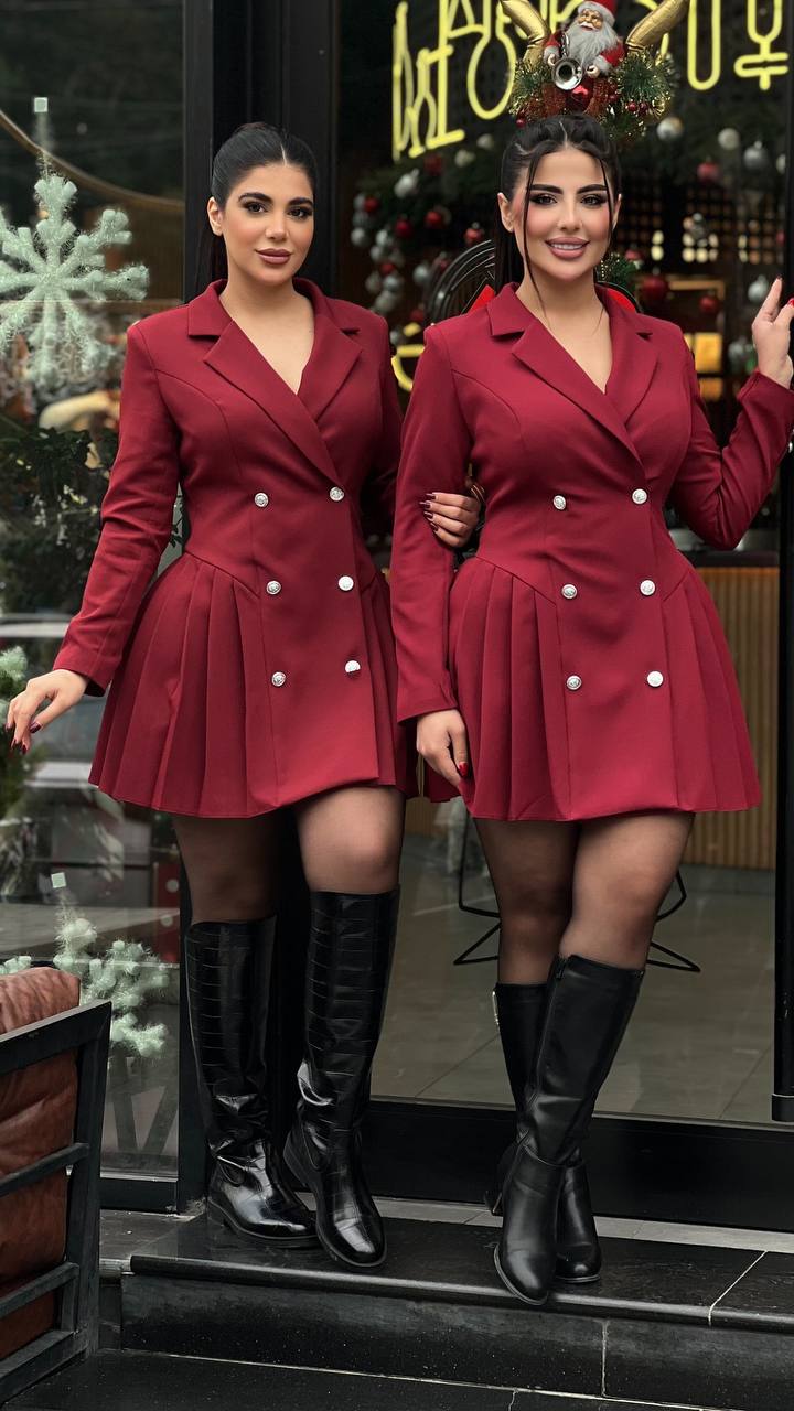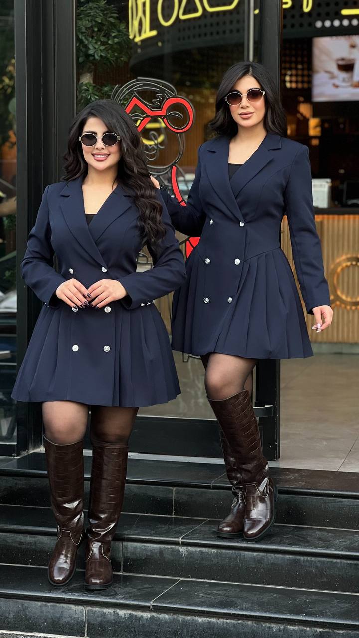 Плаття -жакет на ґудзиках в два ряди ( всередині прихований ґудзик) , асиметрична талія візуально подовжує ніжку та робить тоншим силует , спідниця-кльош по низу плісирування , довгий рукав по низу з трьома ґудзиками.