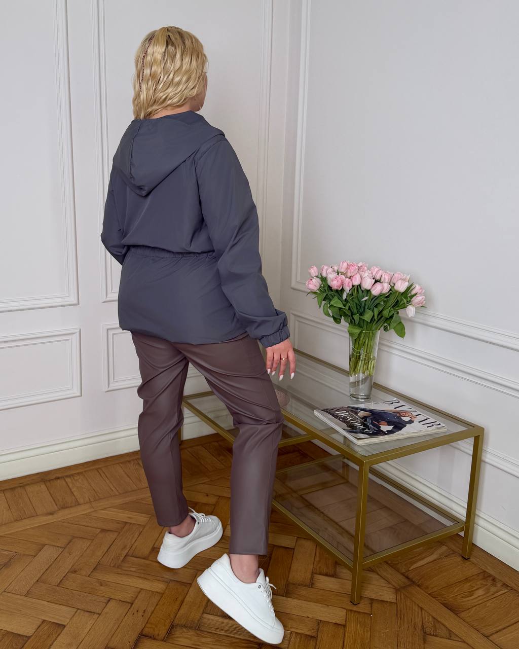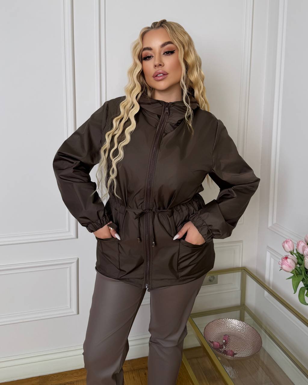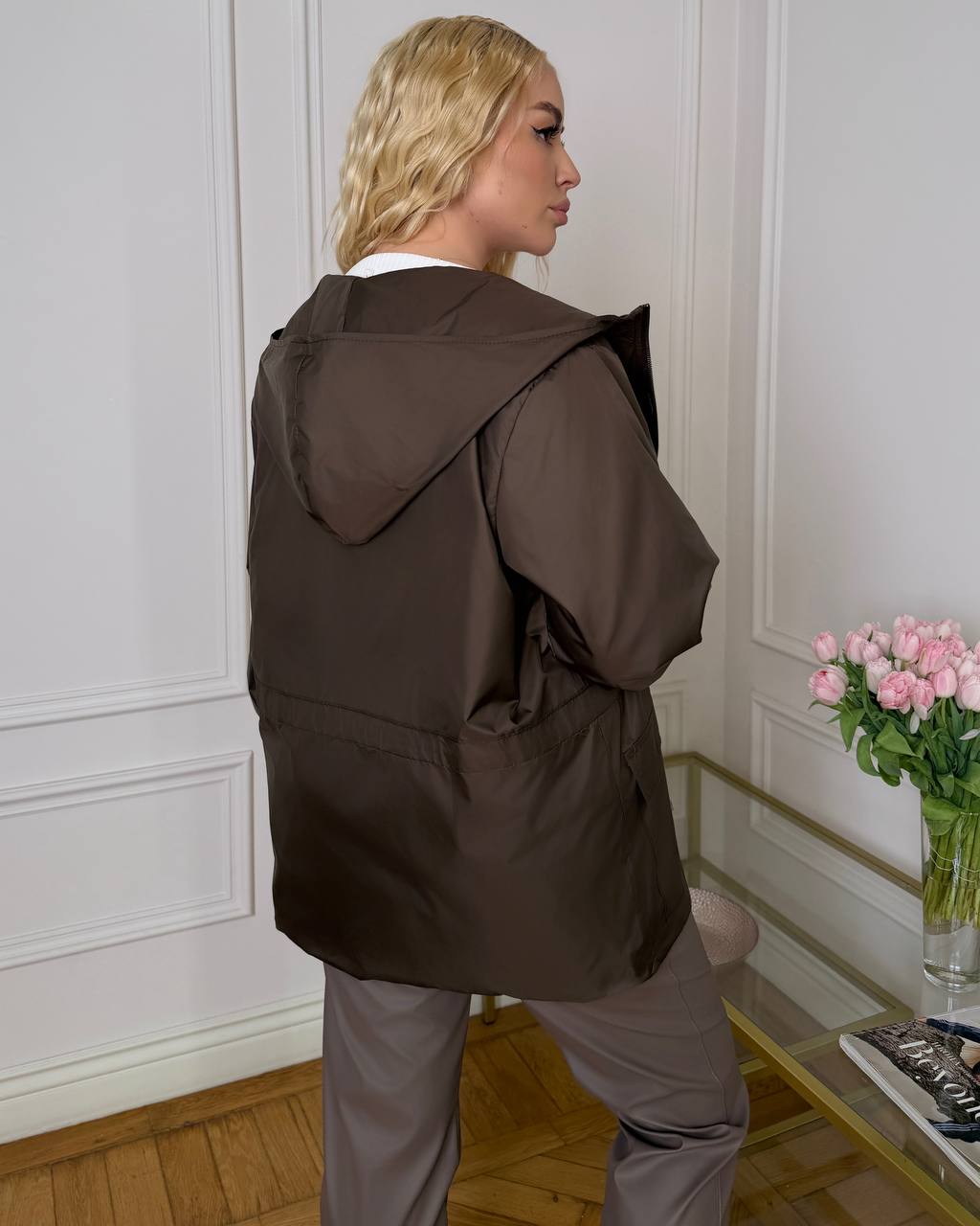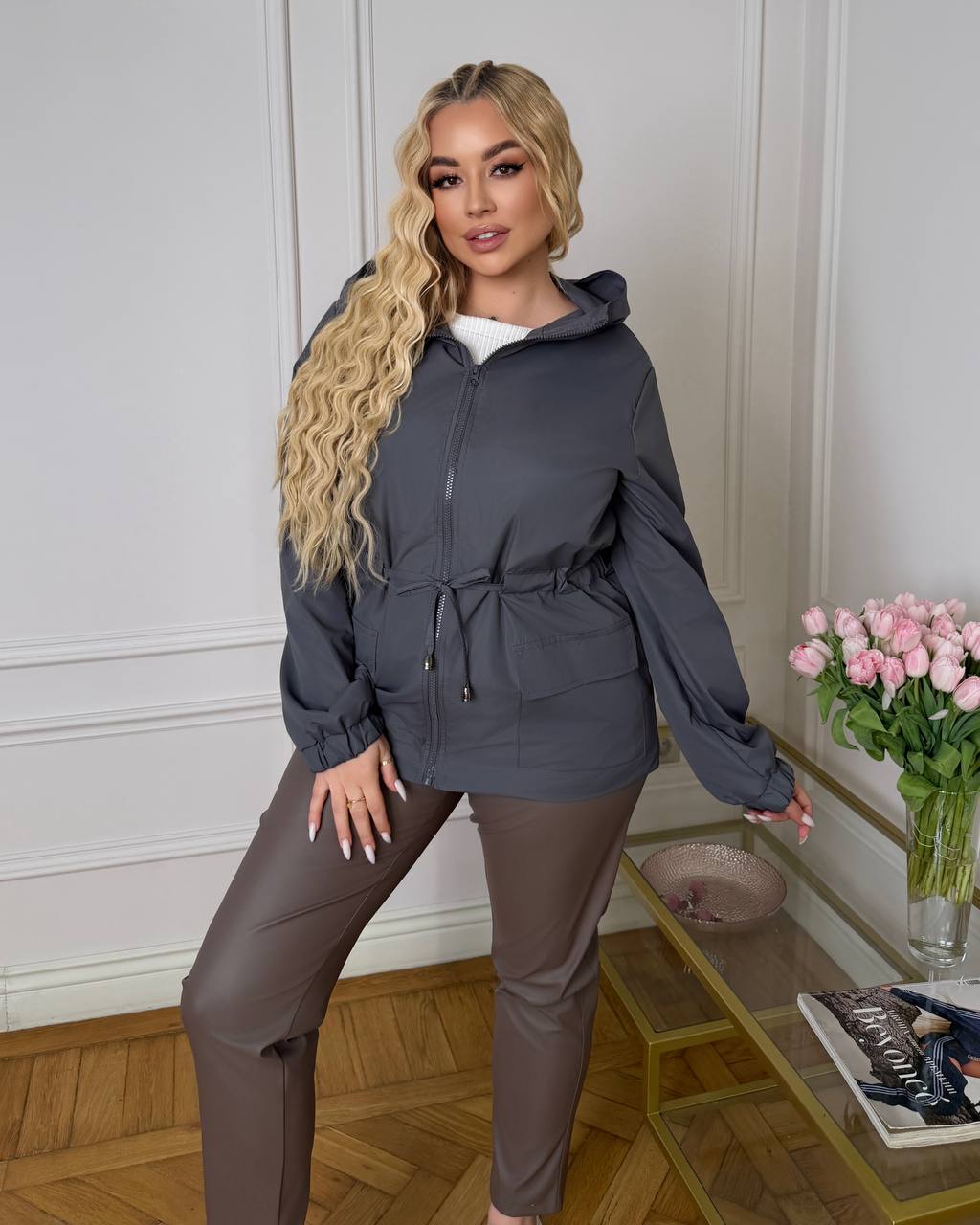Подовжена вітровка з капюшоном на підкладці. Призначена для захисту від вітру та дрібного дощу в деміісезнну погоду. Застібка на блискавці , накладні кишені з клапаном, резинка по низу рукава, куліска по талії для регулювання.