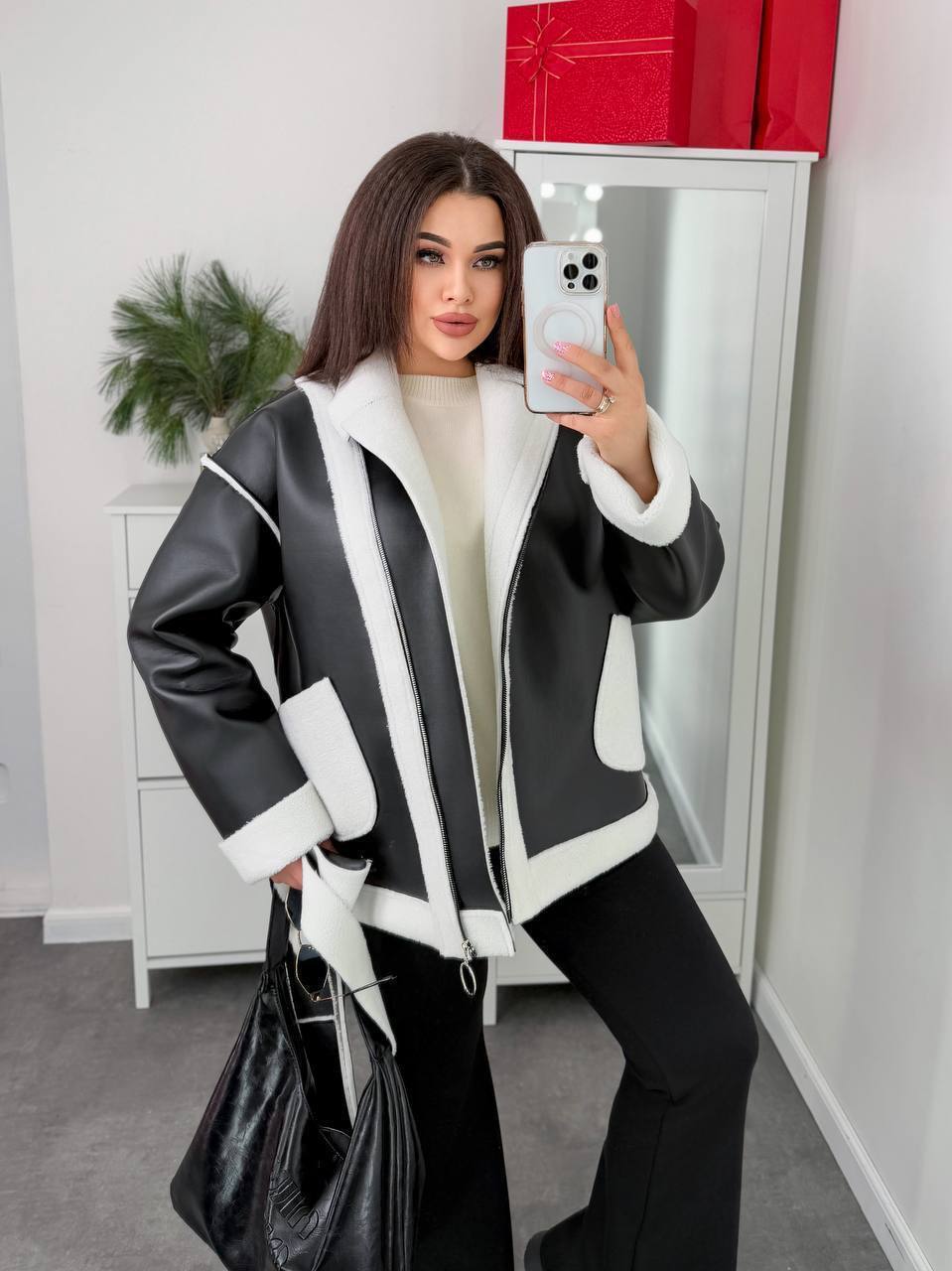 Модель застібається на блискавку. Додається Пояс , за допомогою якого можна утворювати різні образи. Виготовлена з дублянки: экокожа Гарної якості, штучне хутро. Рукава з підворотами , якими. регулюється довжина від 70-55 см (від плеча). Довжина вибробу 75 см