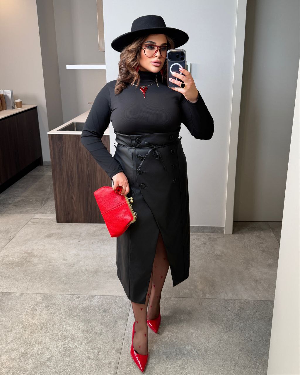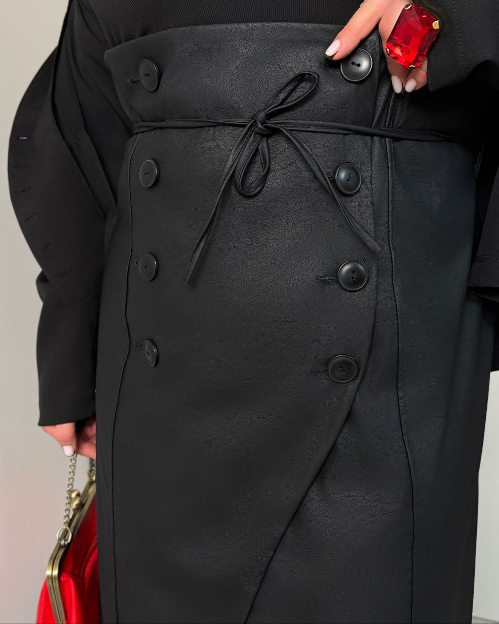 Модель №797. Спідниця. Шкіряна спідниця на запах, із завищеною талією, застібка функціональні ґудзики, також є шлевки під пояс, поясок у комплекті. Тканина розтягується. Тканина Еко шкіра. Колір: Чорний. Розміри: 50-52, 54-56, 58-60