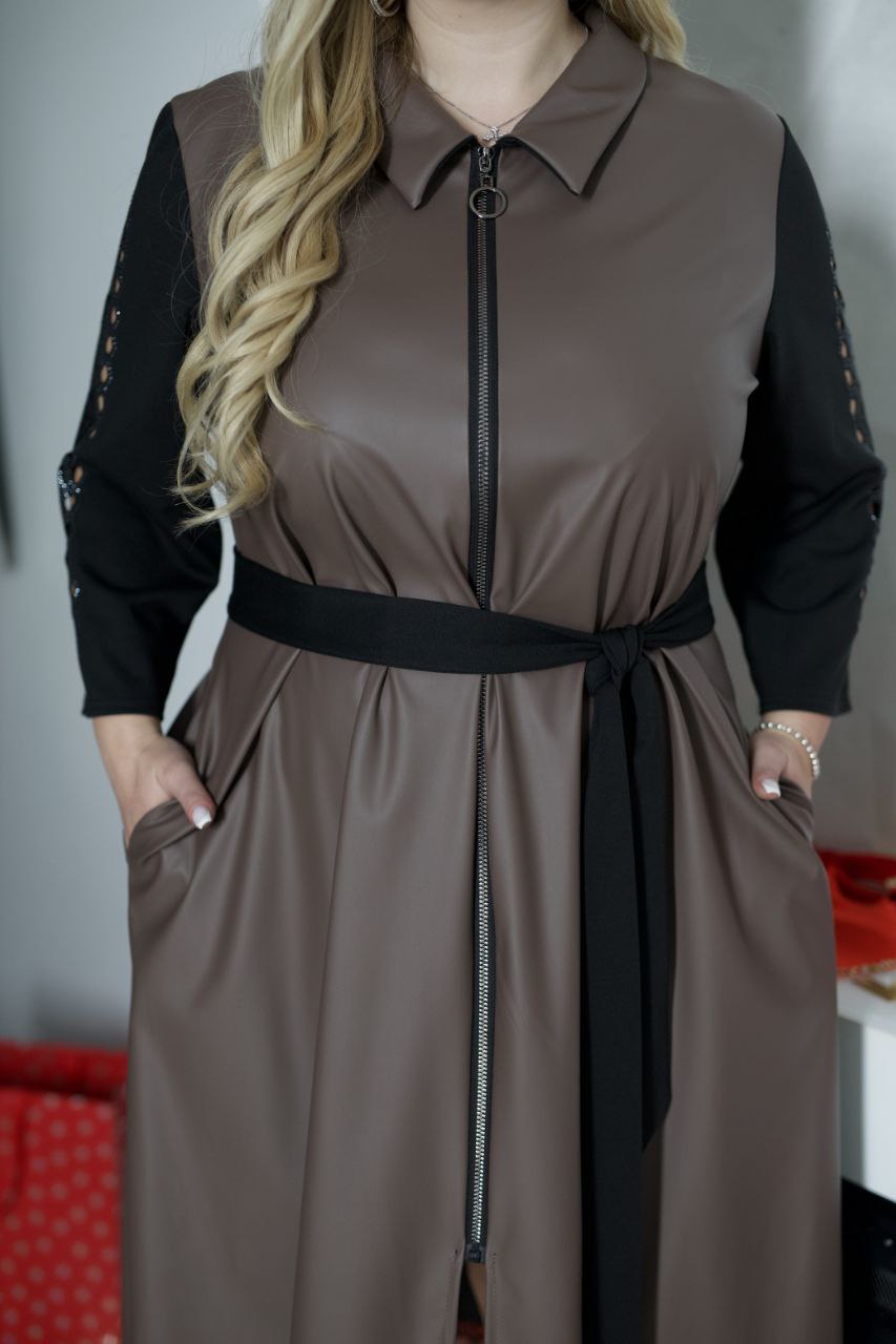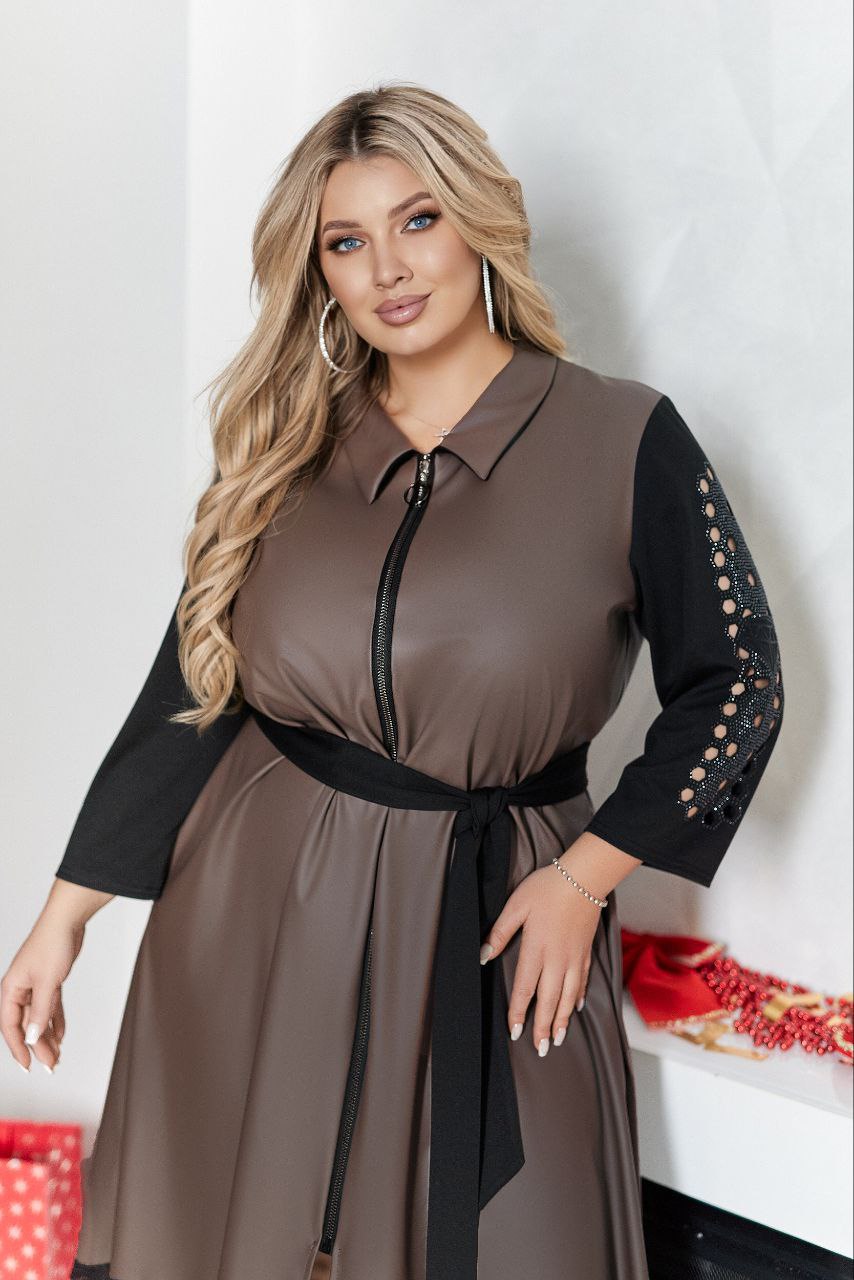 Еко шкіра гарної якості + рукава та пояс з Італійського трикотажу + лазерна різка по тканині + стрази DMS + мереживо по низу сукні.