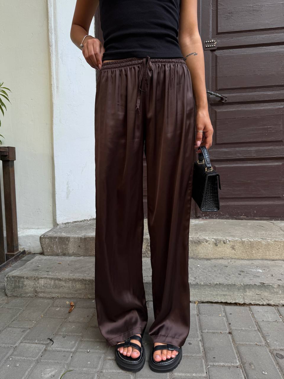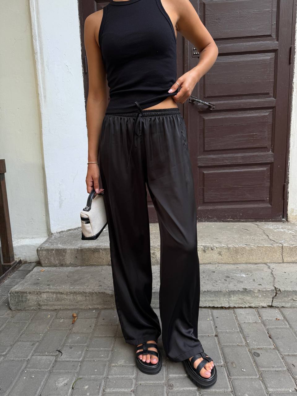 Вільний крій брюк додає невимушеності, а пояс на резинці з зав’язками забезпечує комфортну посадку.