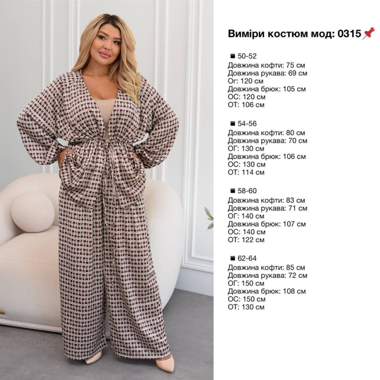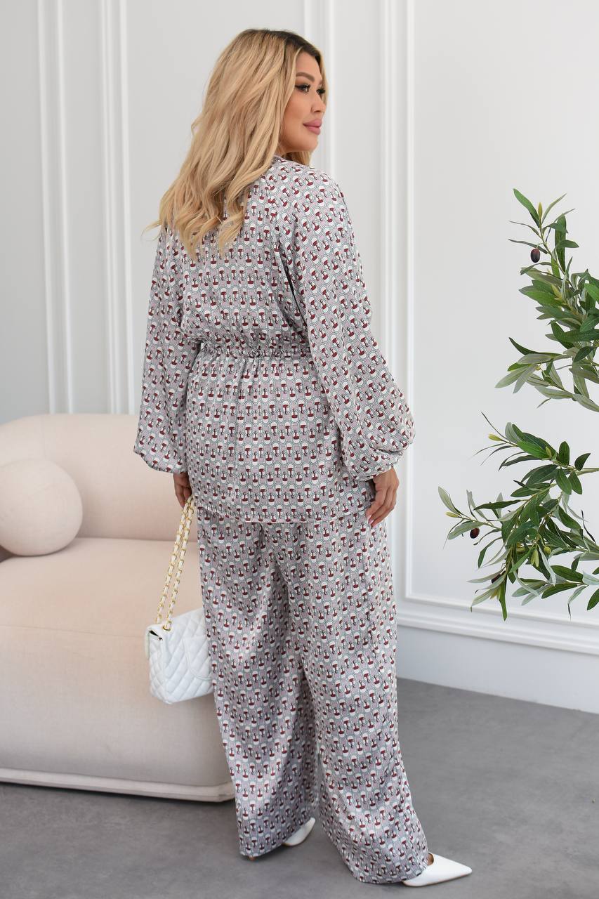 Верх має V-подібний виріз і фіксується на талії за допомогою куліски, що дозволяє регулювати об’єм і красиво підкреслює силует. Рукави об’ємні, з м’якими зборами на манжетах, додають легкості образу. Штани — широкі, вільного крою, що забезпечує комфорт і свободу рухів.