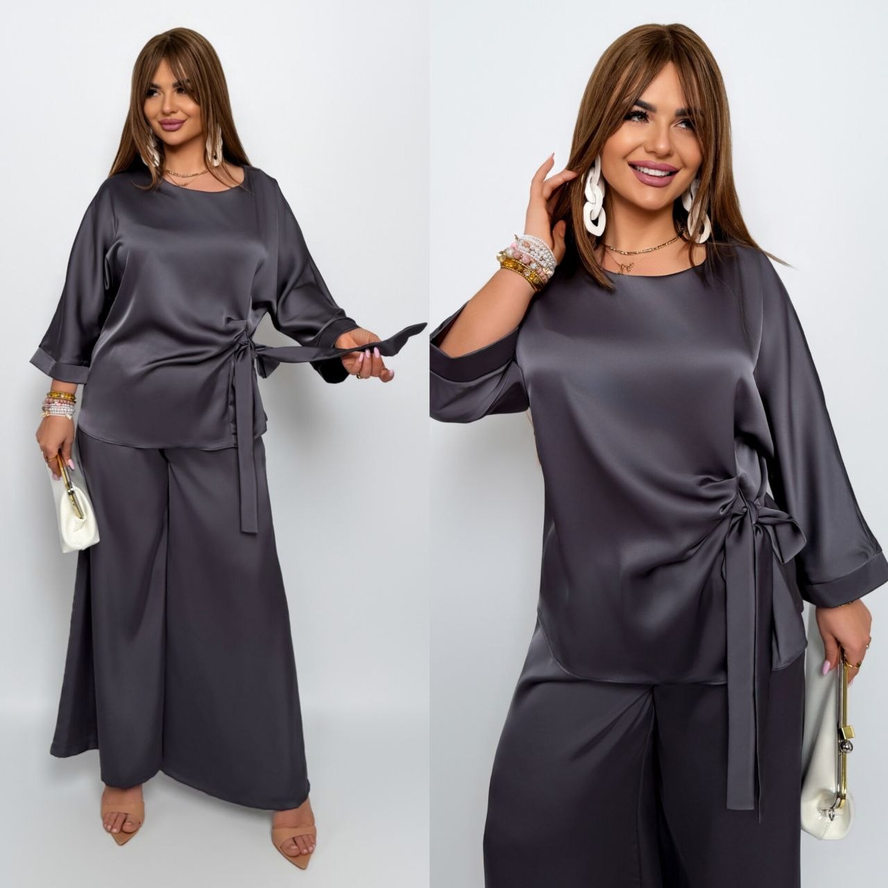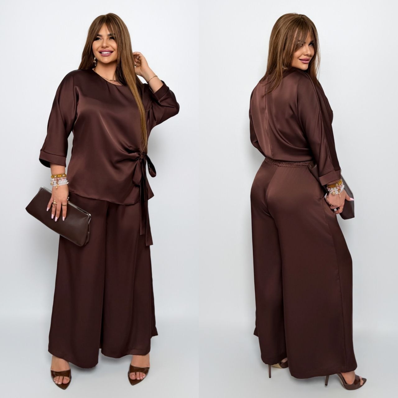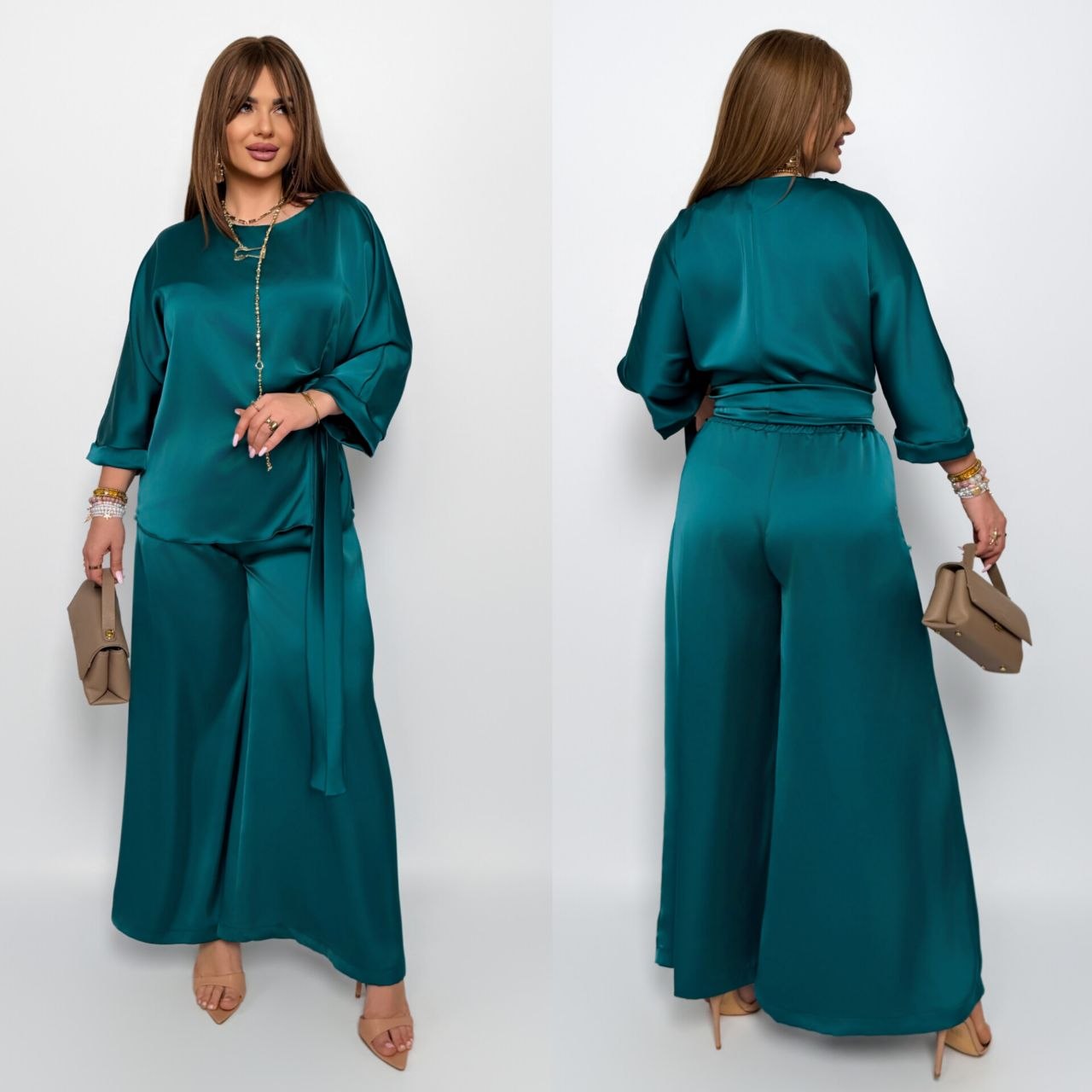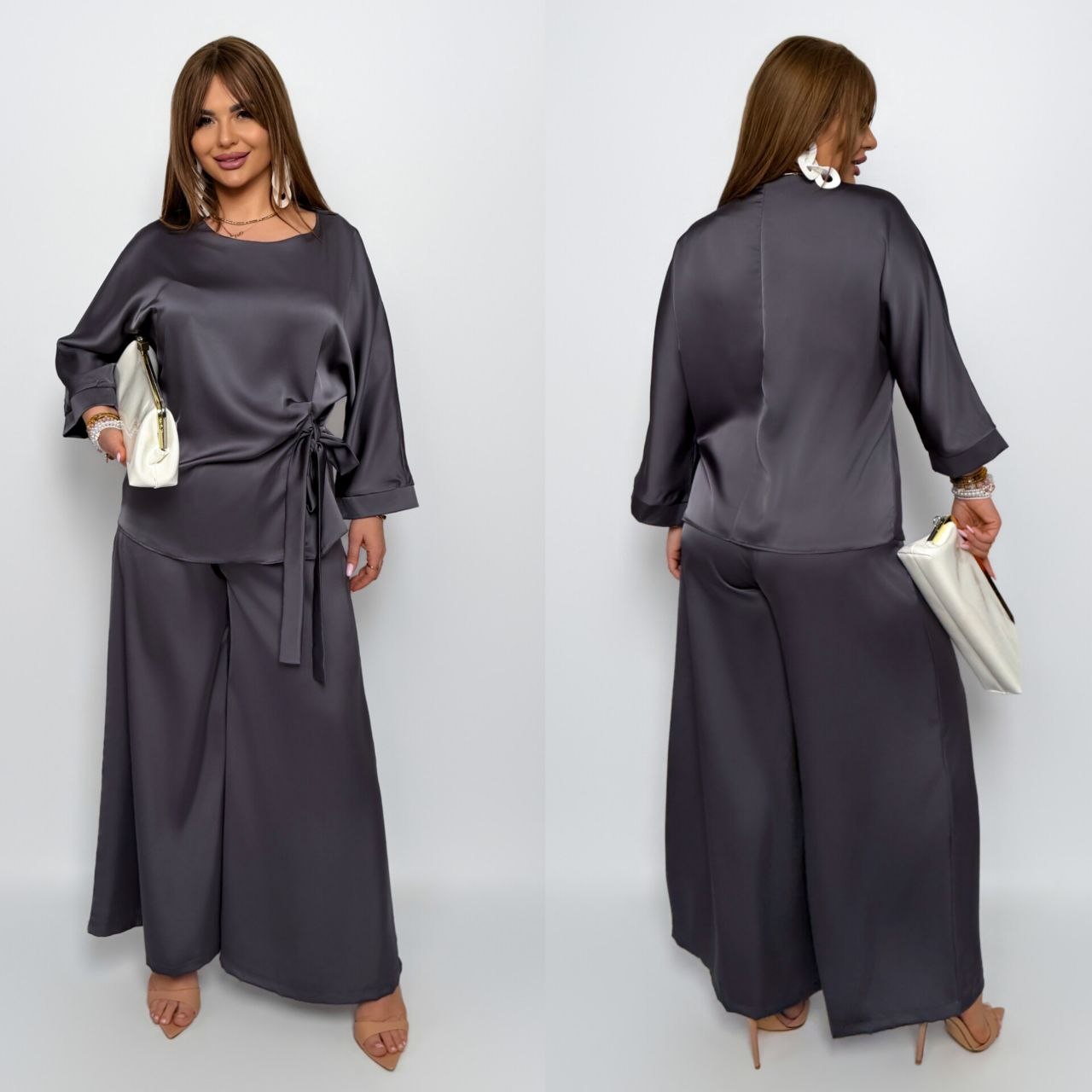 Комфортний, універсальний і дуже ефектний костюм, як для повсякденного образу, так і для особливих подій. Блуза з асиметричною зав’язкою формує красивий силует, а широкі брюки створюють ефект витягнутої фігури, пояс на резинці.Тканина м’яко лягає по фігурі, виглядає дорого та комфортна у носінні.