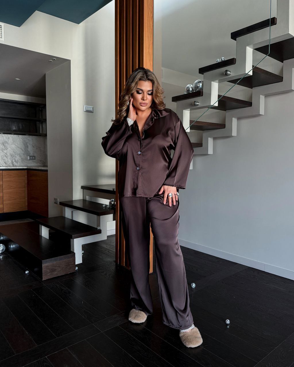 Модель №765. Комплект домашнього одягу. Сорочка + штани. Сорочка з планкою на гудзиках, штани на резинці. Склад: Поліестер – 95%, Бавовна – 5%. Тканина Армані шовк. Колір: Шоколад, Бісквіт, Чорний. . Розміри: 50-52, 54-56, 58-60.