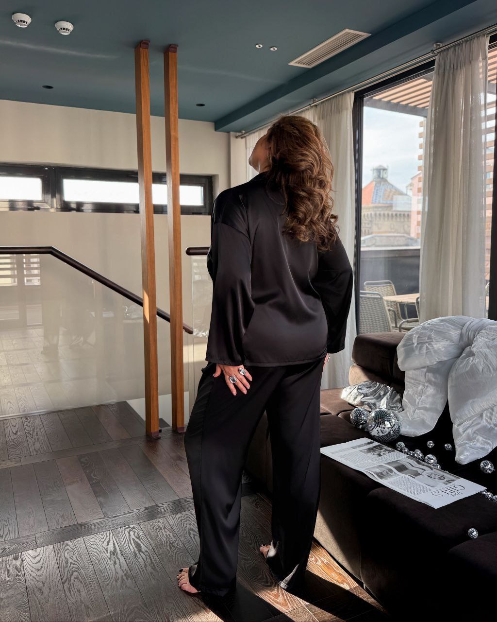 54-56 Об’єм грудей – 120 см, Довжина сорочка – 70 см, Довжина рукава – 56 см, Об’єм талії (довжина гумки) – 86 см (розтягується до 126 см), Об’єм стегон – 126 см, Довжина штанів – 109 см