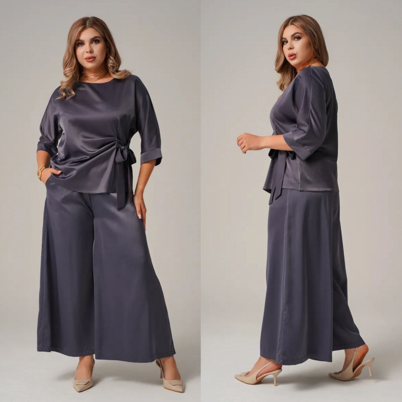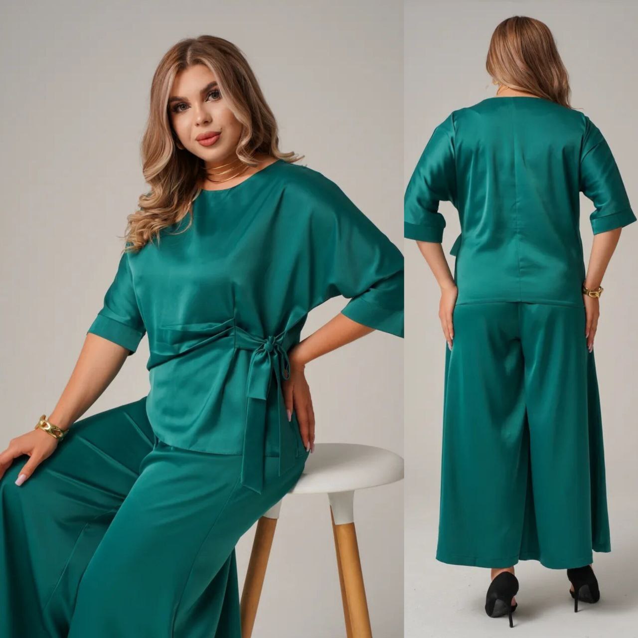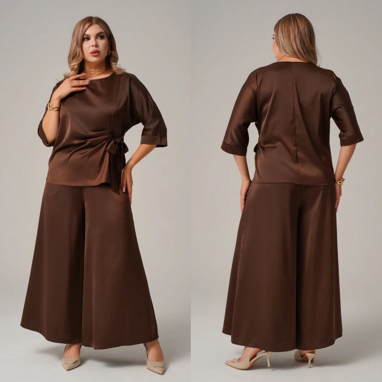 Комфортний, універсальний і дуже ефектний костюм, як для повсякденного образу, так і для особливих подій. Блуза з асиметричною зав’язкою формує красивий силует, а широкі брюки створюють ефект витягнутої фігури, пояс на резинці.Тканина м’яко лягає по фігурі, виглядає дорого та комфортна у носінні.