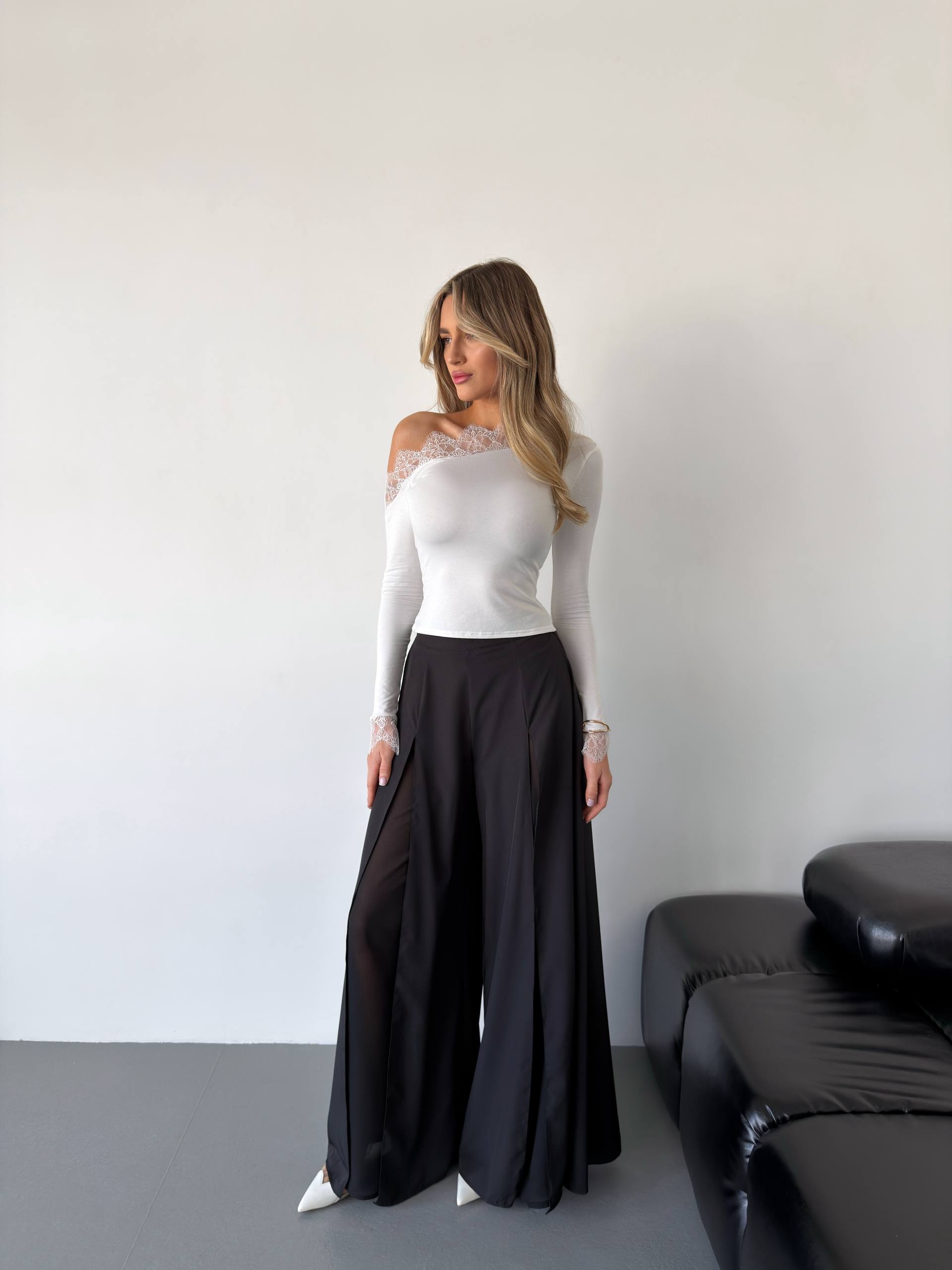 Елегантні та жіночні брюки, які ідеально підкреслюють фігуру та додають образу легкості. Завдяки вільному крою брюки виглядають стильно й витончено, підходять як для святкових подій, так і для стильних повсякденних образів.