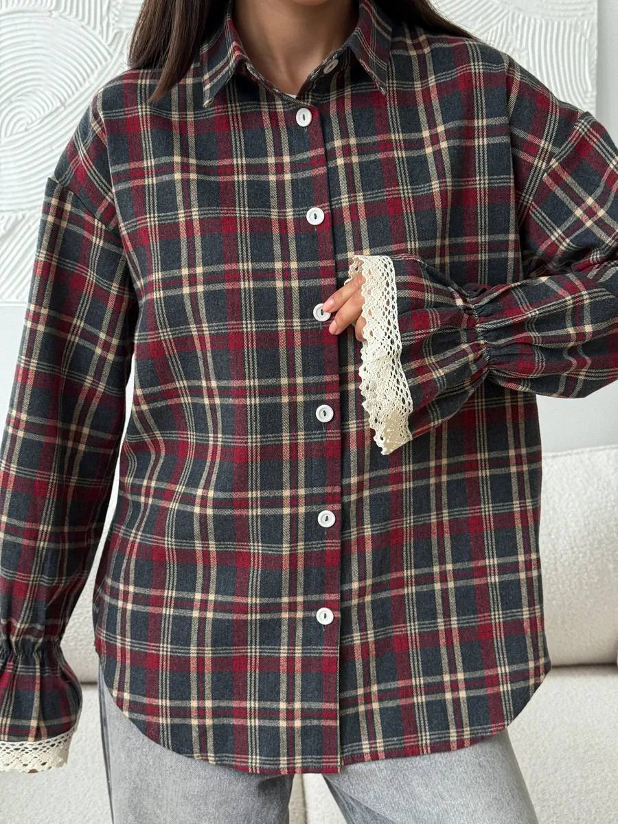 Стильна клітинка у поєднанні з ніжним мереживом створює ідеальний баланс між трендовістю та жіночністю Вільний крій дарує комфорт, а акцентні деталі на манжетах і спинці роблять образ особливим✨