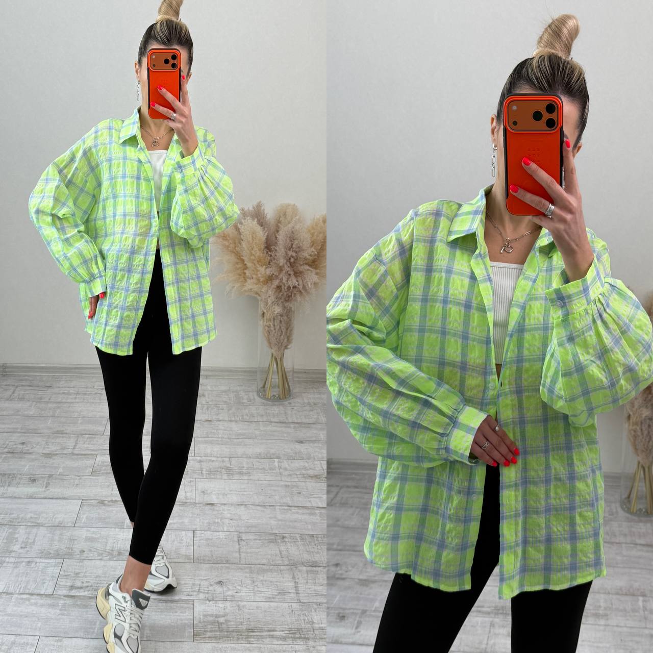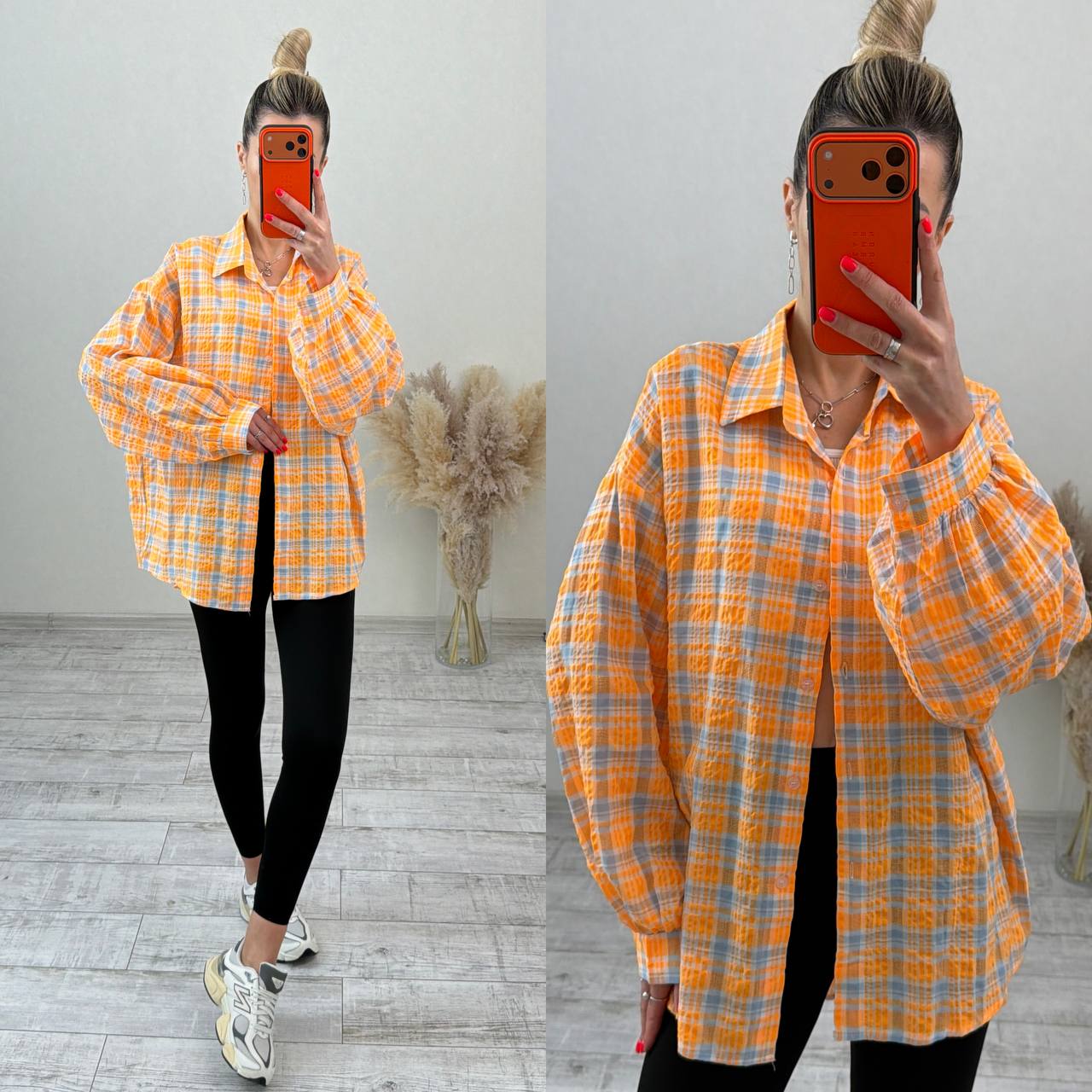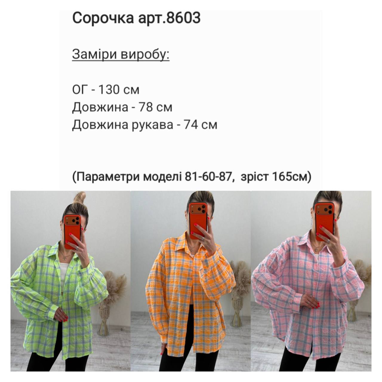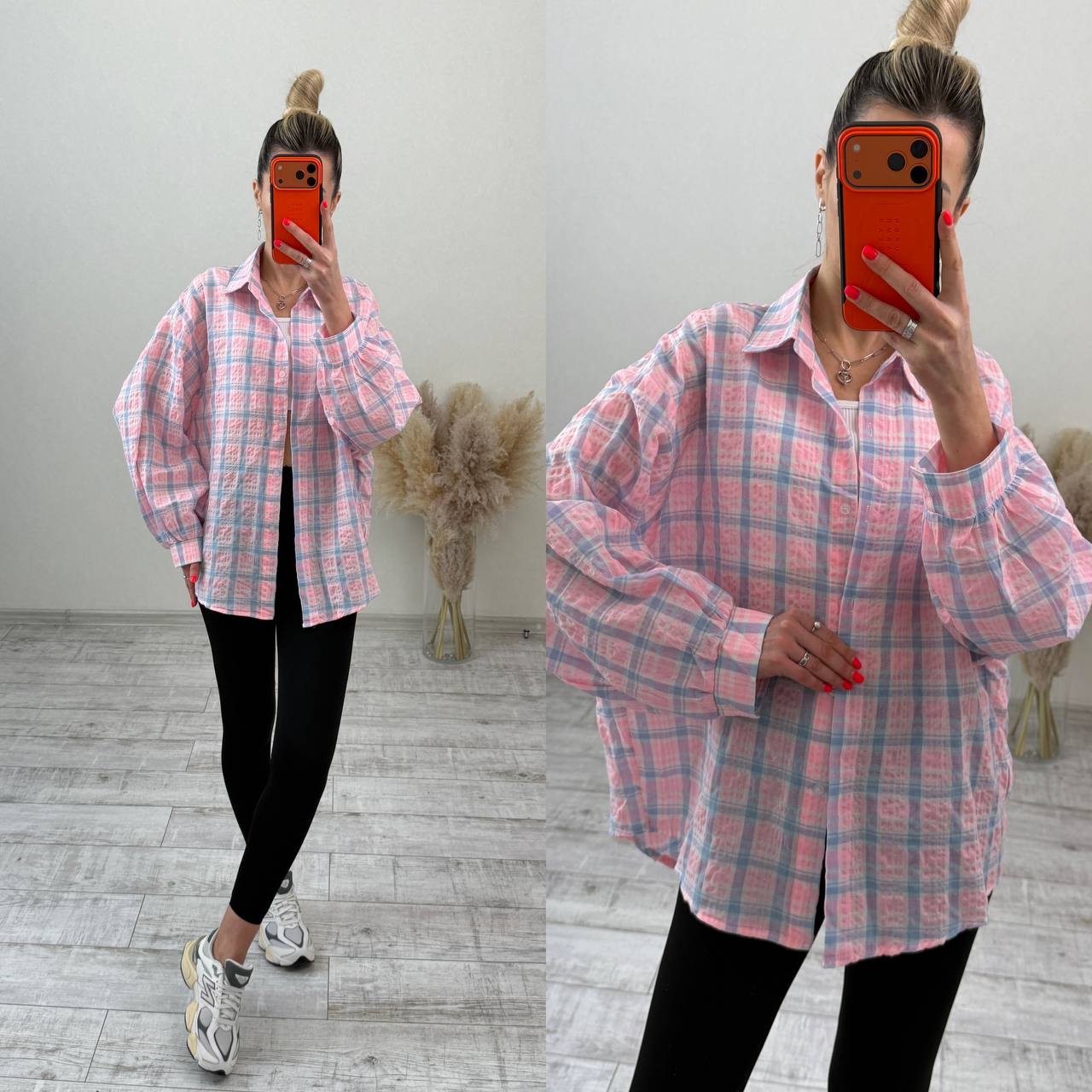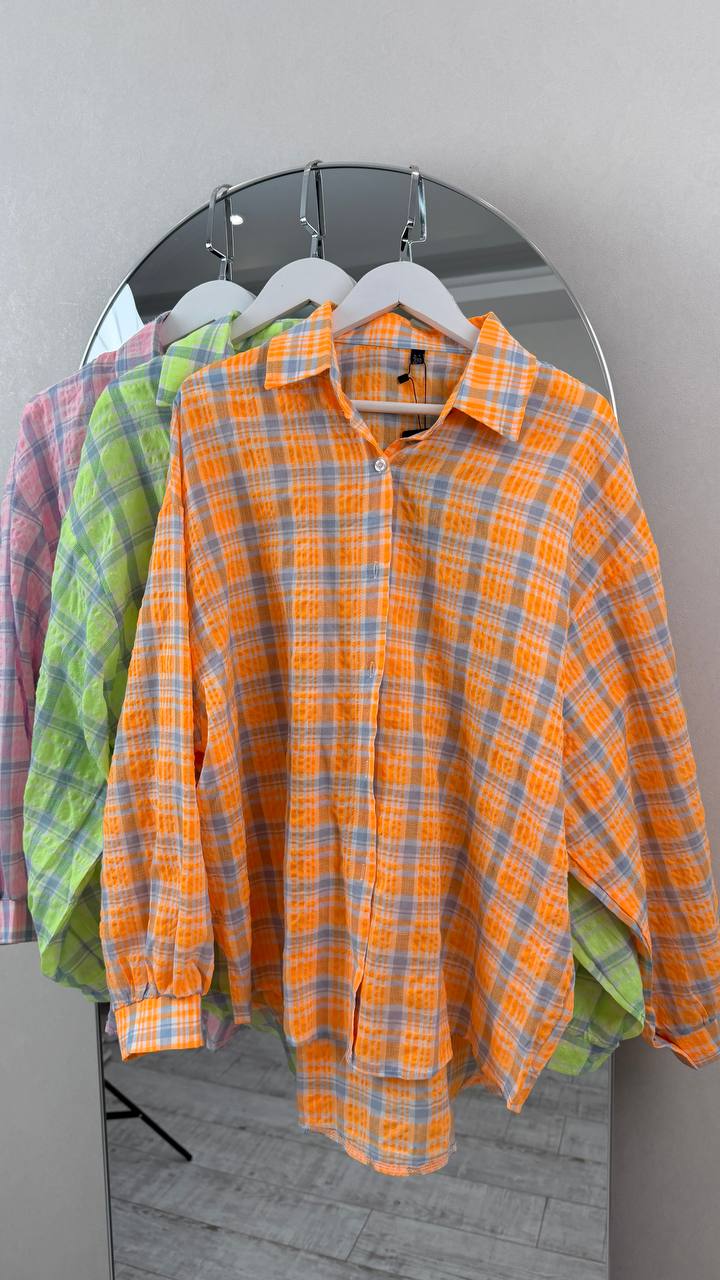 Стильна сорочка oversize з легкої, дихаючої тканини. Вільний крій забезпечує комфорт та гарно сідає на будь-яку фігуру. Ідеально поєднується з легінсами або джинсами.