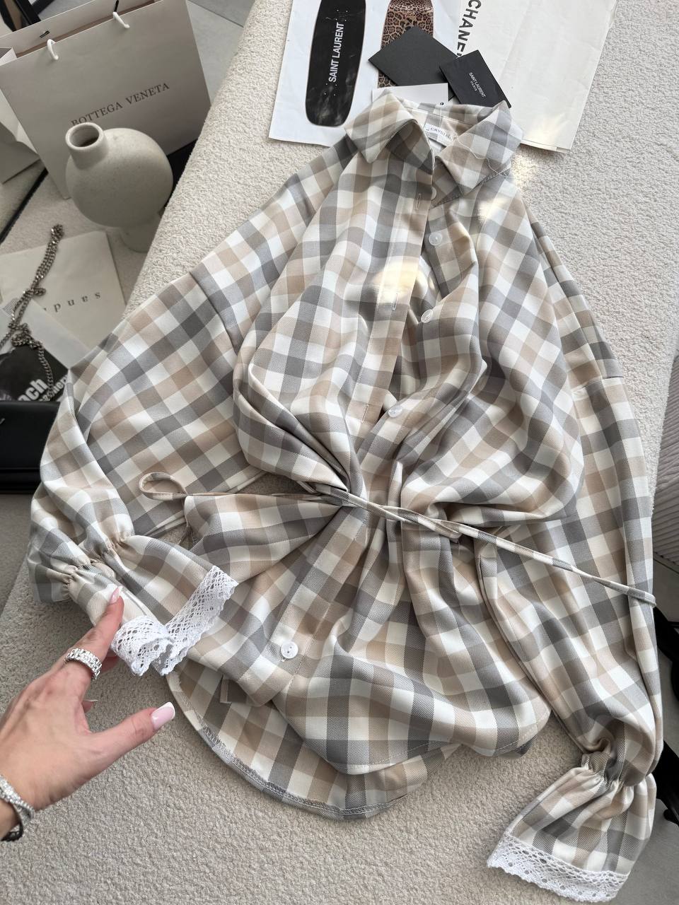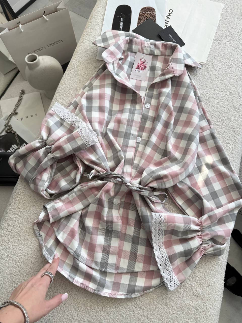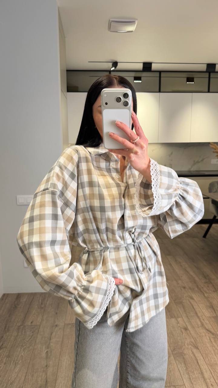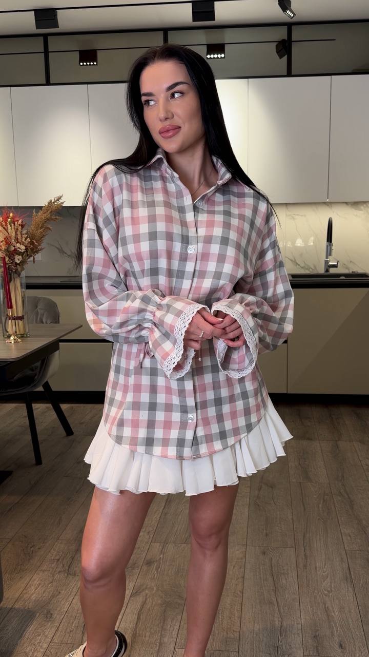 Сорочка, в яку закохуєшся з першого погляду Стильна клітинка у ніжних відтінках створює легкий, повітряний образ, а мереживні вставки на рукавах додають жіночності ✨