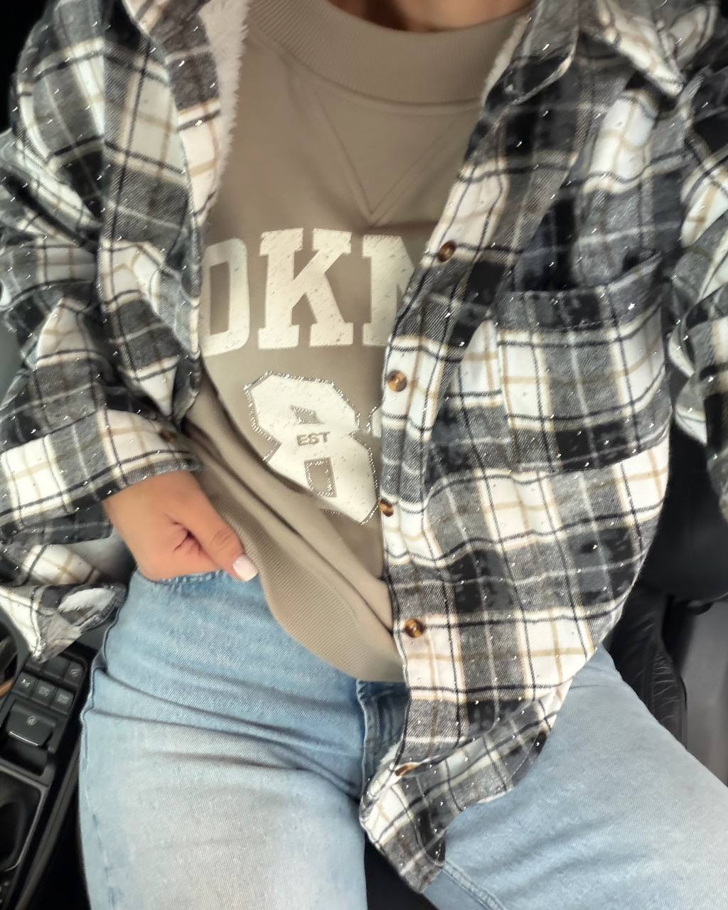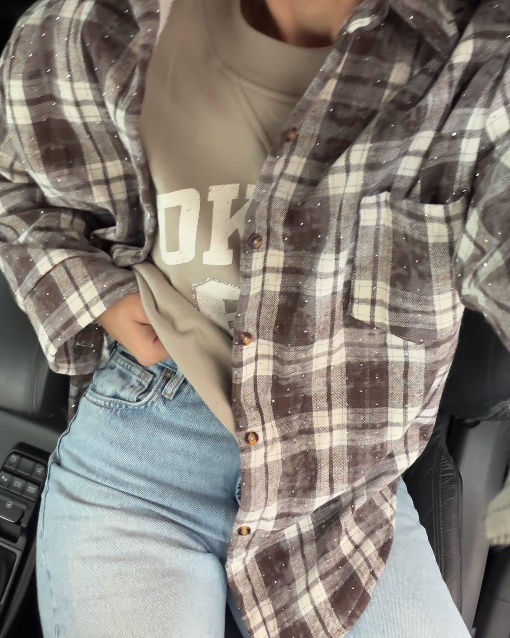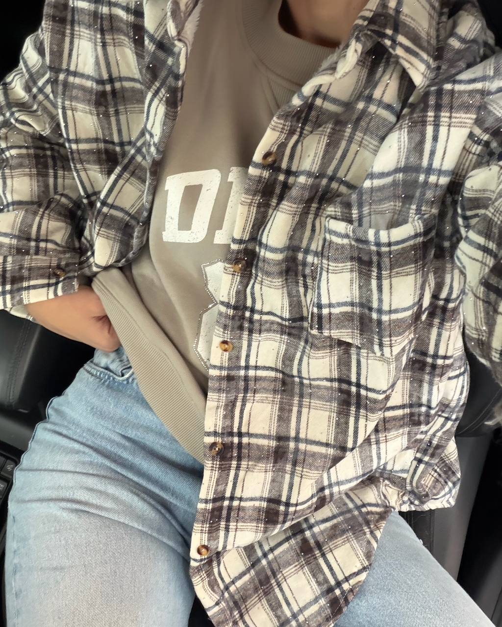 Стильна сорочка, прикрашена стразами — тепла, м’яка та комфортна. Ідеально підходить для холодної пори року, додає образу затишку й елегантності.