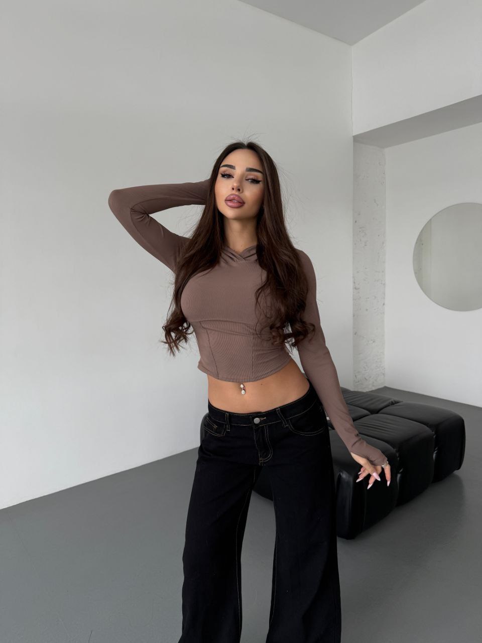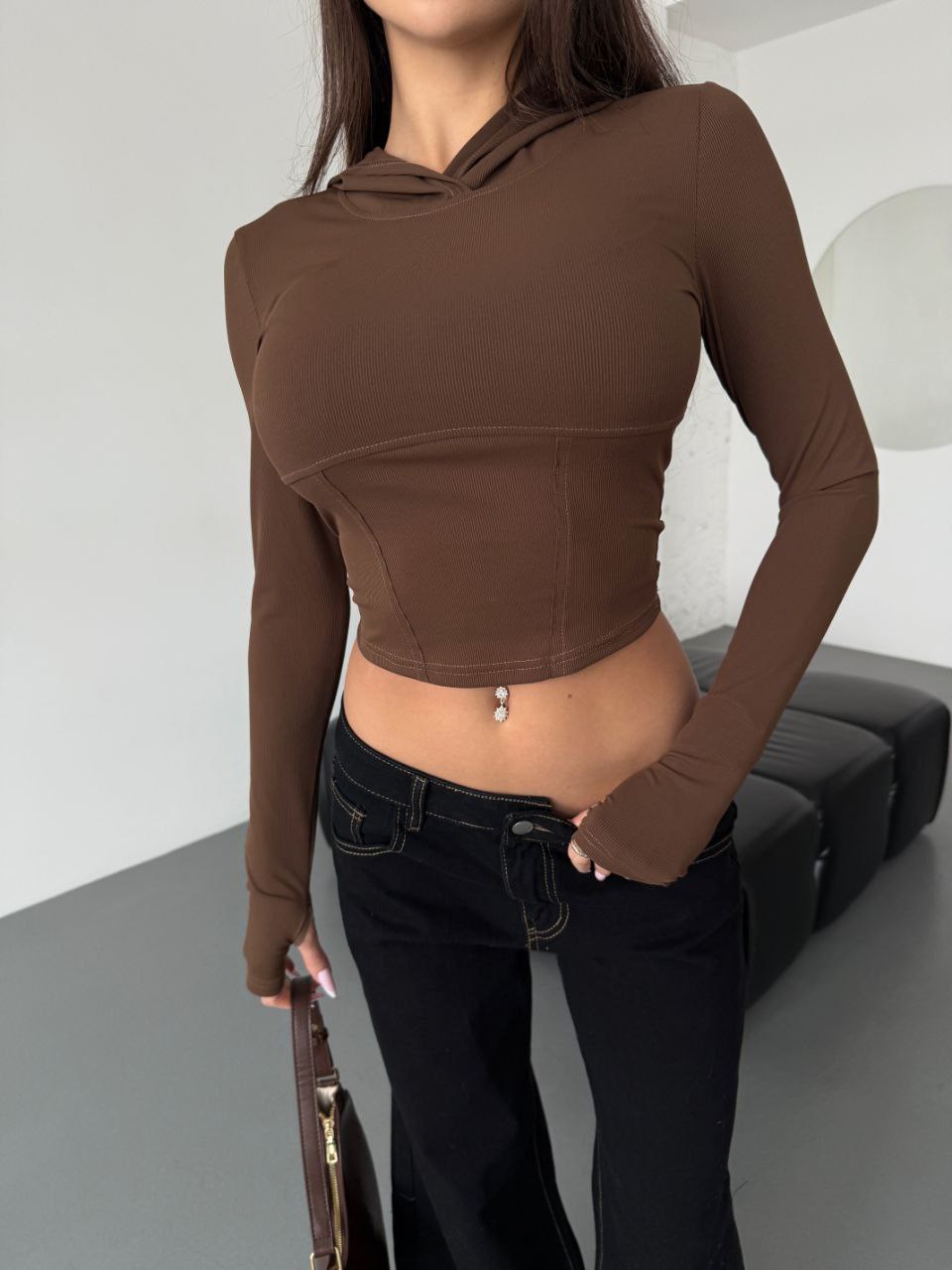 Облягаючий крій красиво підкреслює фігуру, м’яка еластична тканина приємна до тіла та ідеально сідає. Подовжені рукави з отворами для пальців додають комфорту й трендового вигляду