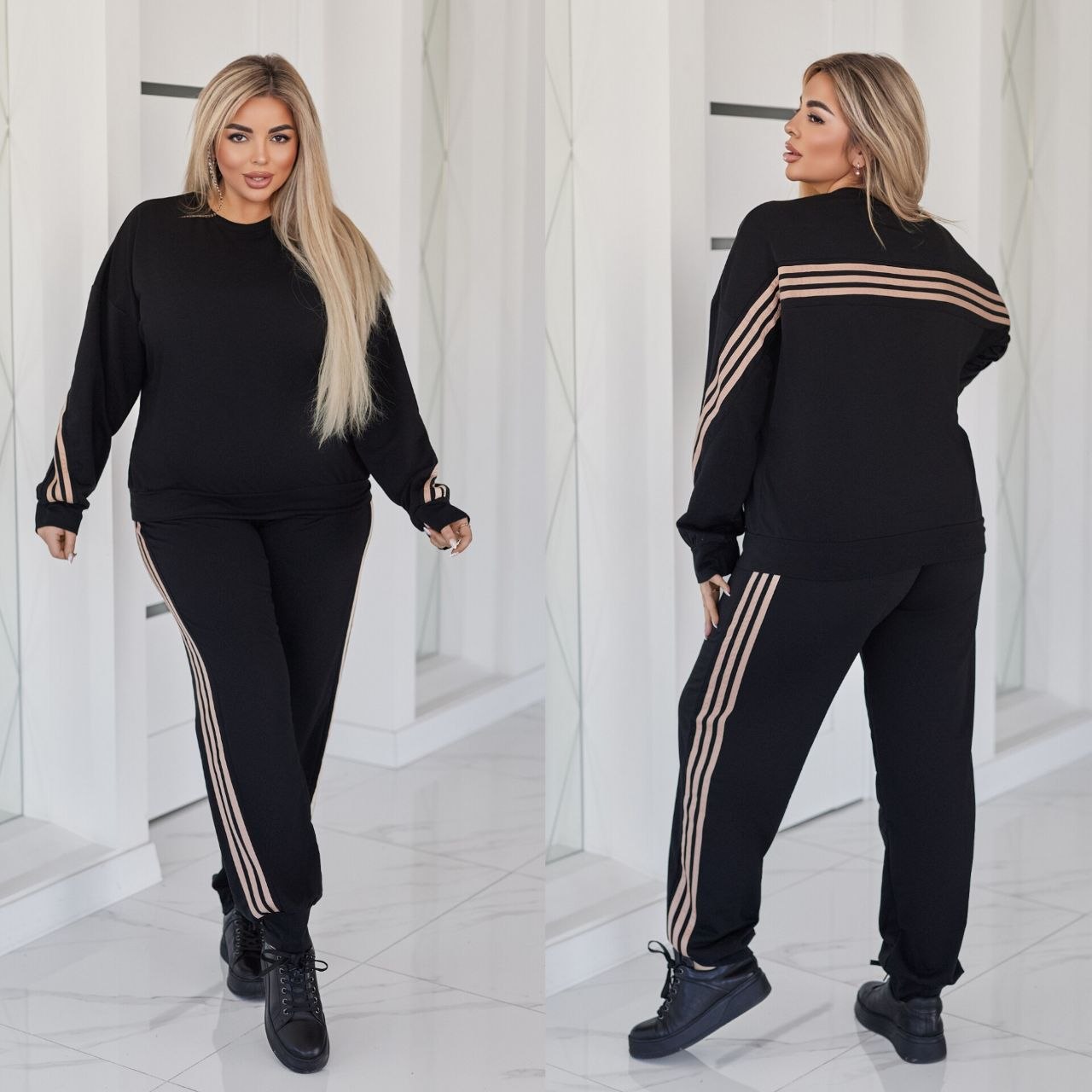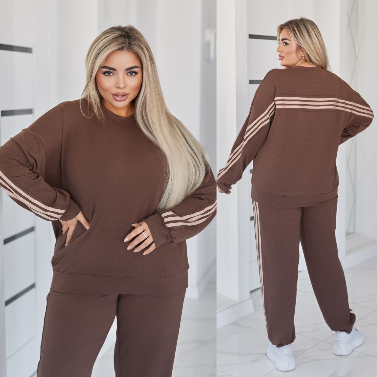 Стильний прогулянковий костюм, штани на високій посадці, кругова резинка, манжети. Кофтинка вільного крою, декорована стильними лампасами. Костюм виготовлений с двунитки, гарна розтяжність.